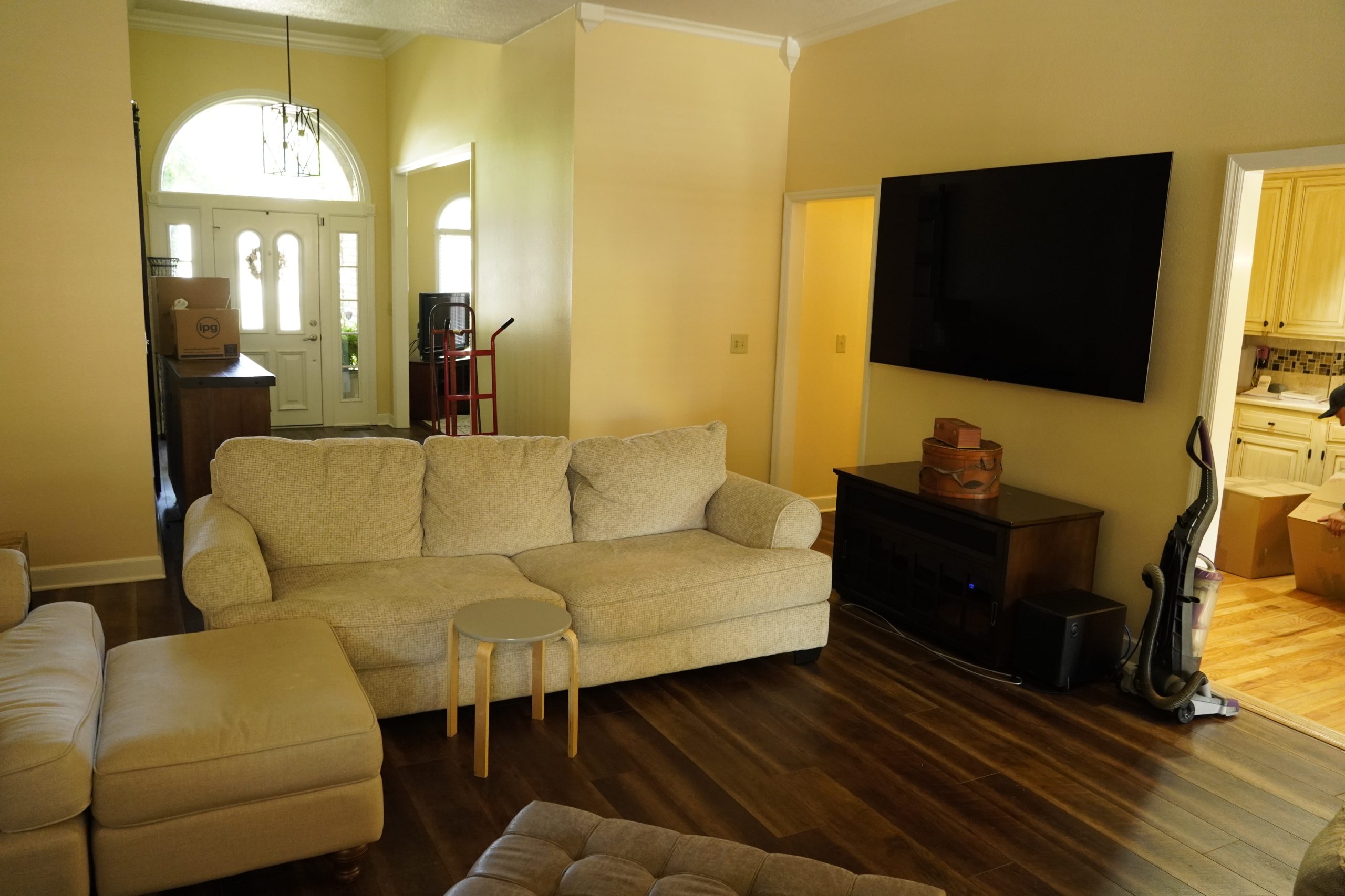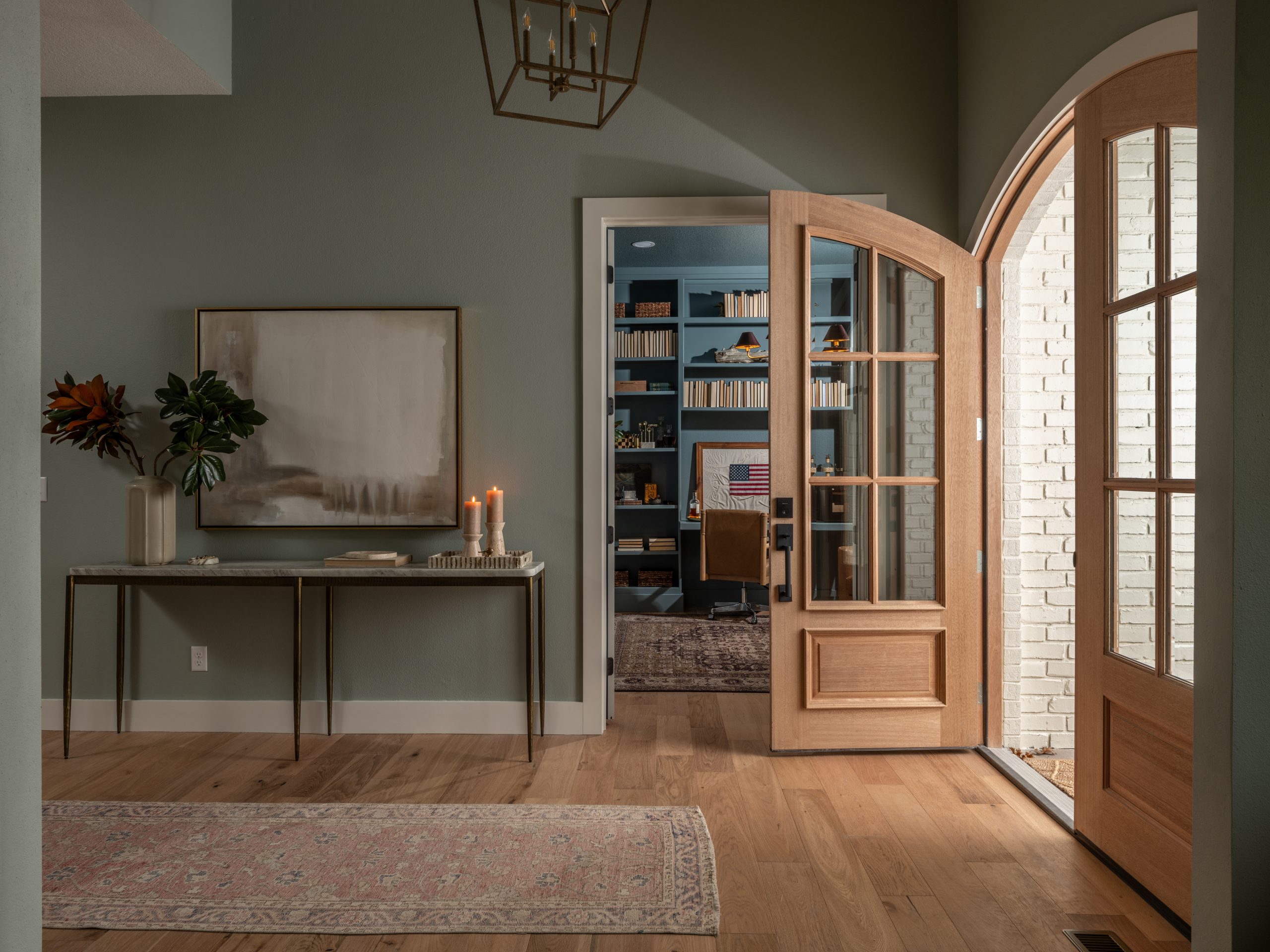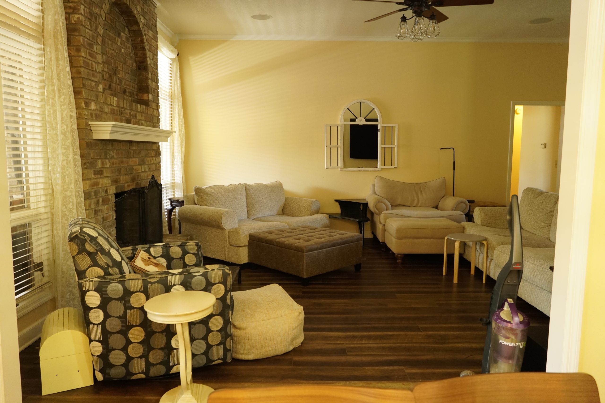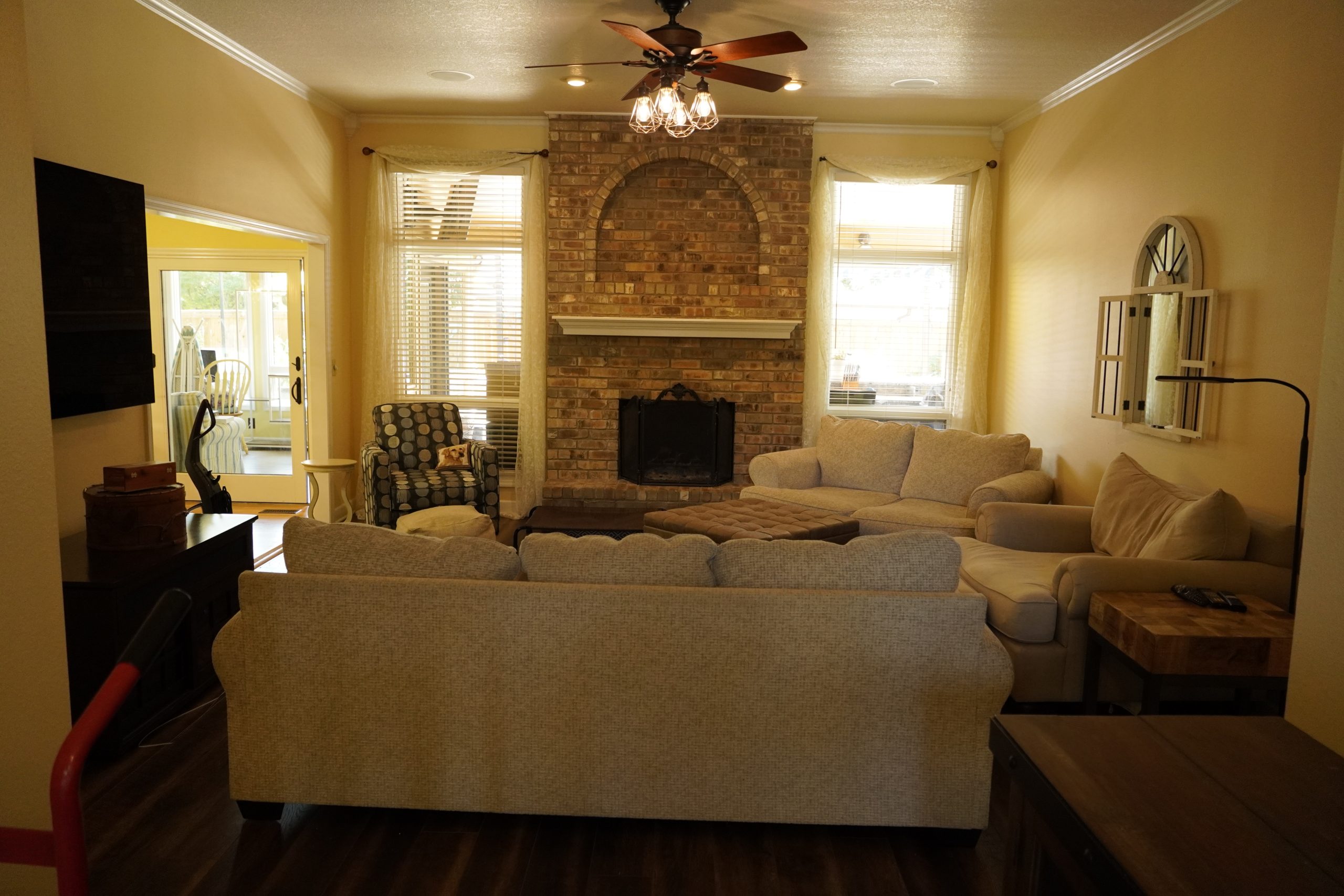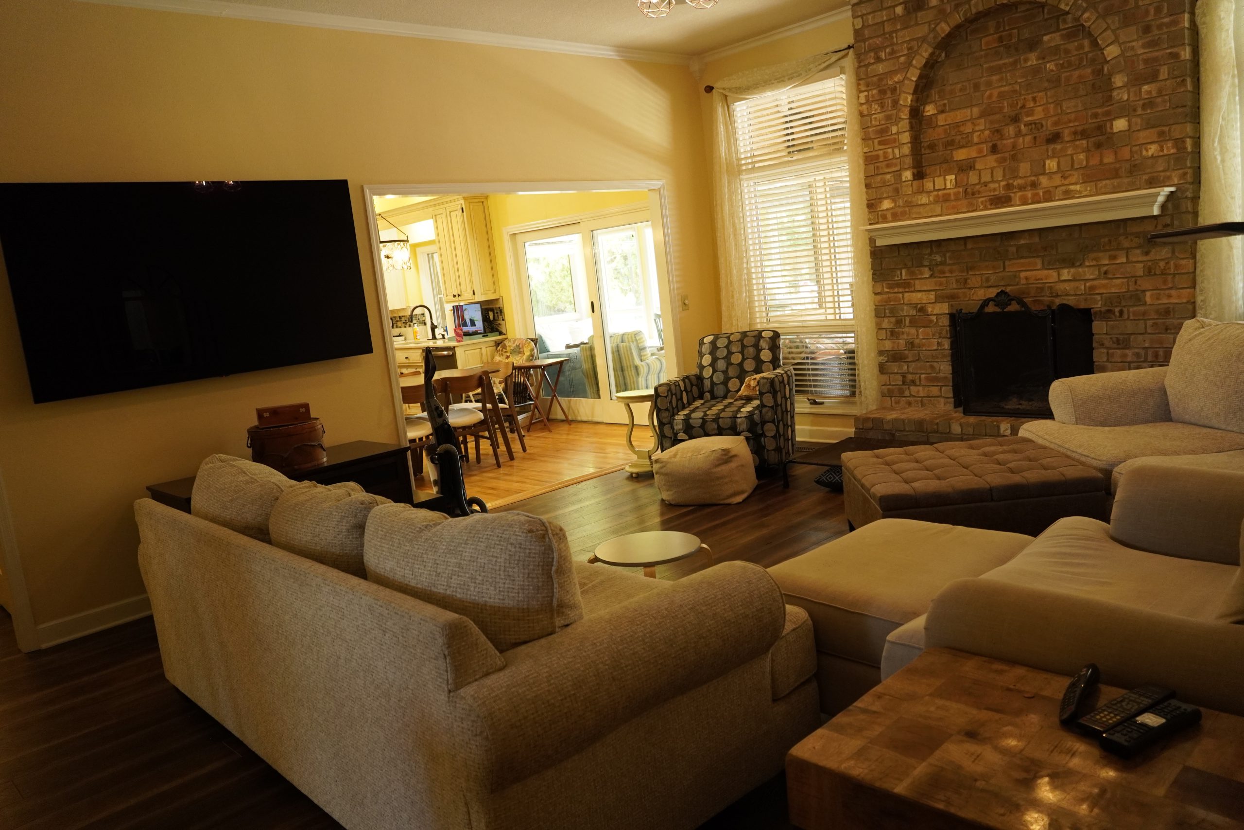 Two focal points were competing with each other in this room, and the flooring didn’t match the rest of the house. To resolve this, we moved the TV to the opposite wall and established that side of the room as the new focal point. We added a built-in cabinet with a brick arch, which brings texture and architectural interest to the space.