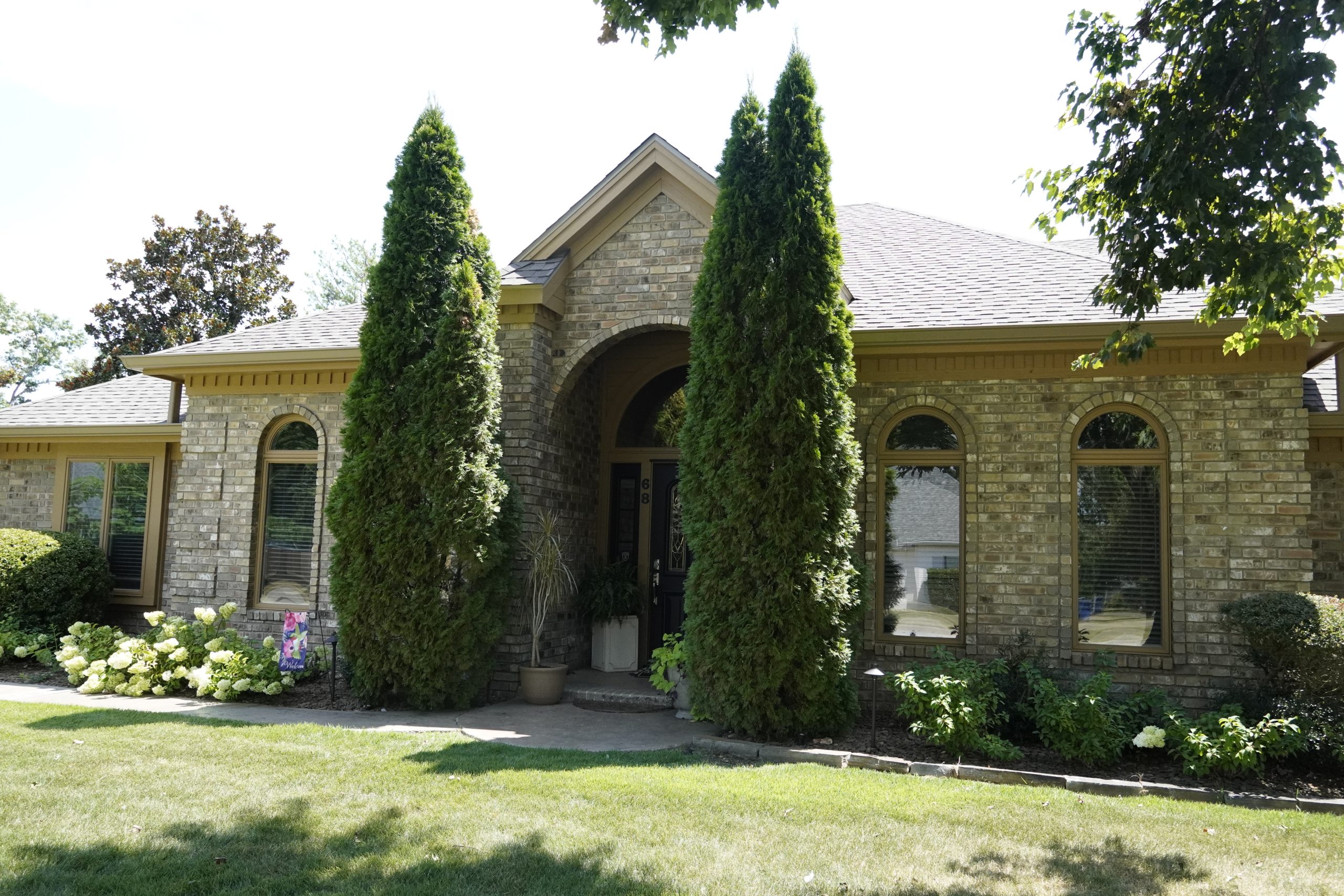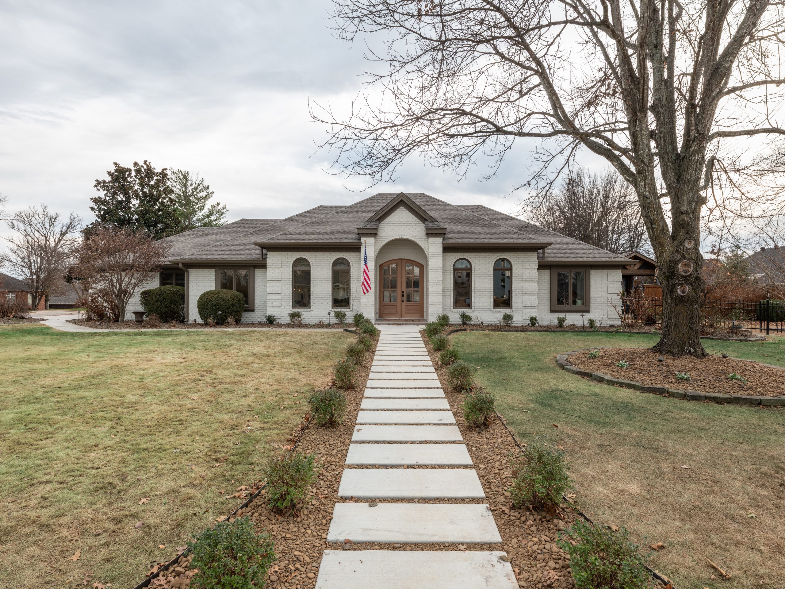 The house was in good shape on the outside and didn’t need any major repairs or reconstruction. It just needed a few impactful changes to feel more welcoming. At the Lundeens’ request, we removed two overgrown pine trees that were hiding the front entrance and installed a walkway from the street to the front door. Those two updates made a huge difference in curb appeal. Then we painted the old tan-colored trim a soft mushroom taupe and the brick an off-white to brighten everything up. The new natural wood front door adds warmth and character against the modern updates.