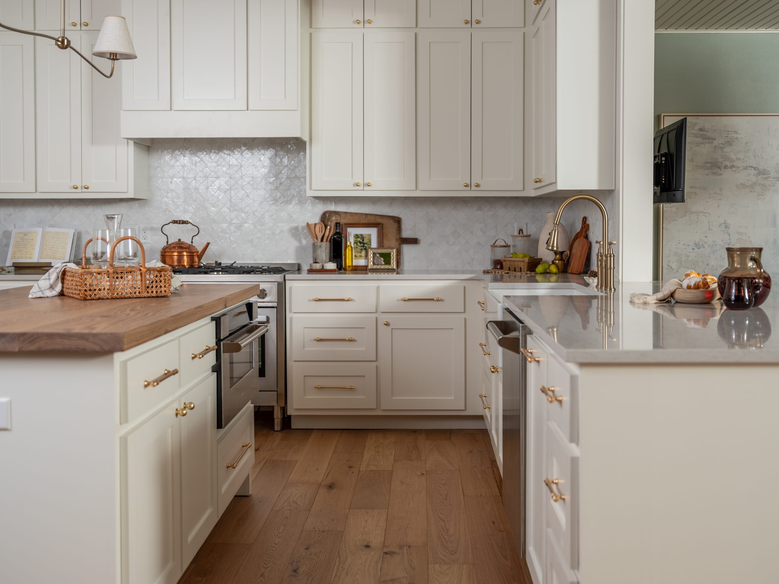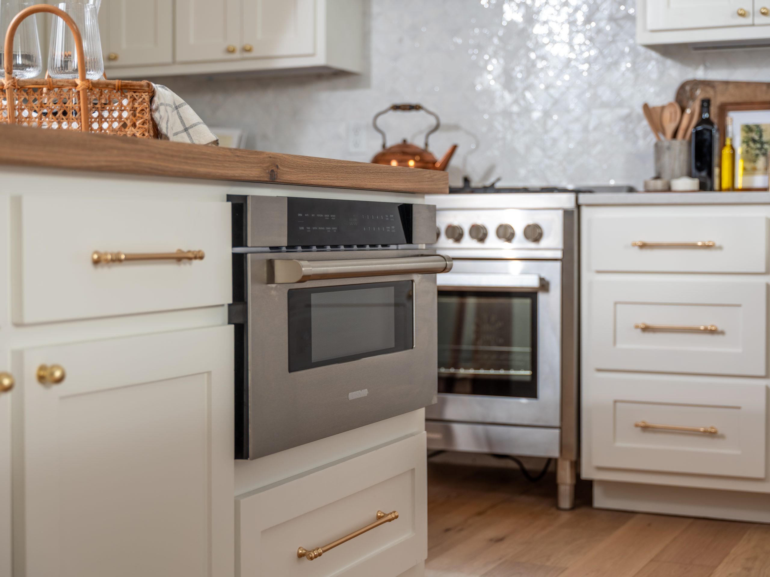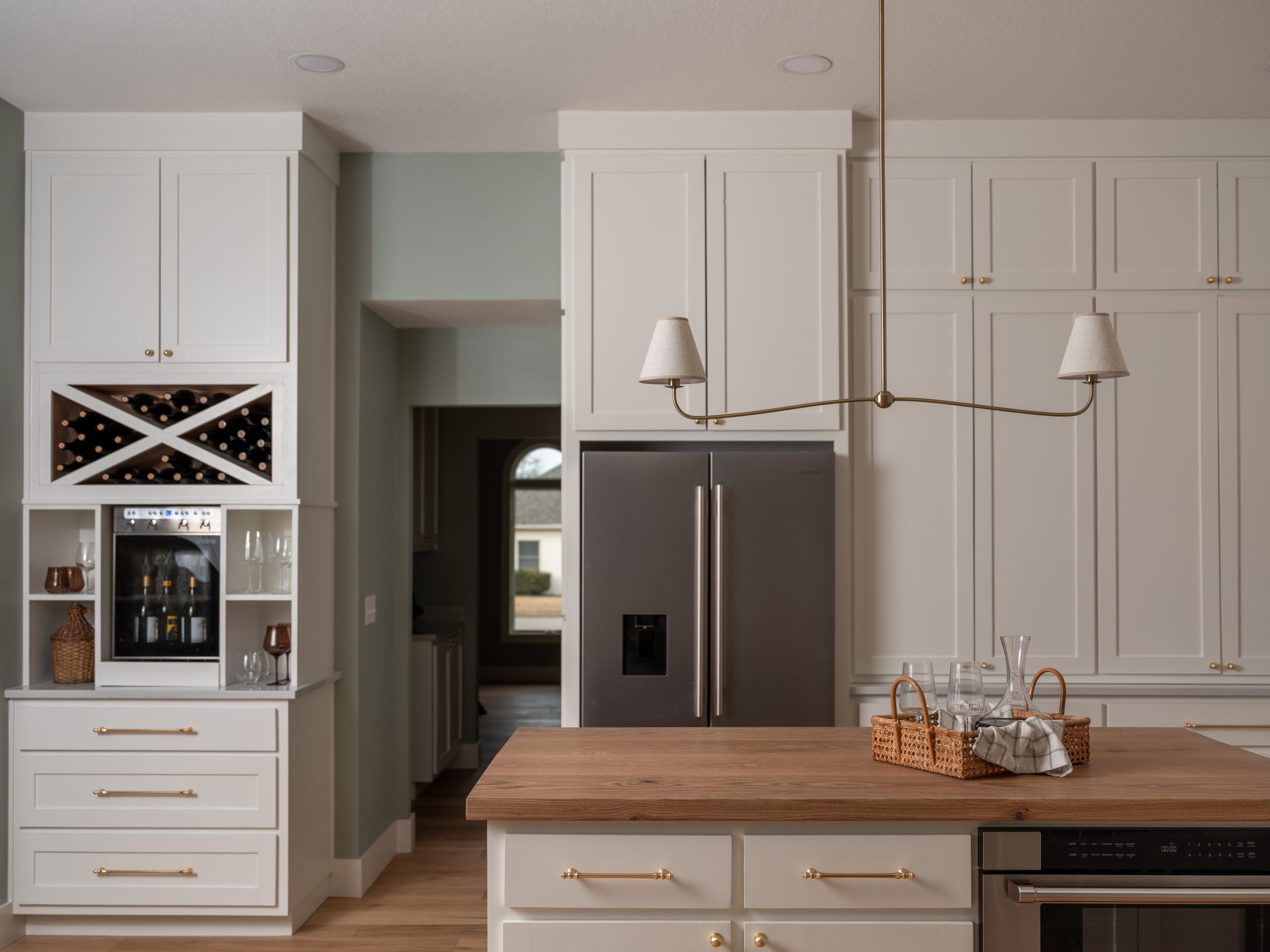 For the coastal feel, we went with white cabinets, countertops, and handmade backsplash tiles, but warmed it up with natural wood on the island countertop. The wood also ties in perfectly with the wooden front door and the new fireplace mantel. As a surprise for Jennifer, Larry brought over a fun wine dispenser, which we installed, and she loved it!