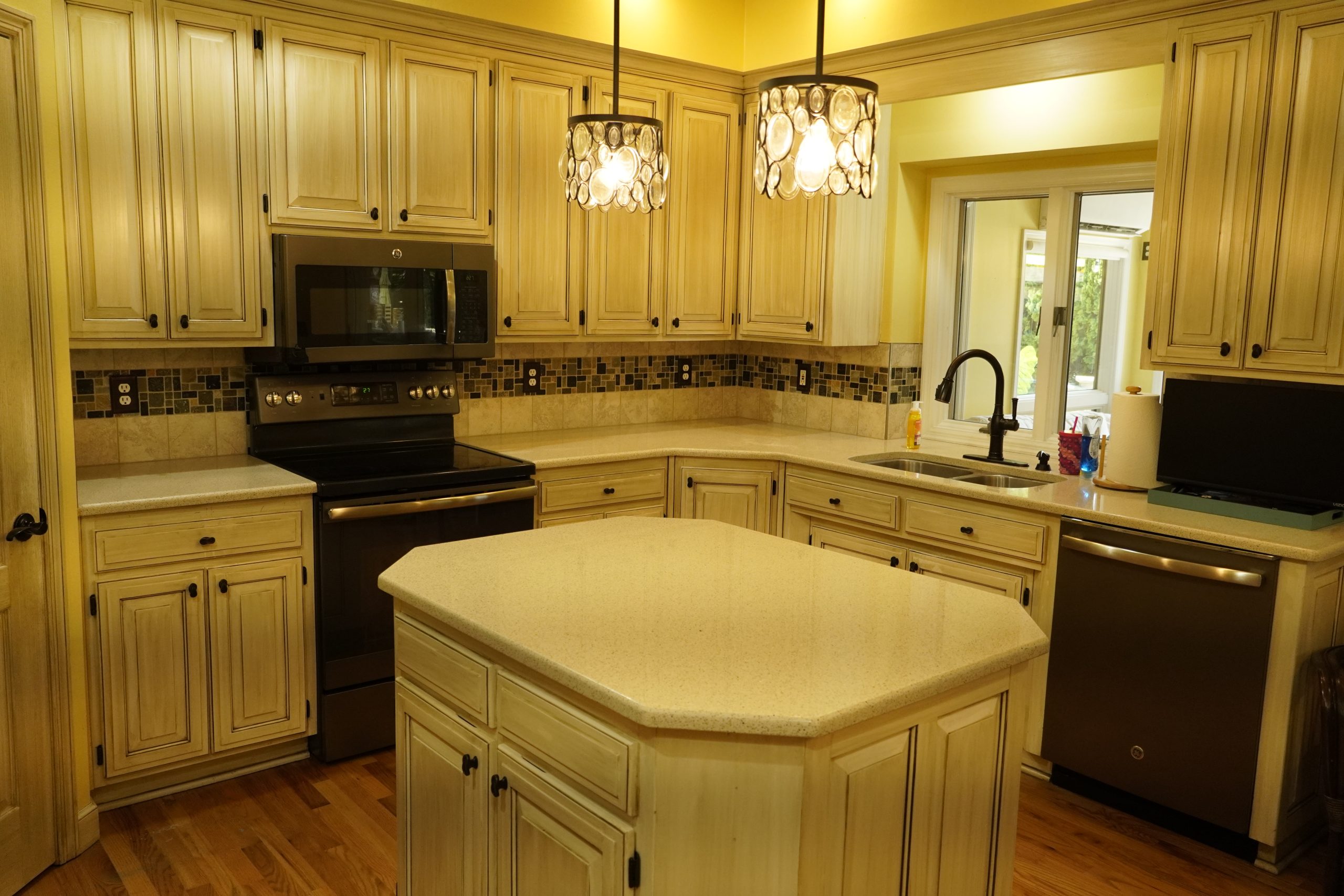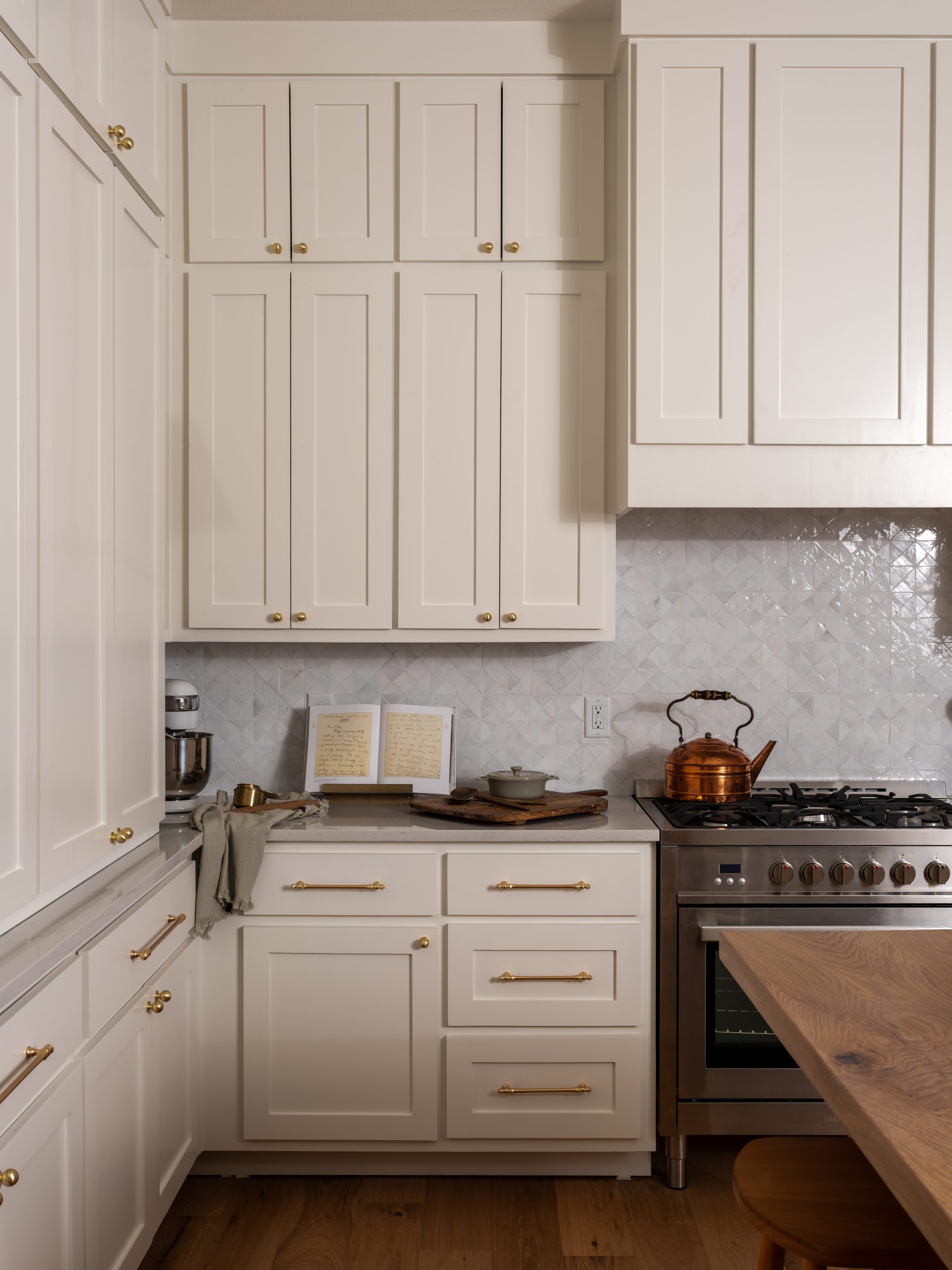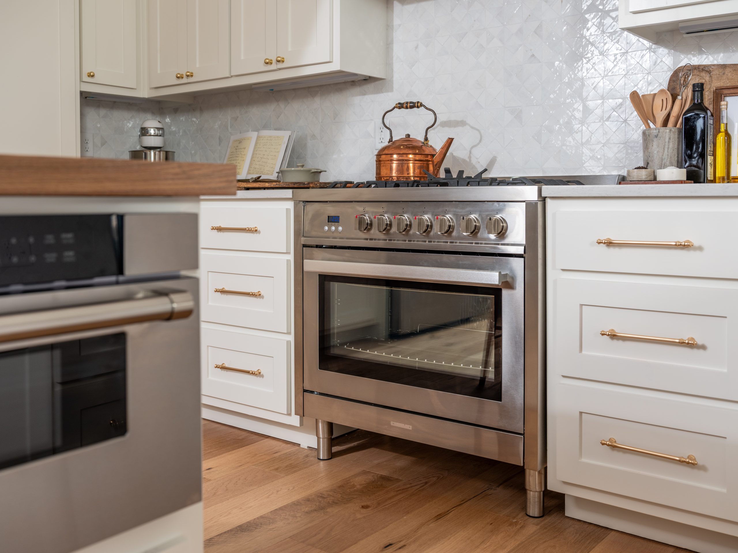 For the coastal feel, we went with white cabinets, countertops, and handmade backsplash tiles, but warmed it up with natural wood on the island countertop. The wood also ties in perfectly with the wooden front door and the new fireplace mantel. As a surprise for Jennifer, Larry brought over a fun wine dispenser, which we installed, and she loved it!