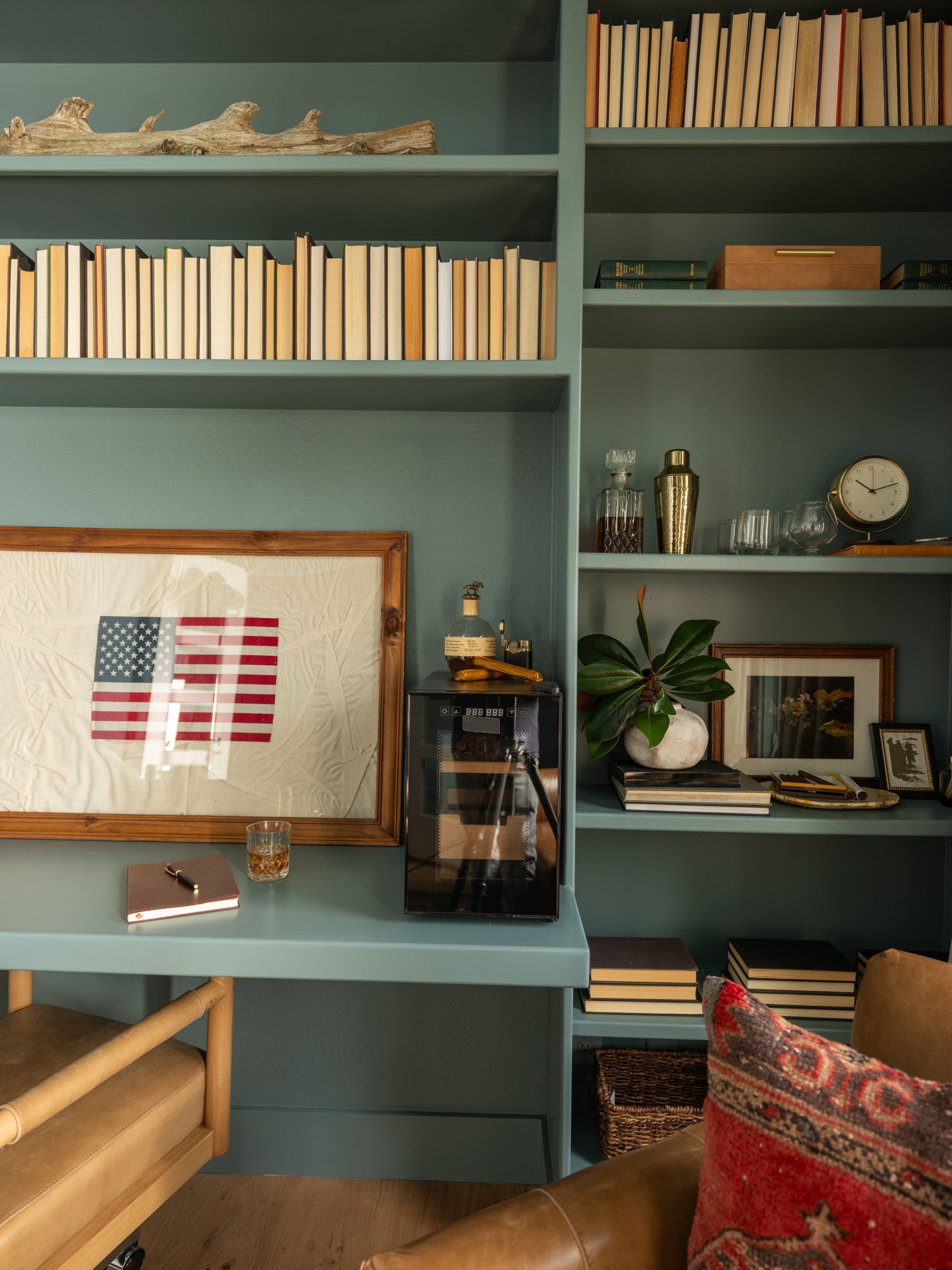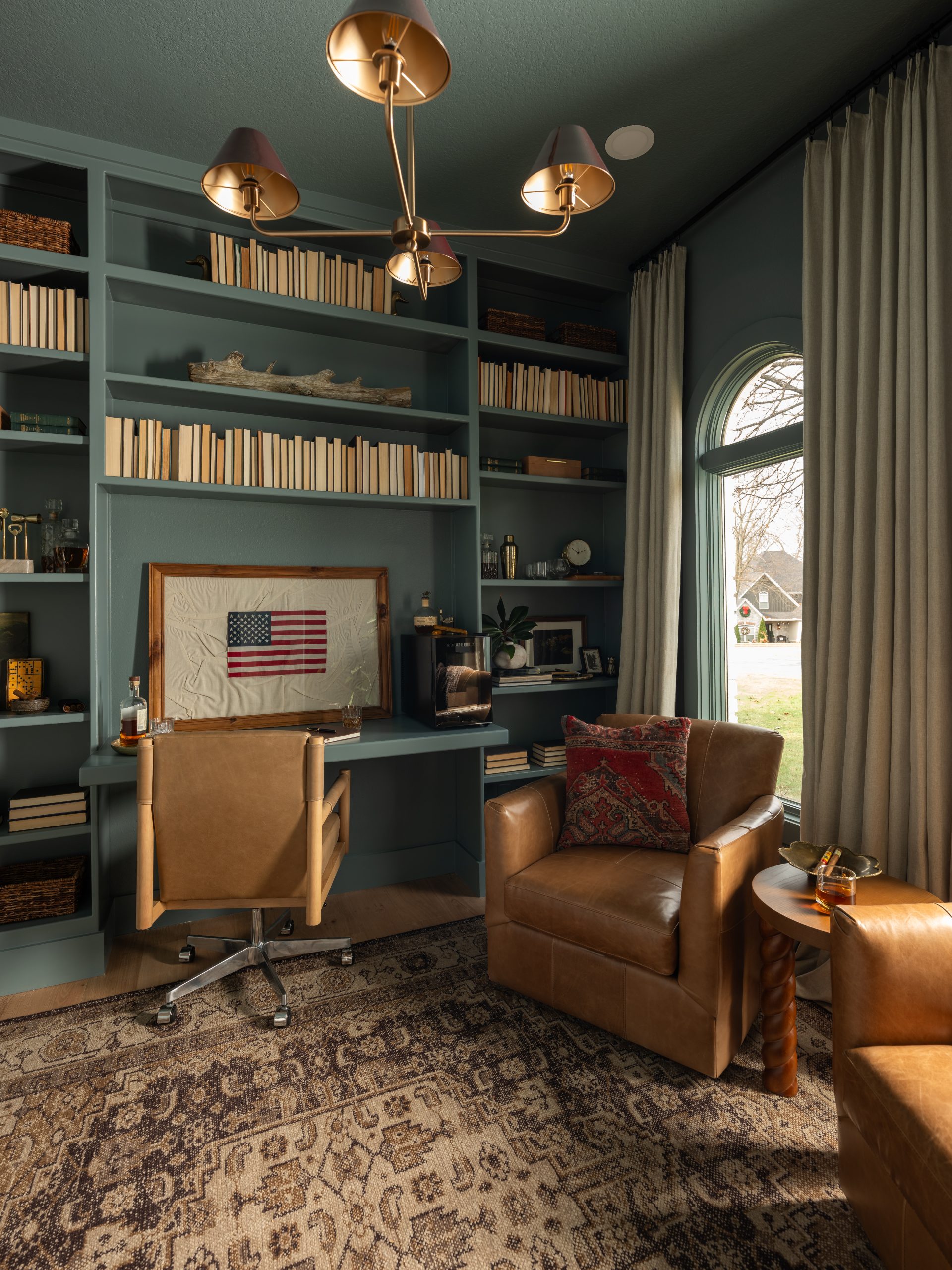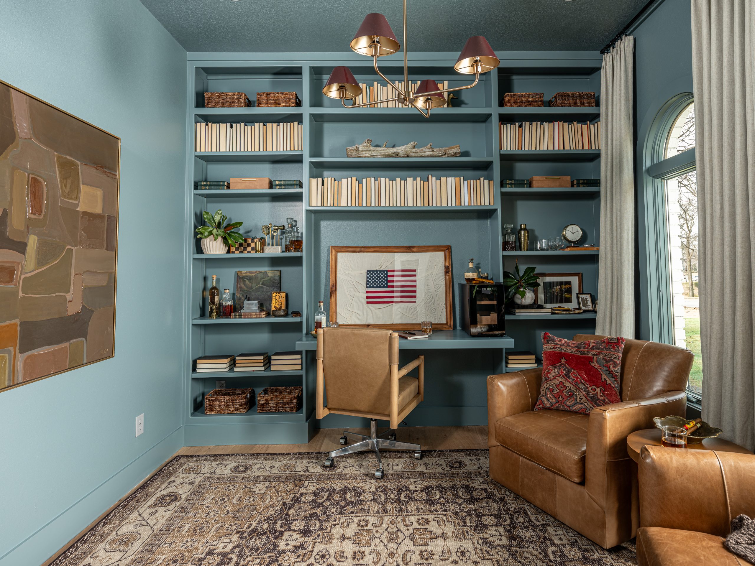 The office is the first space you see when you walk in the front door. This space was important to Larry because it had a large bookcase that was full of memorabilia from his time spent serving in the Secret Service during 9/11. The Lundeens wanted to give up some of the room’s square footage in order to make Caroline’s room bigger on the other side. This meant taking apart the current bookcase and thinking strategically about how to give him back shelving while making room for his desk and the lounging area he wanted. We were able to salvage some of the original bookcase by shifting it to the sides and saving space by building a desk into the center of the renovated bookshelf. This gave us room on the other side of the office to add two comfy lounge chairs. We finished it off with French doors and a rich blue paint on both the walls and ceiling, giving the space a cozy, sophisticated feel.
