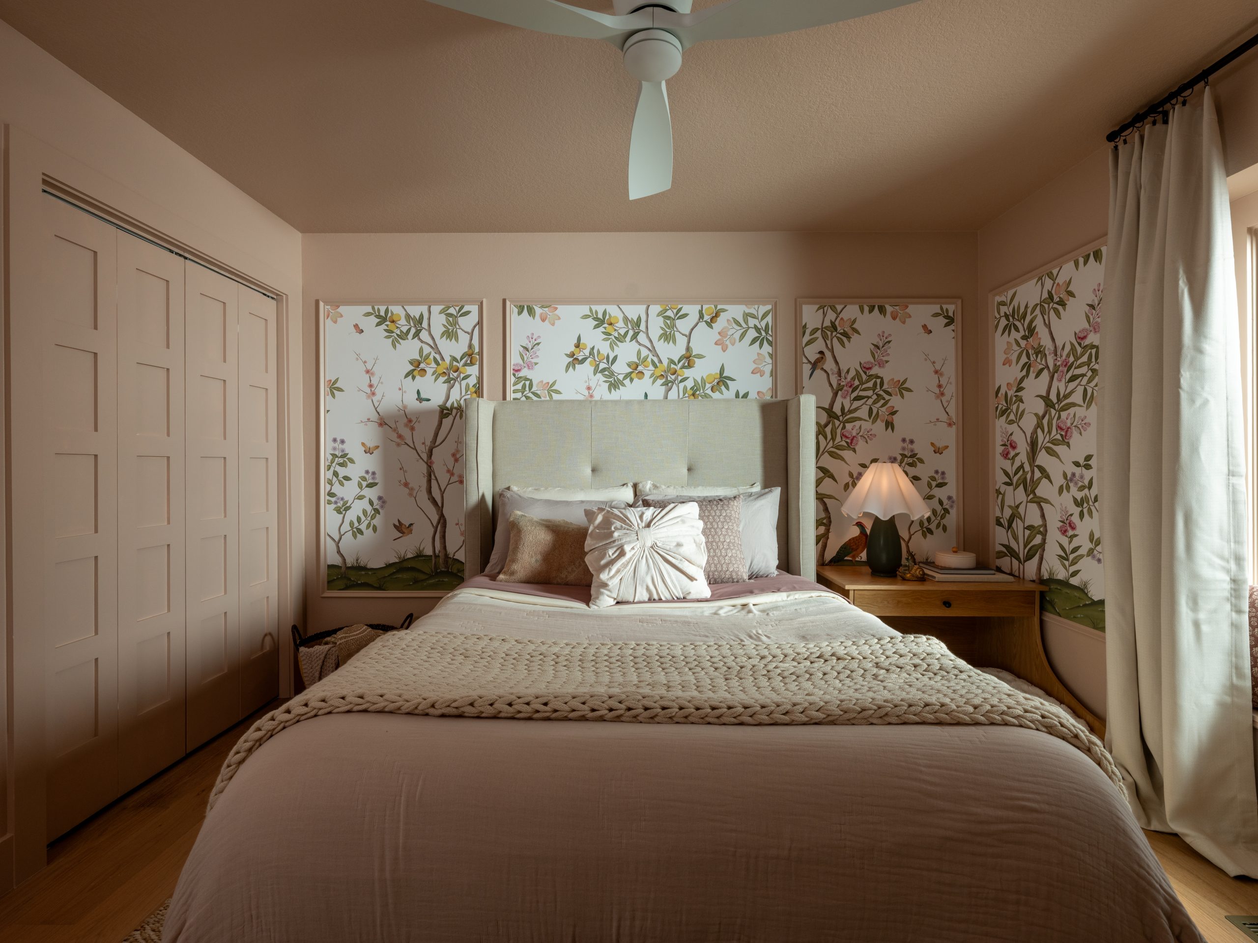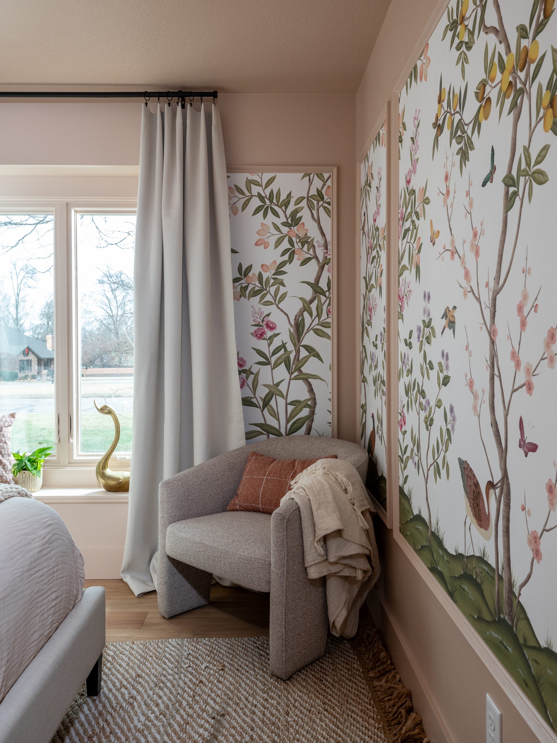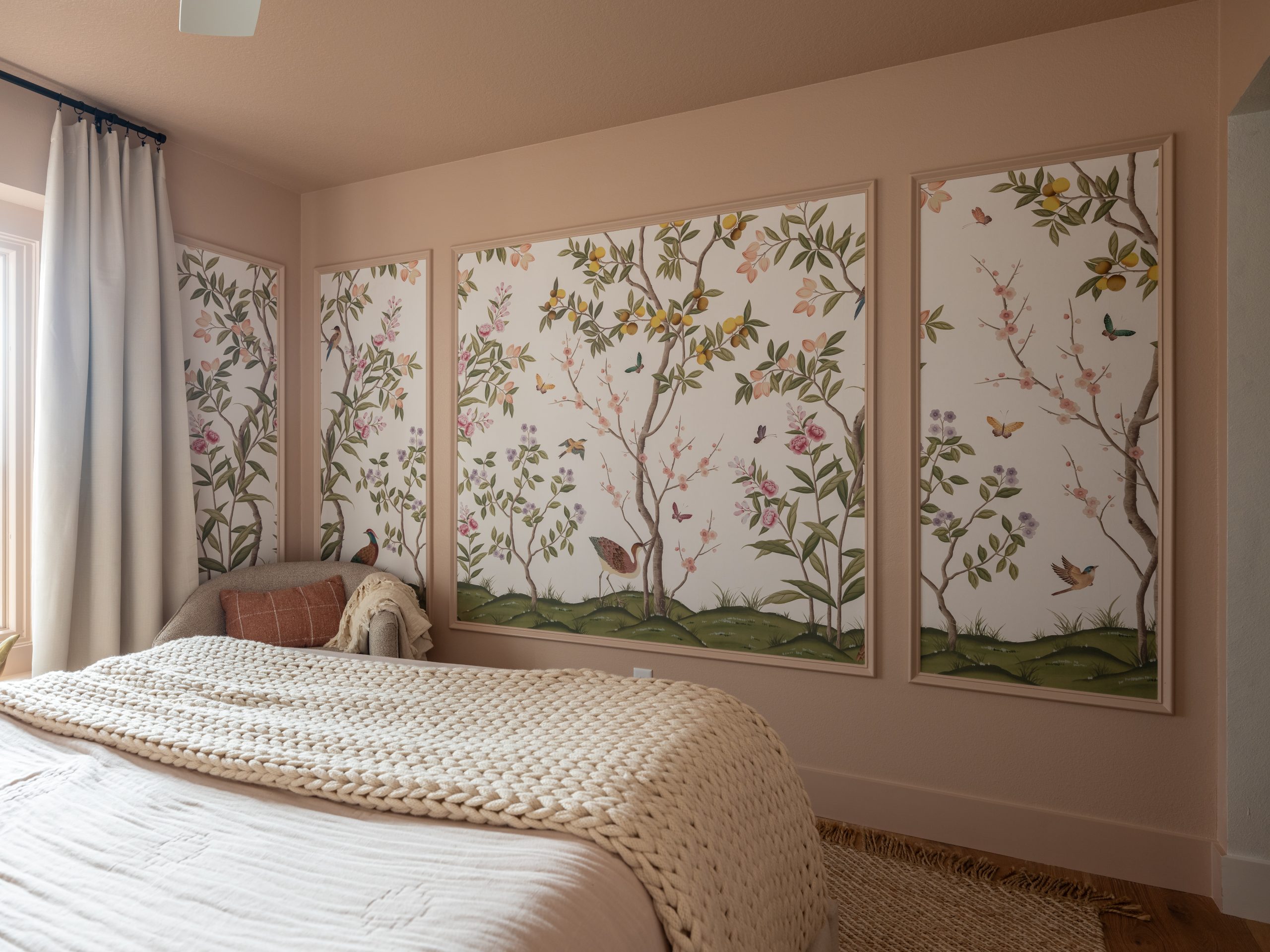 This turned out to be my favorite room in the house! Caroline loves butterflies, and they have a special meaning for the Lundeens. When Caroline was very small, butterflies reminded Jennifer of her sweet baby—beautiful and delicate. I love how we were able to incorporate this sentiment and add whimsy to her space by installing a beautiful, grown-up wallpaper centered in custom trim that frames it in sections, making the wallpaper look more like wall art.