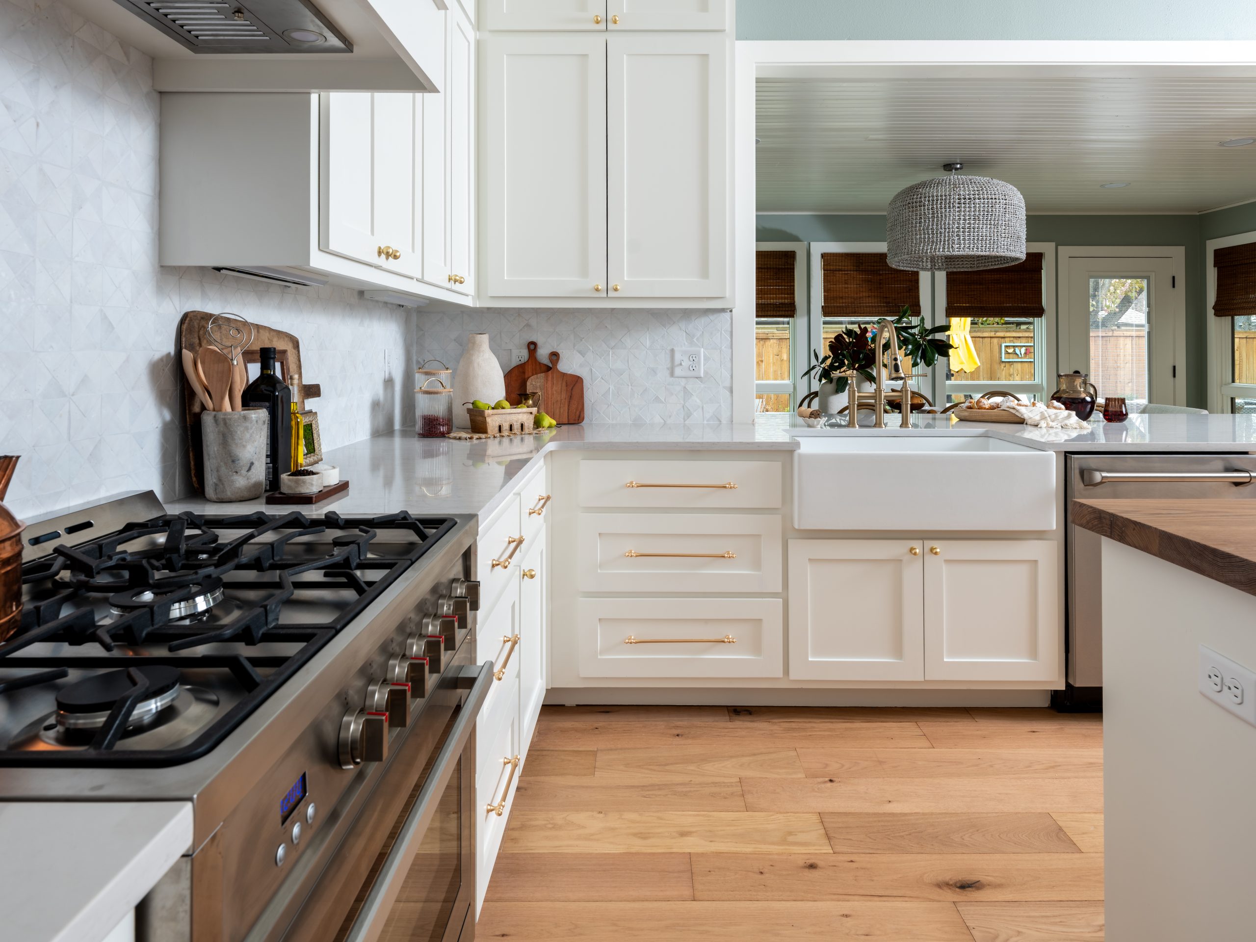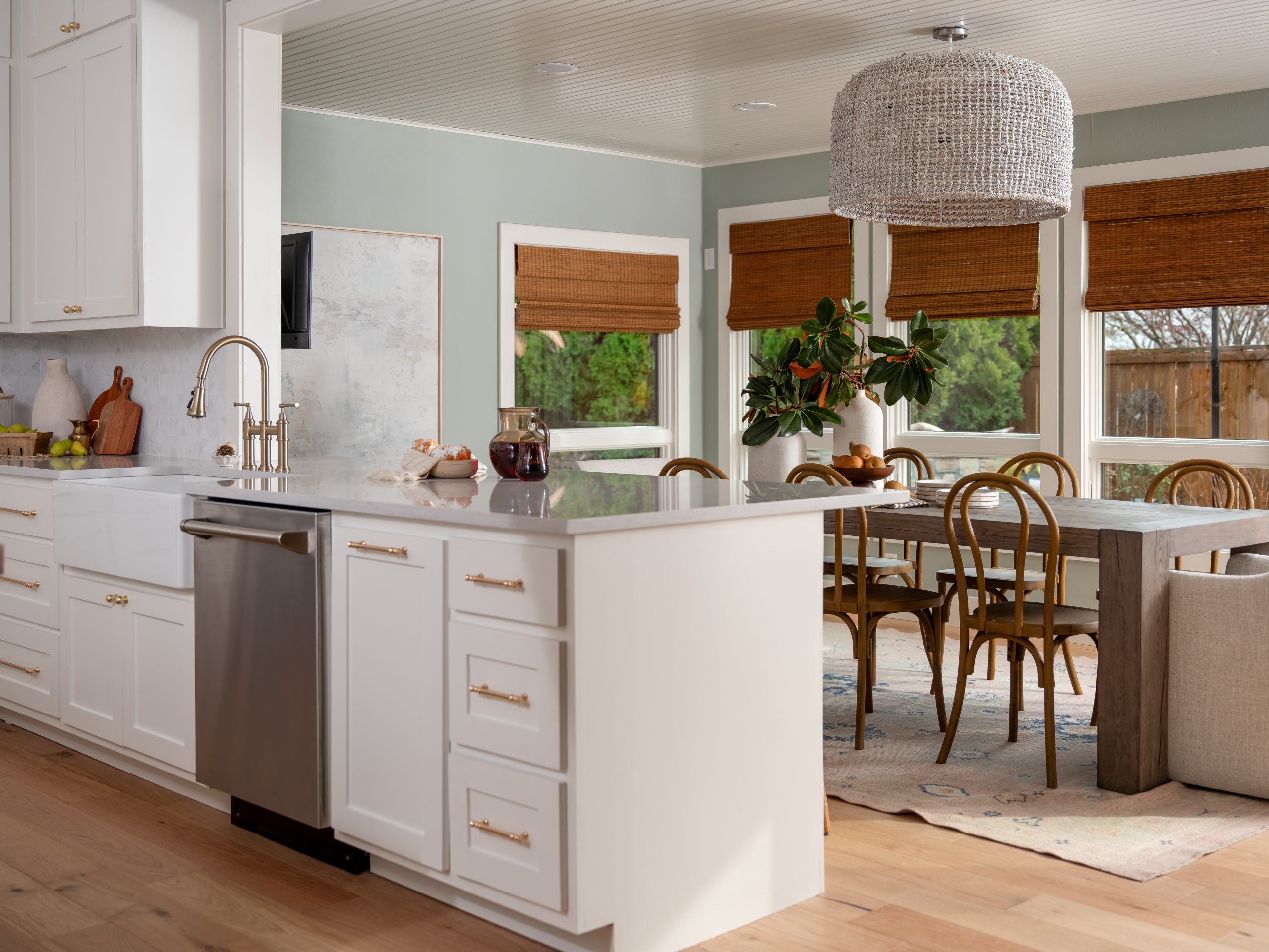 The kitchen was already a good size, but the tray ceiling and older cabinetry made the space feel dated. The Lundeens were ready for a refresh that would bring in the light, coastal feel they wanted for their home. We started by taking down the dividing wall between the kitchen and the sunroom. This created an even larger open-concept space and allowed us to move the dining table, turning the sunroom into a dedicated dining room. Since we no longer needed a table in the kitchen, we were able to install a much larger island. These changes created much more seating, making it easier to host and gather, which was important to this family.