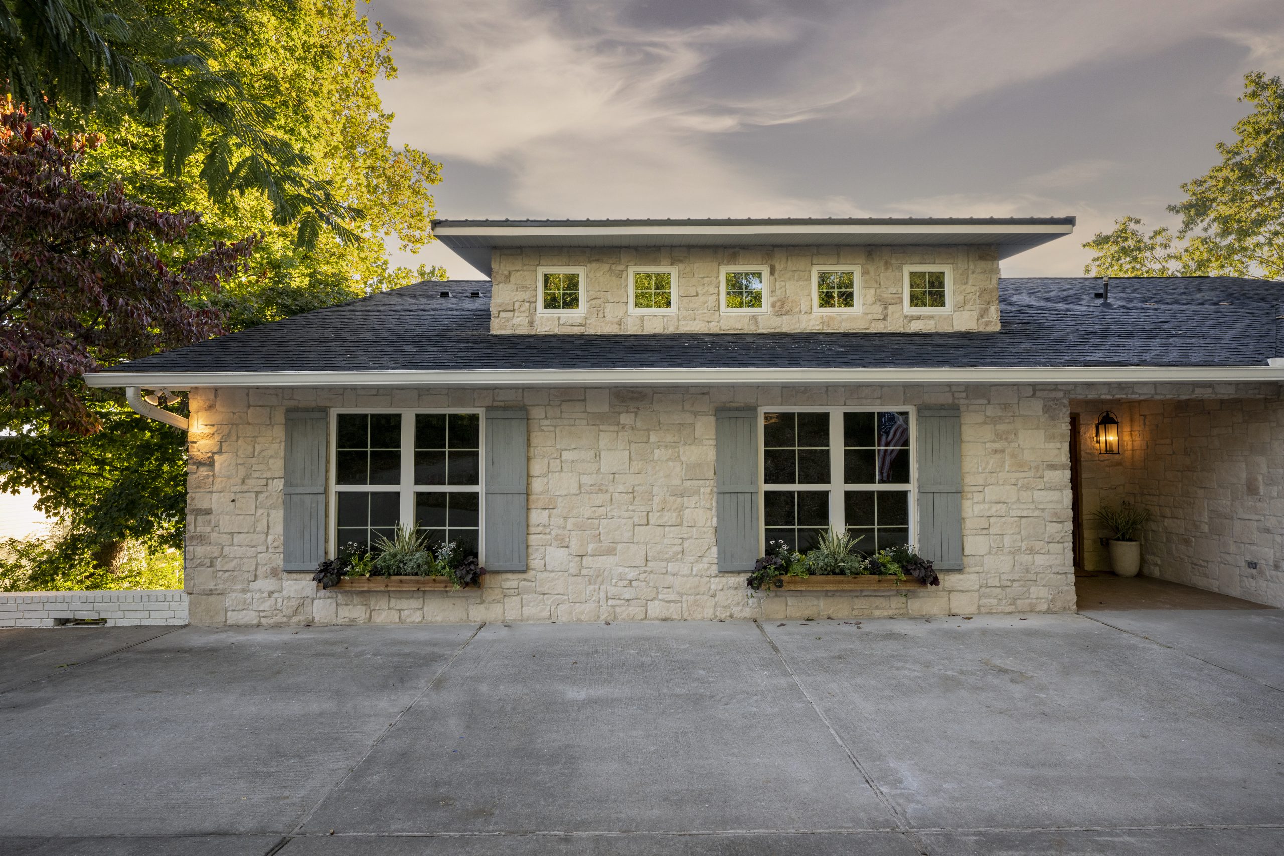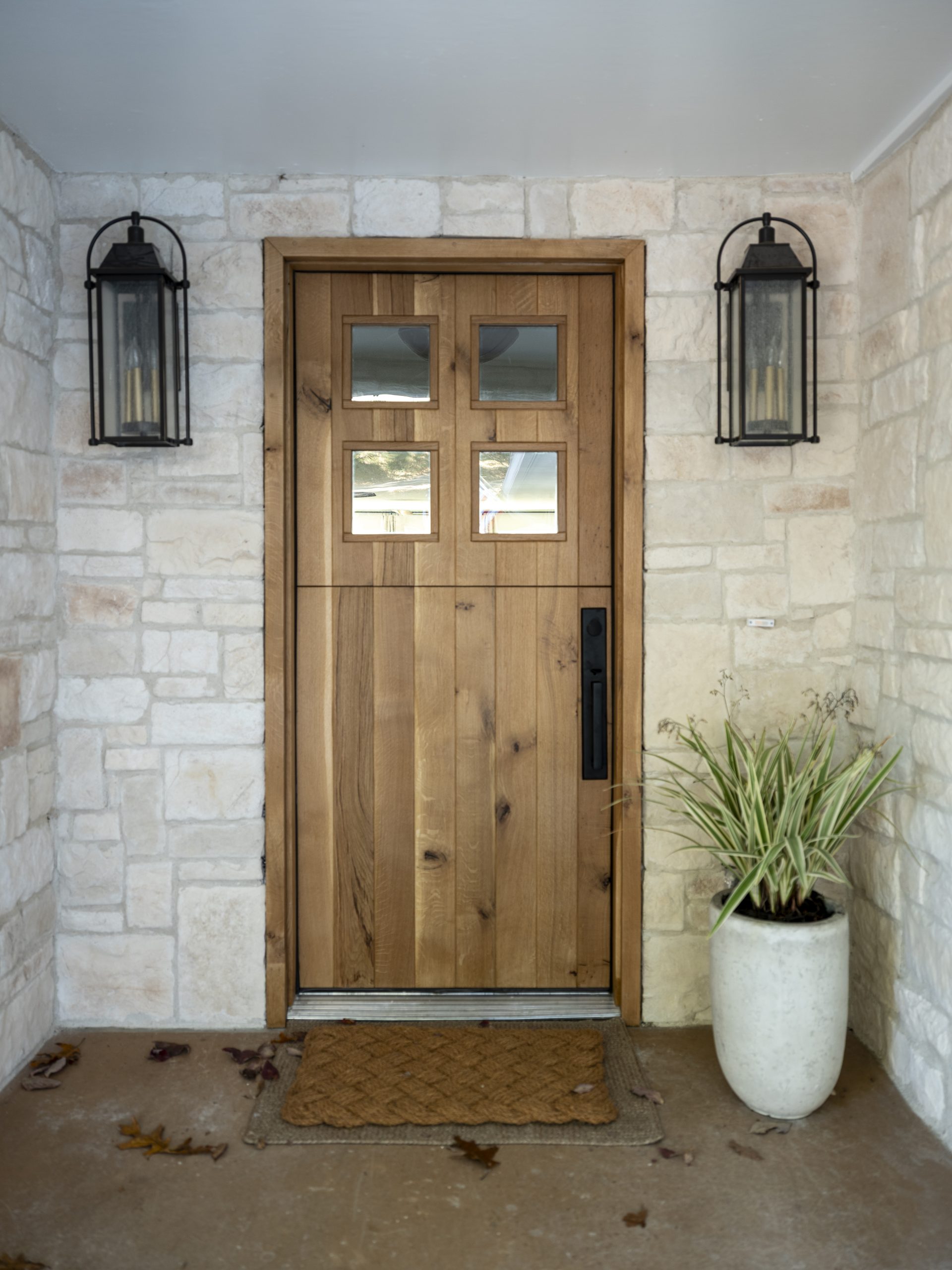 The house hadn’t been touched since the 1970s and was very understated compared to the inside and the view beyond. Debbie wished the house were a little taller, and she didn’t like the brick color. We decided to add a faux dormer to give the house more dimension, and instead of painting the brick, we went with a stone façade. We updated the windows and shutters, added flower boxes, and installed a new front door and new lighting. Now it looks like a sweet lakehouse cottage. Debbie loved the Dutch door Dave and the guys built; she said she had always wanted one.