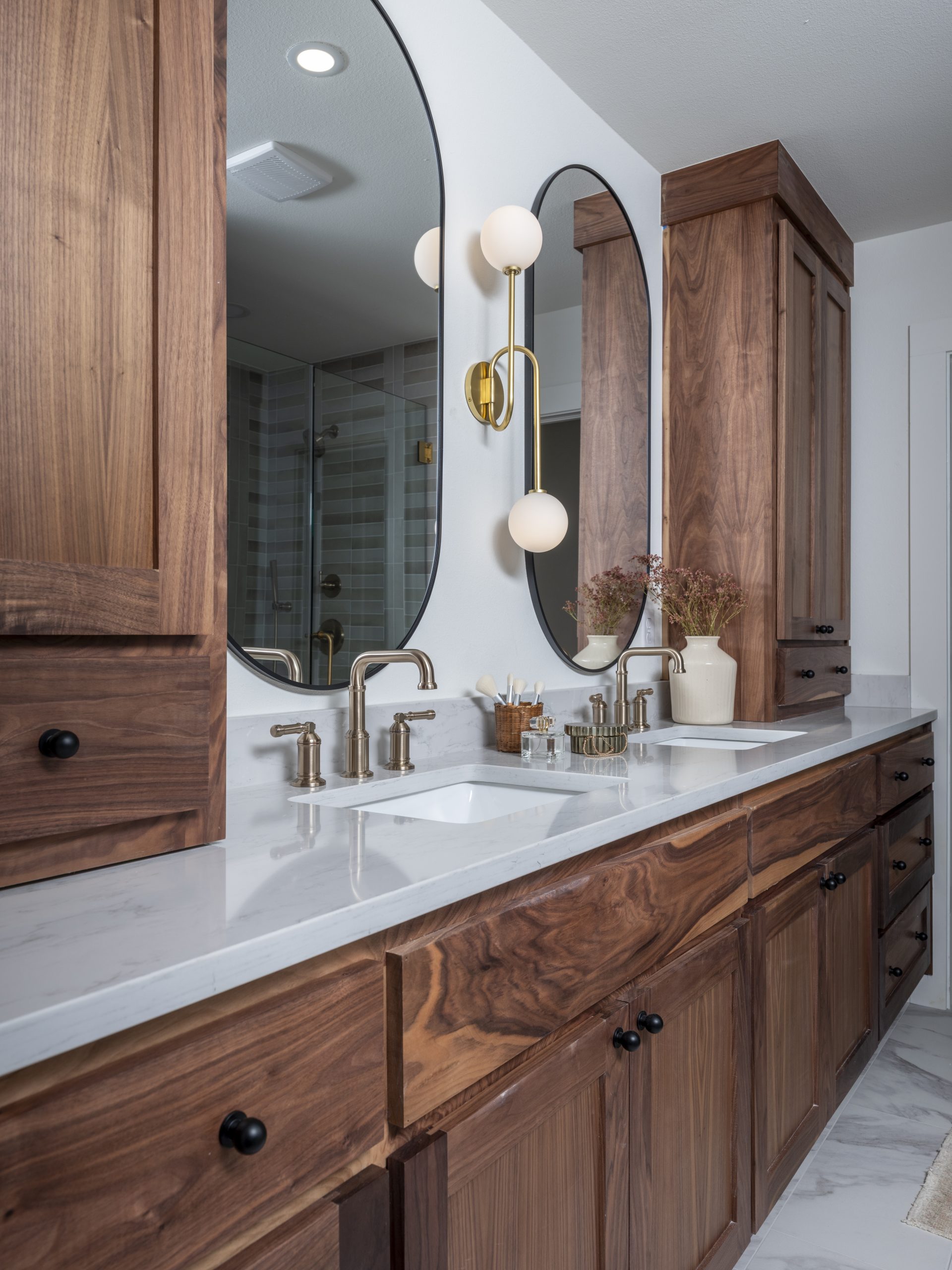 The bathroom was still holding onto its 1970s look and layout, so we gutted it completely and reimagined the space. We gave Debbie a modern shower, a soaking tub, a double vanity, and a separate water closet. The combination of traditional walnut cabinetry paired with modern marble-style flooring and tile creates a beautiful, updated space that feels both timeless and fresh.