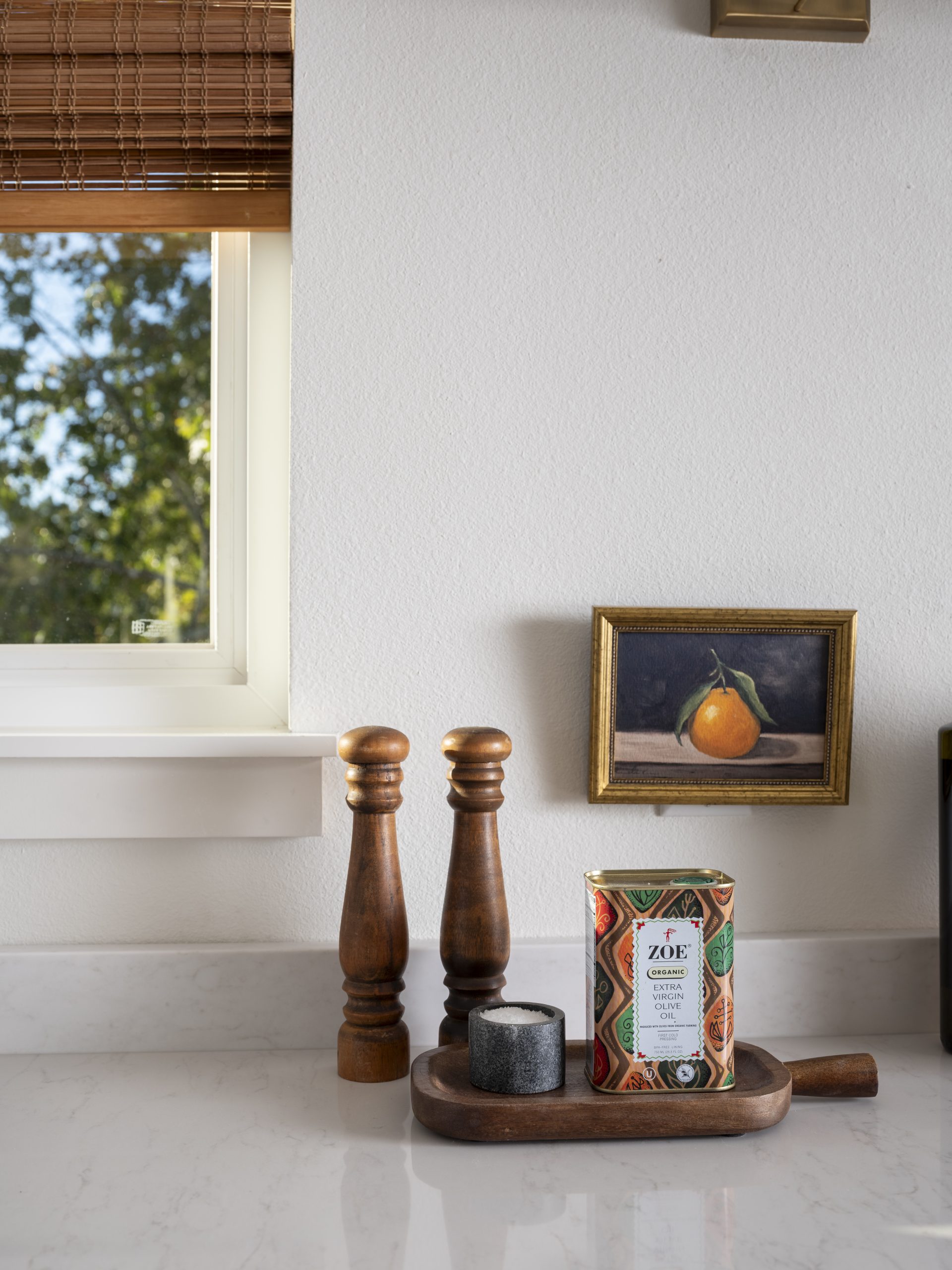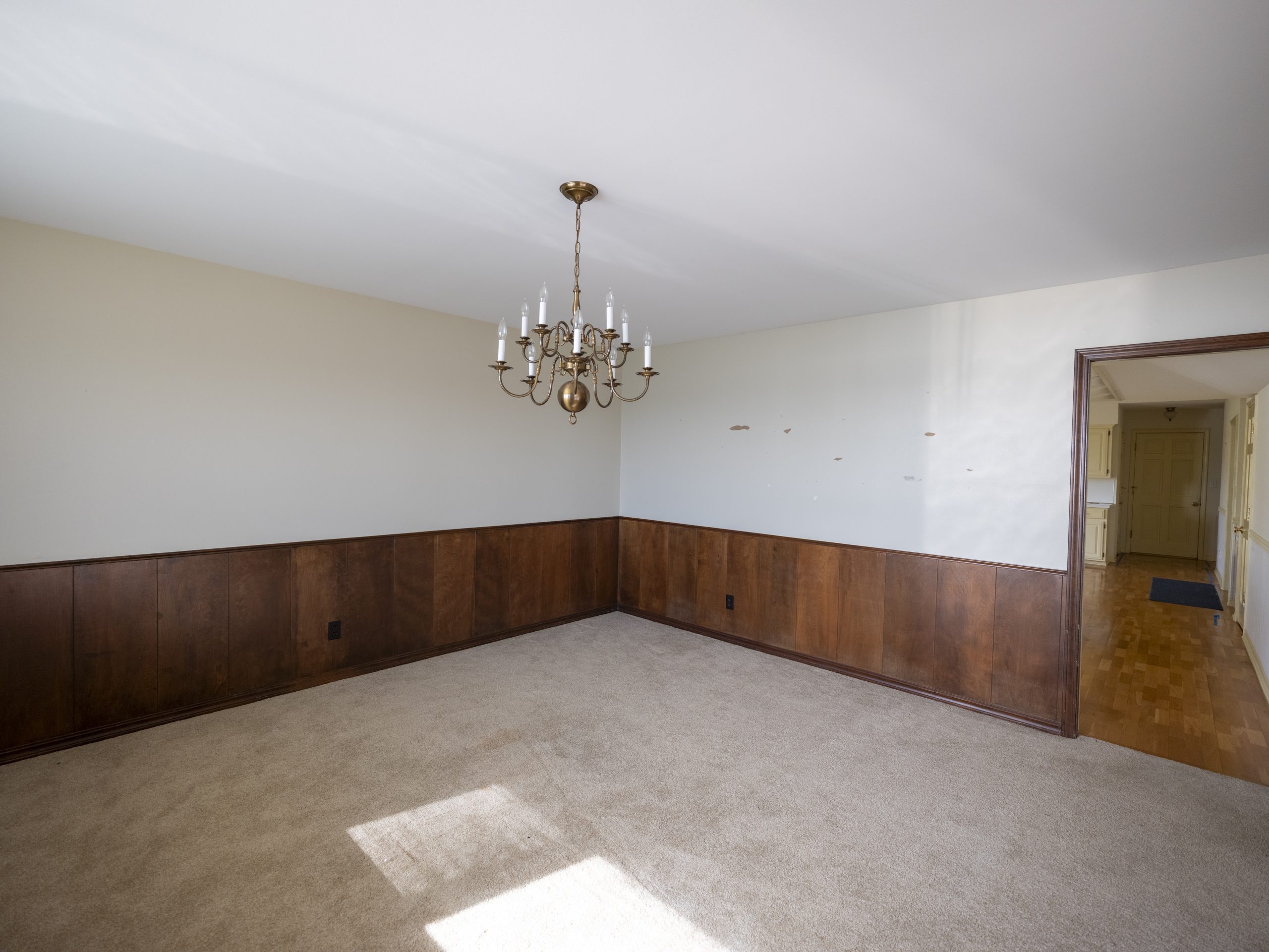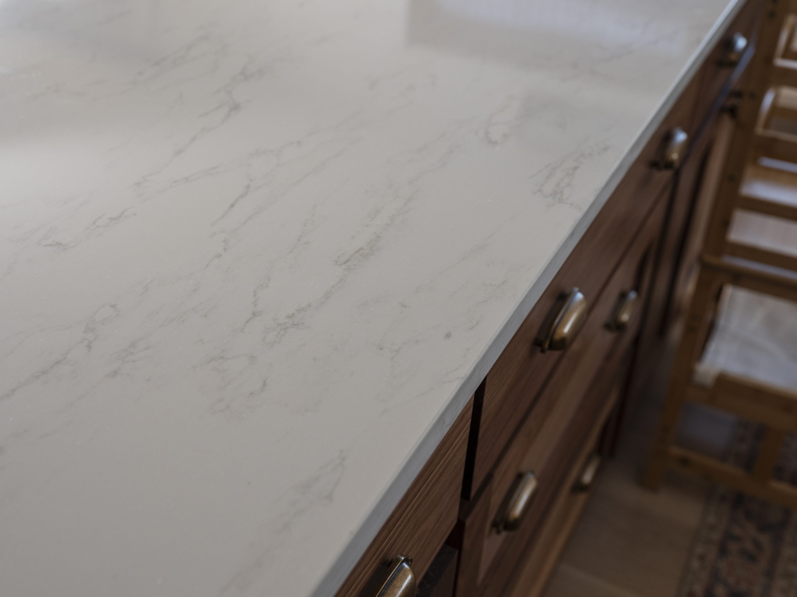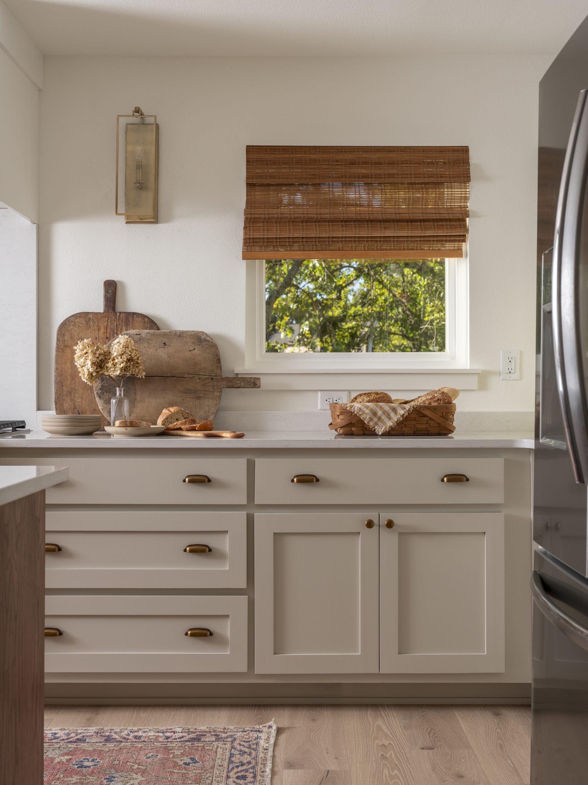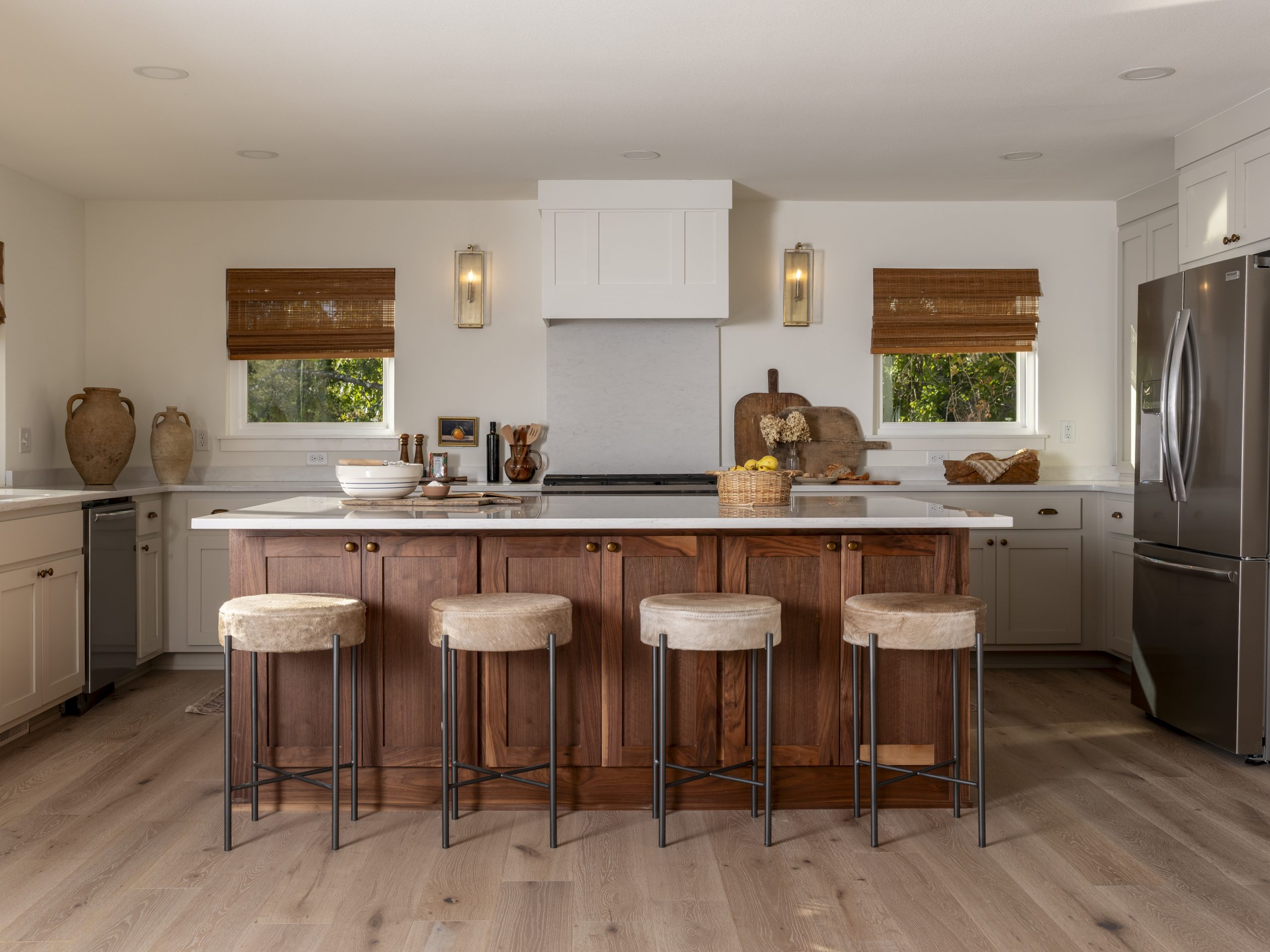 We installed the same flooring here as in the rest of the house and added all-new cabinets, countertops, and a gigantic island. The white tones, gold hardware, and bamboo window treatments give this kitchen a classic, timeless look.