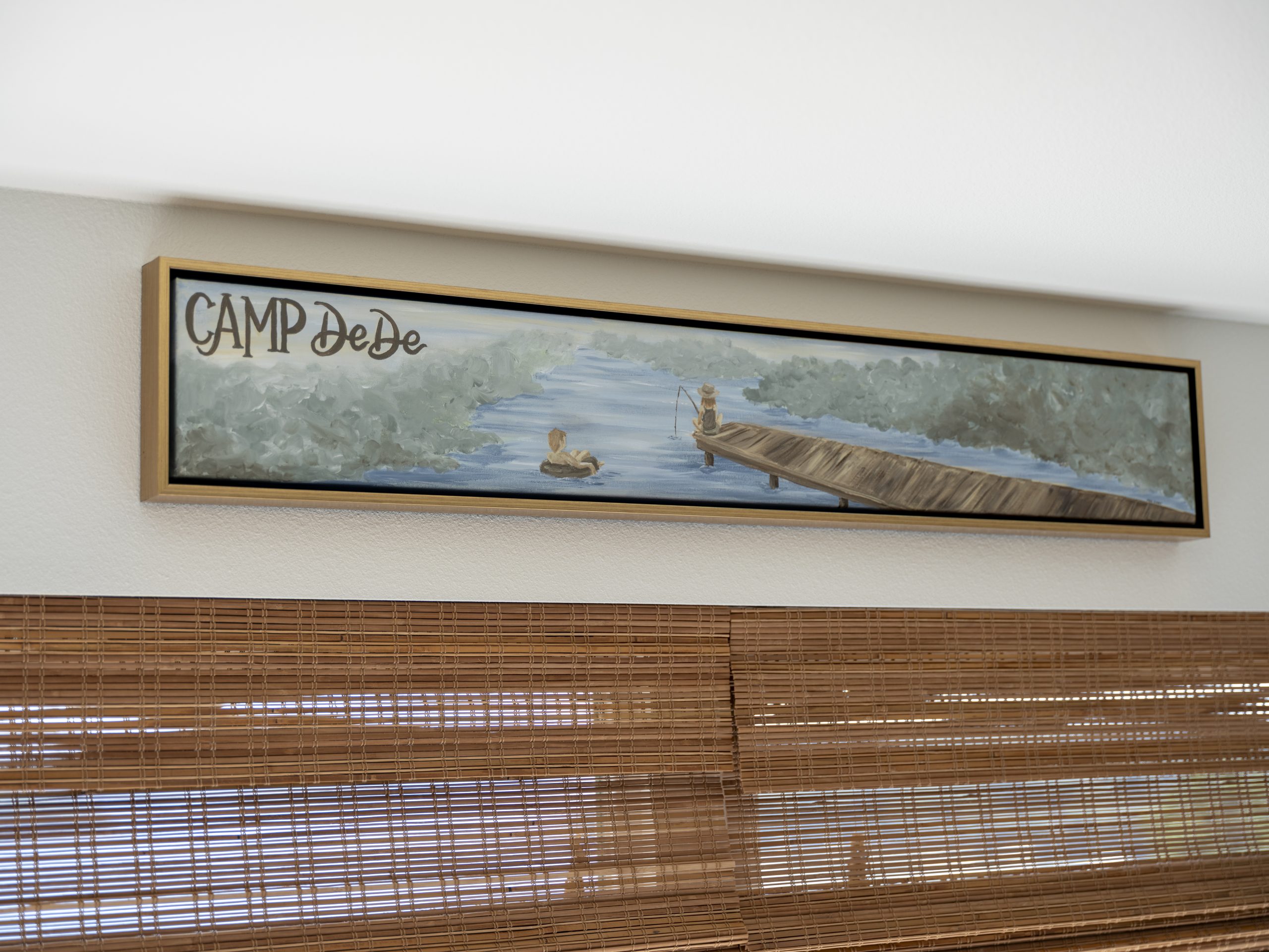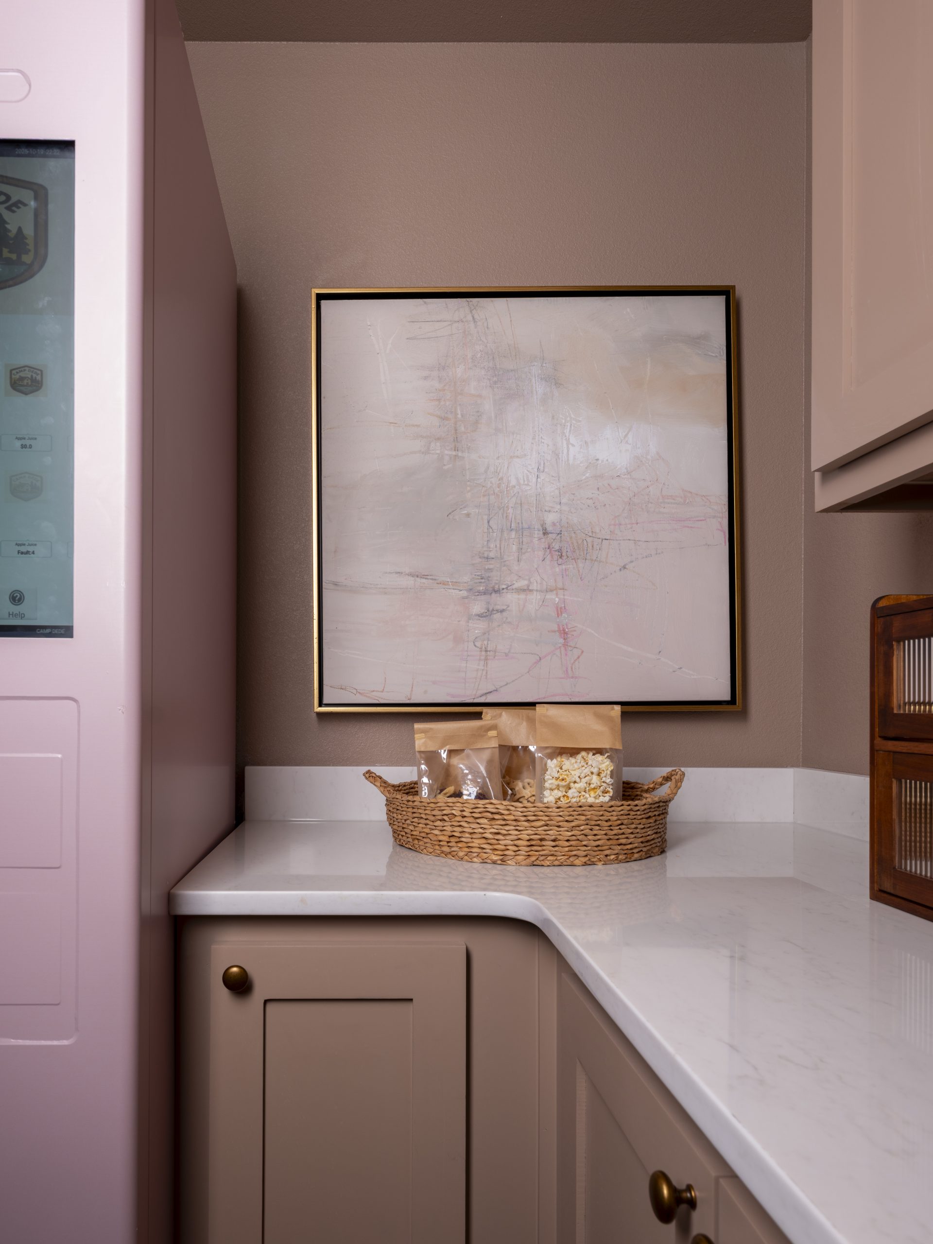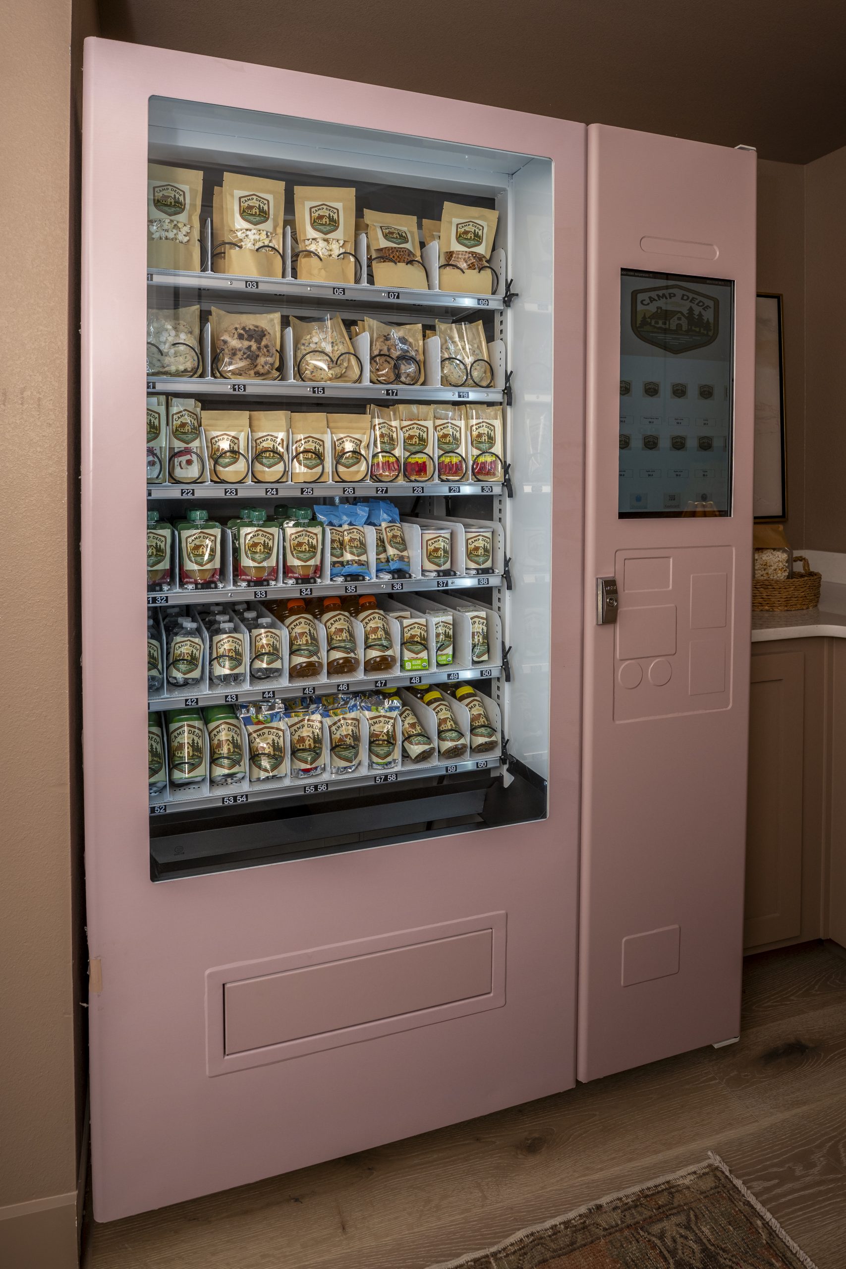 Gates requested a sign for the kitchen that would say “DeDe’s Camp,” and I thought that was such a cute idea that we ran with it. Around the corner from the kitchen, we created a large walk-in pantry, complete with a custom-made vending machine. It’s so cute! The pink shade looks especially sweet against the pantry color.