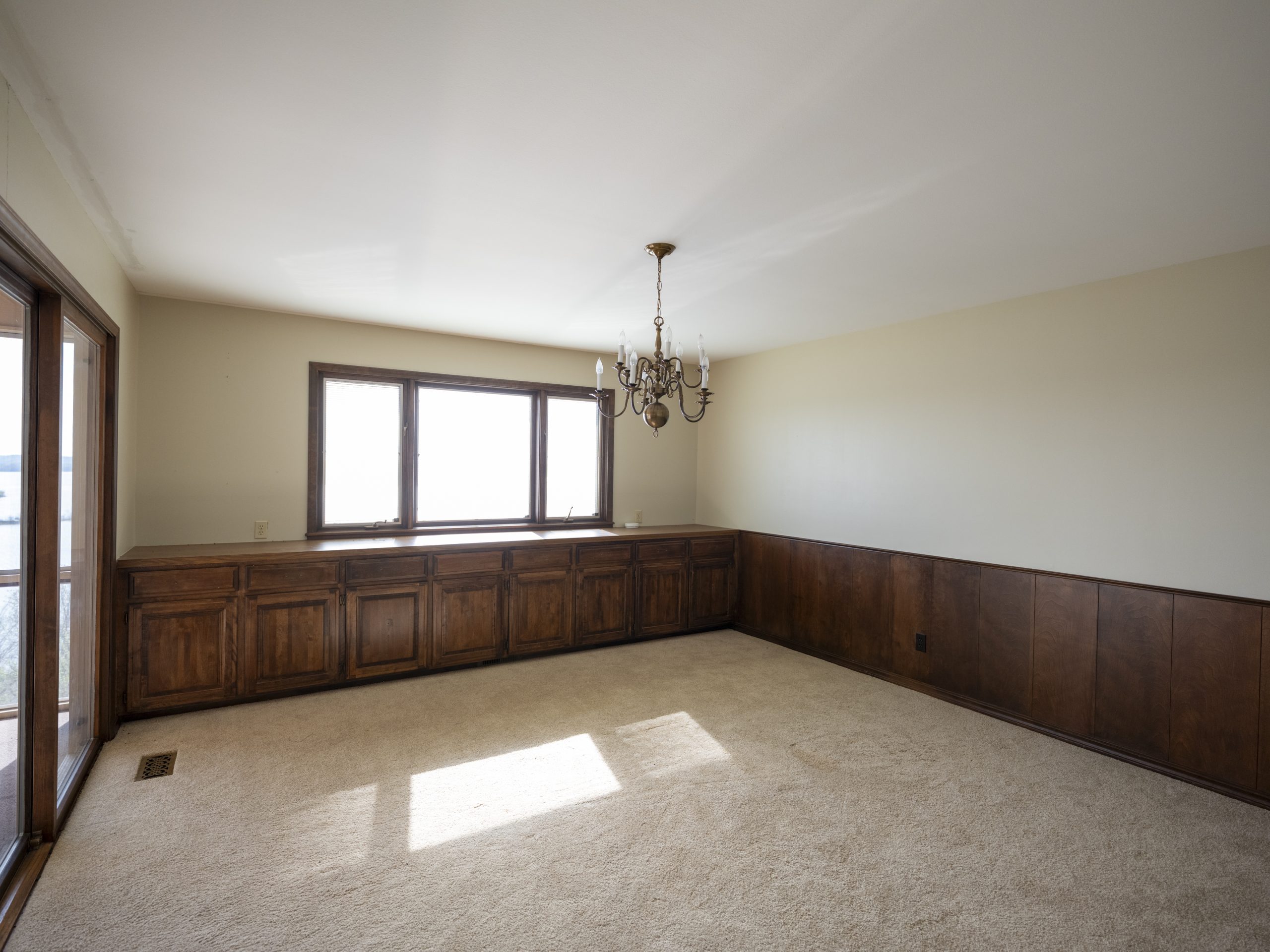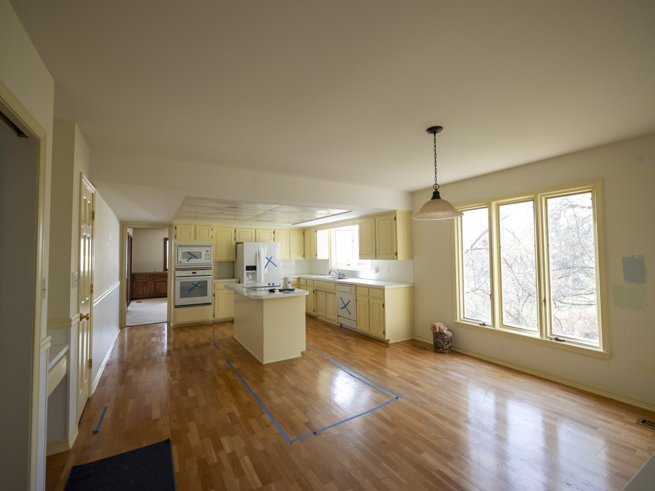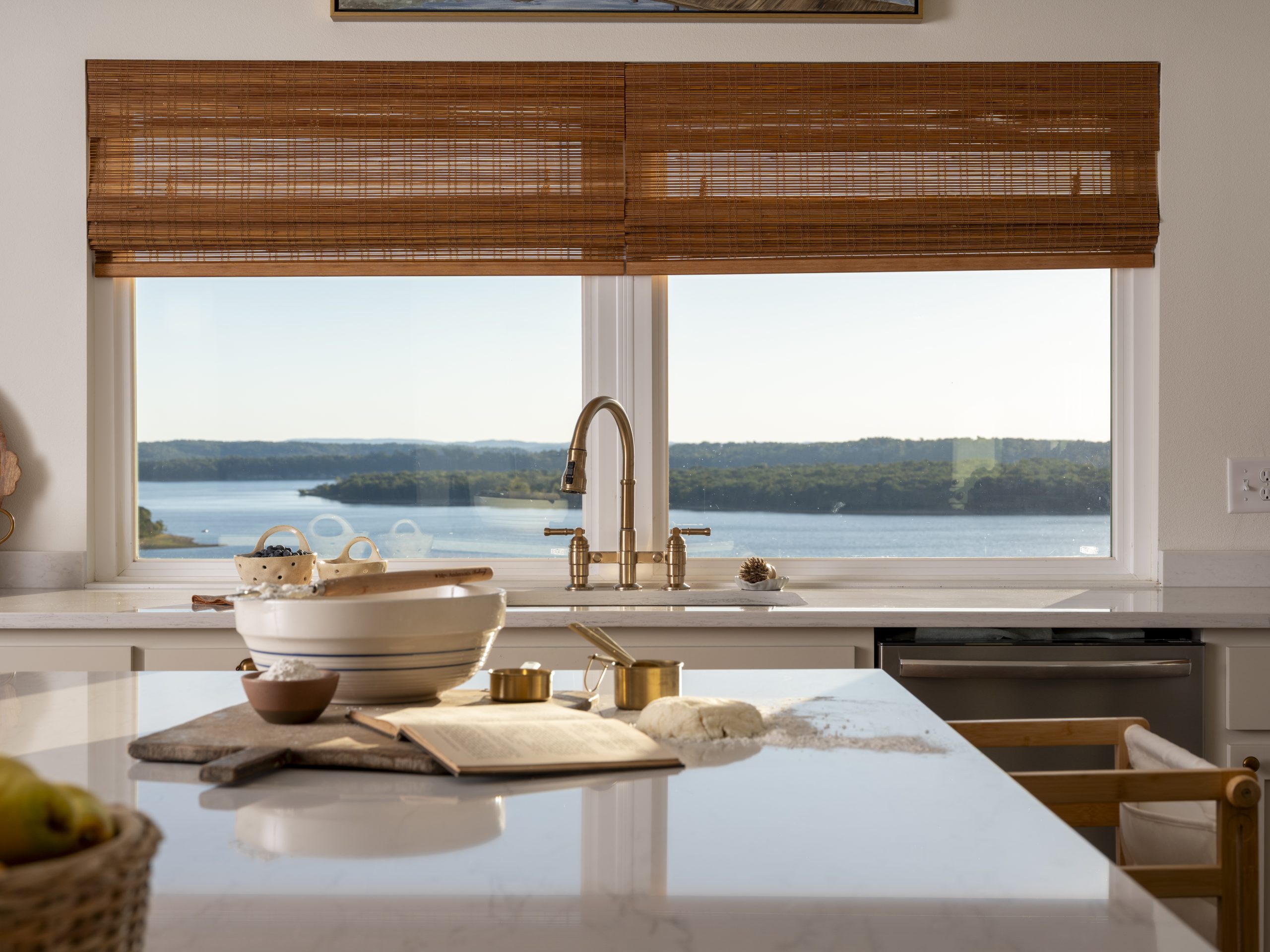 This area hadn’t been touched since the house was built. It still had old, outdated yellow cabinets and white tile countertops. Debbie’s vision was to have lower cabinets with large windows above, which I agreed with wholeheartedly. With lake houses especially, you absolutely want to maximize the view every chance you get.
