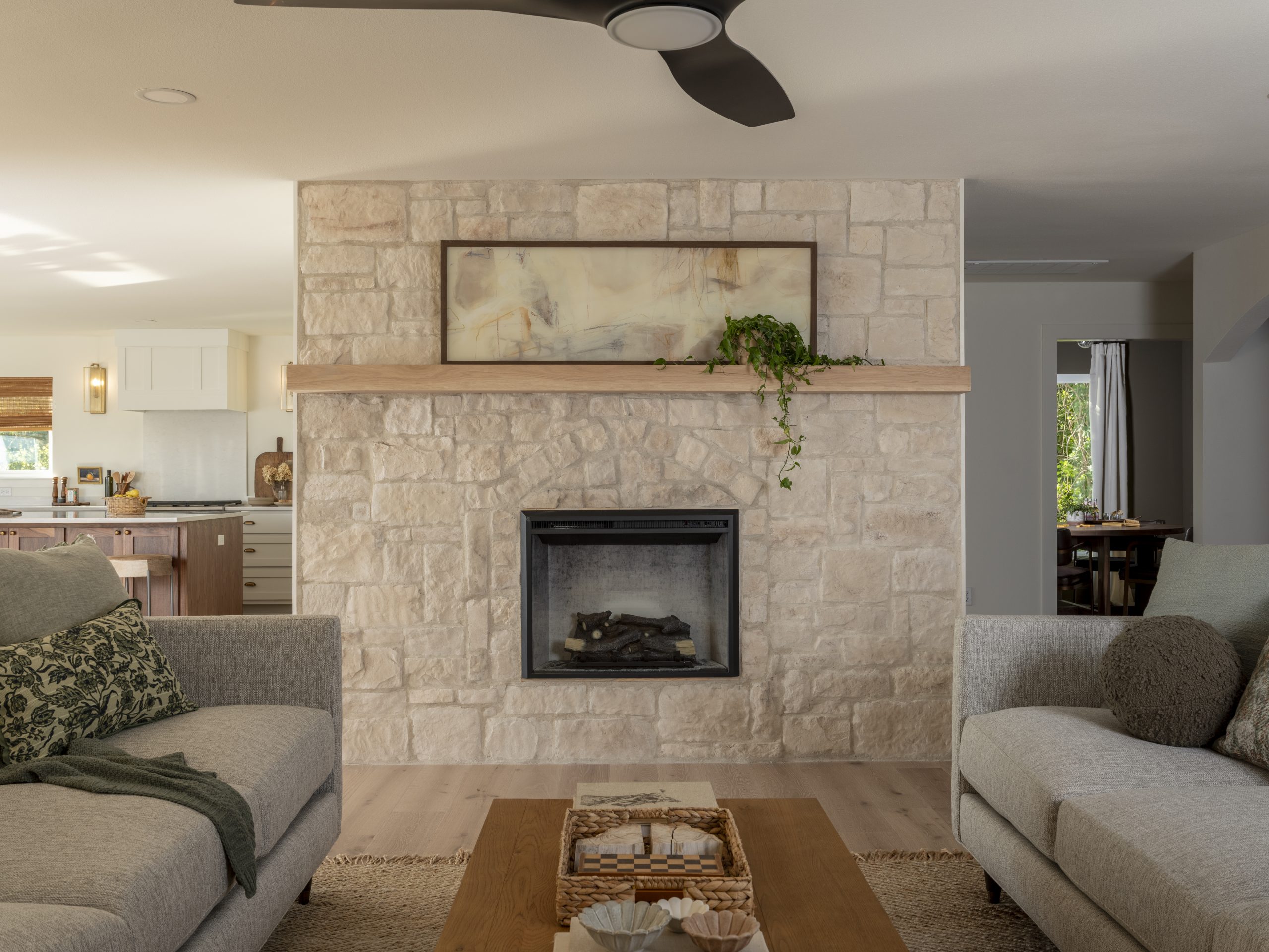 We removed the old carpet and installed wood flooring throughout the house, along with added can lighting to brighten everything up. We also scaled back the fireplace and switched it from gas to electric, making it much safer for the grandchildren. On cold winter days, it is also so much easier to flip a switch and instantly have a cozy fire going. By bringing in the same stone used on the exterior of the home and carrying it onto the fireplace, we were able to keep everything feeling cohesive while giving this lakeside cottage a fresh, updated feel.