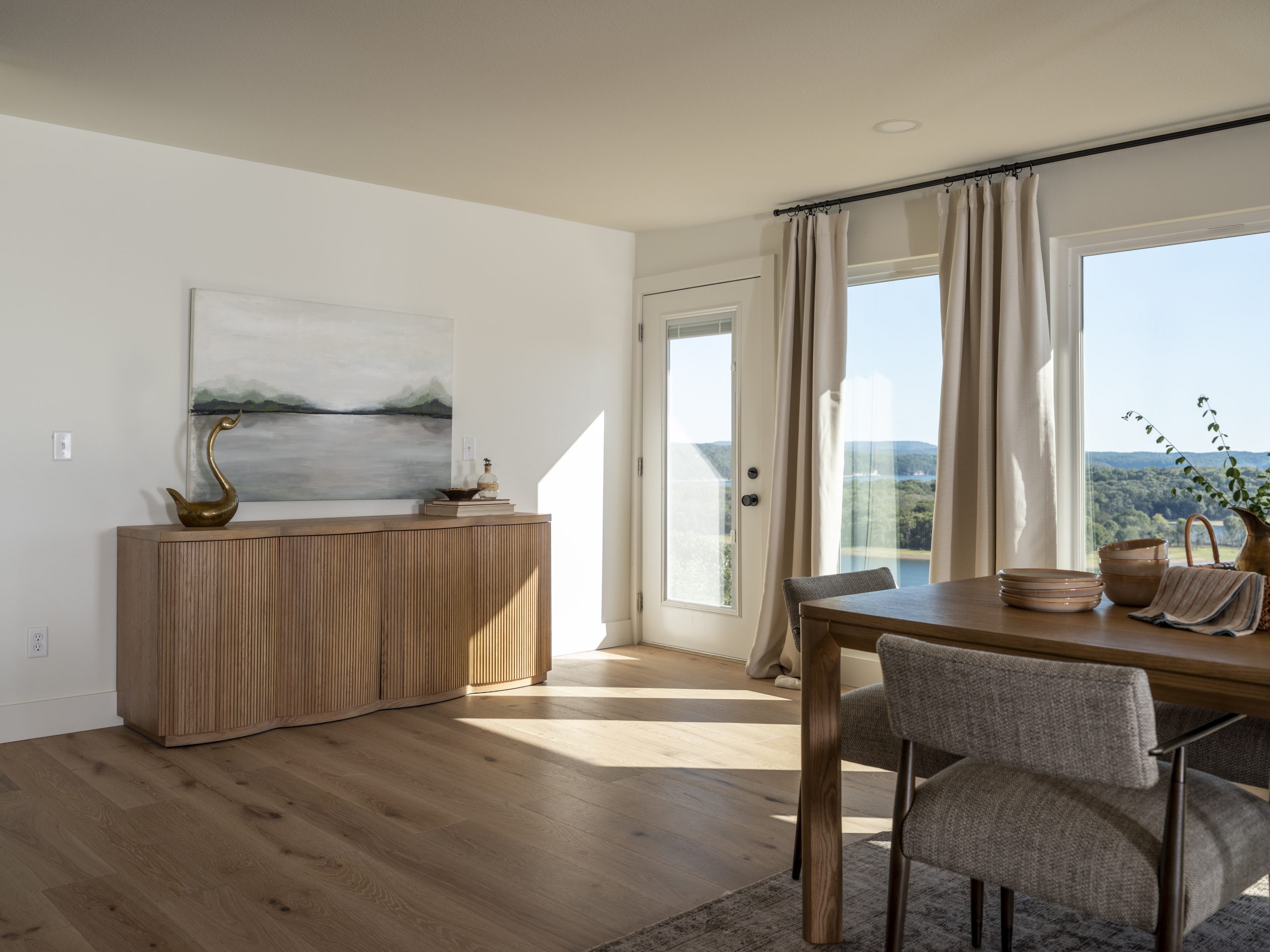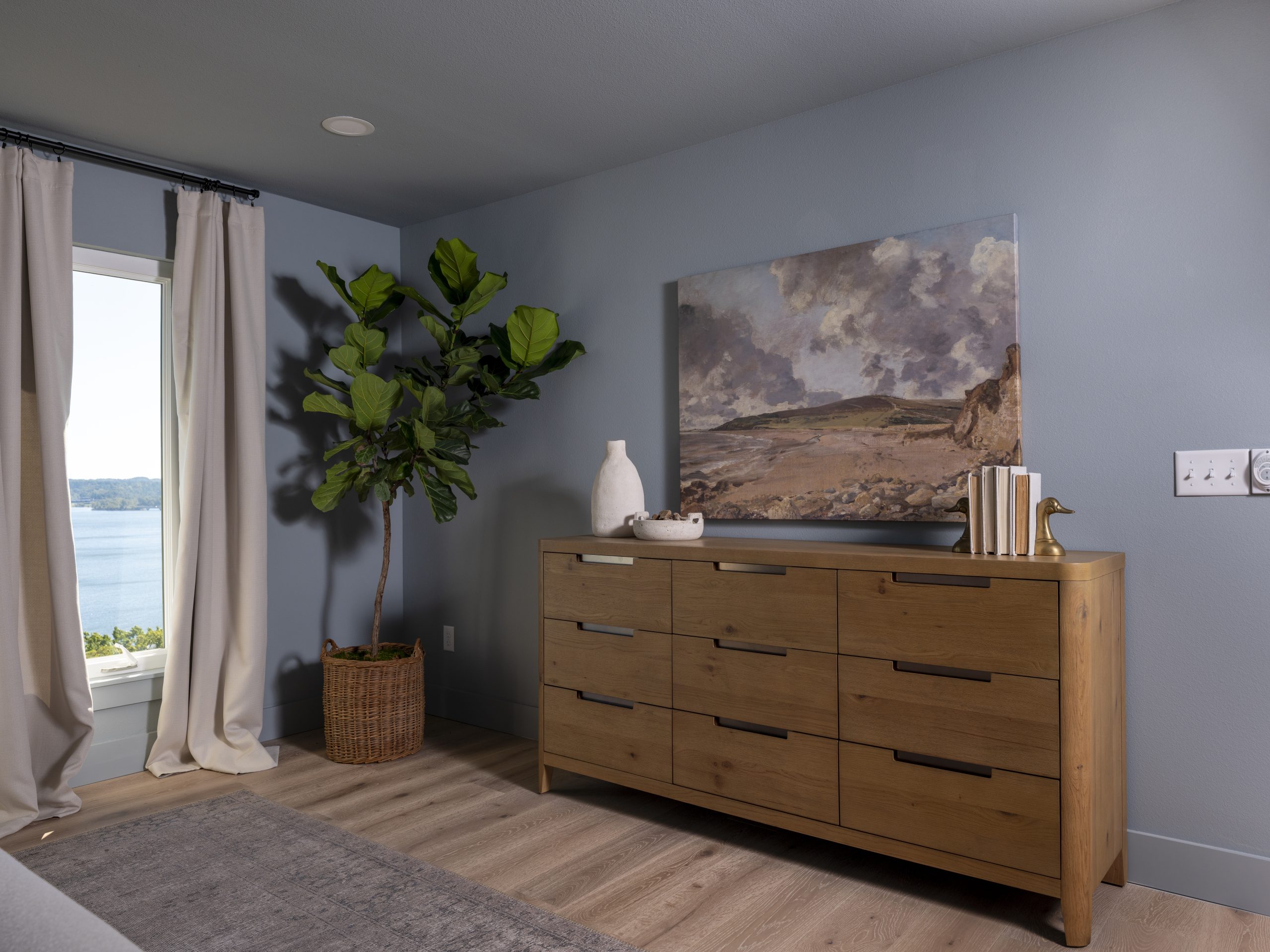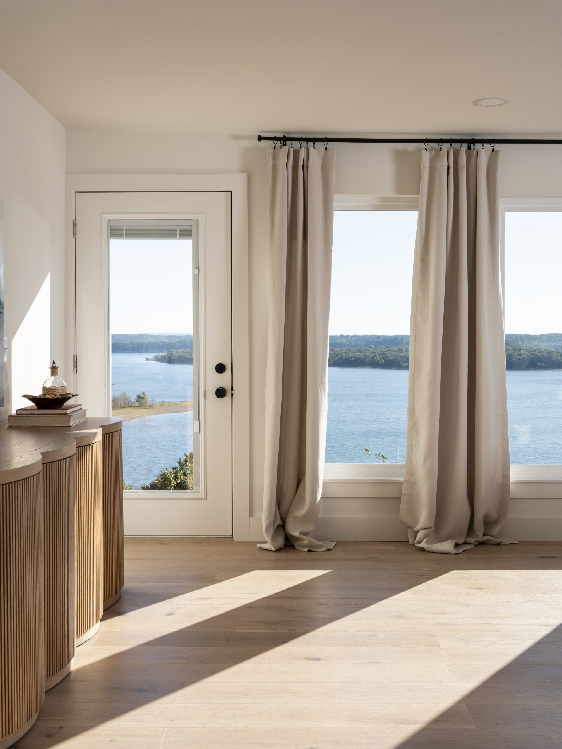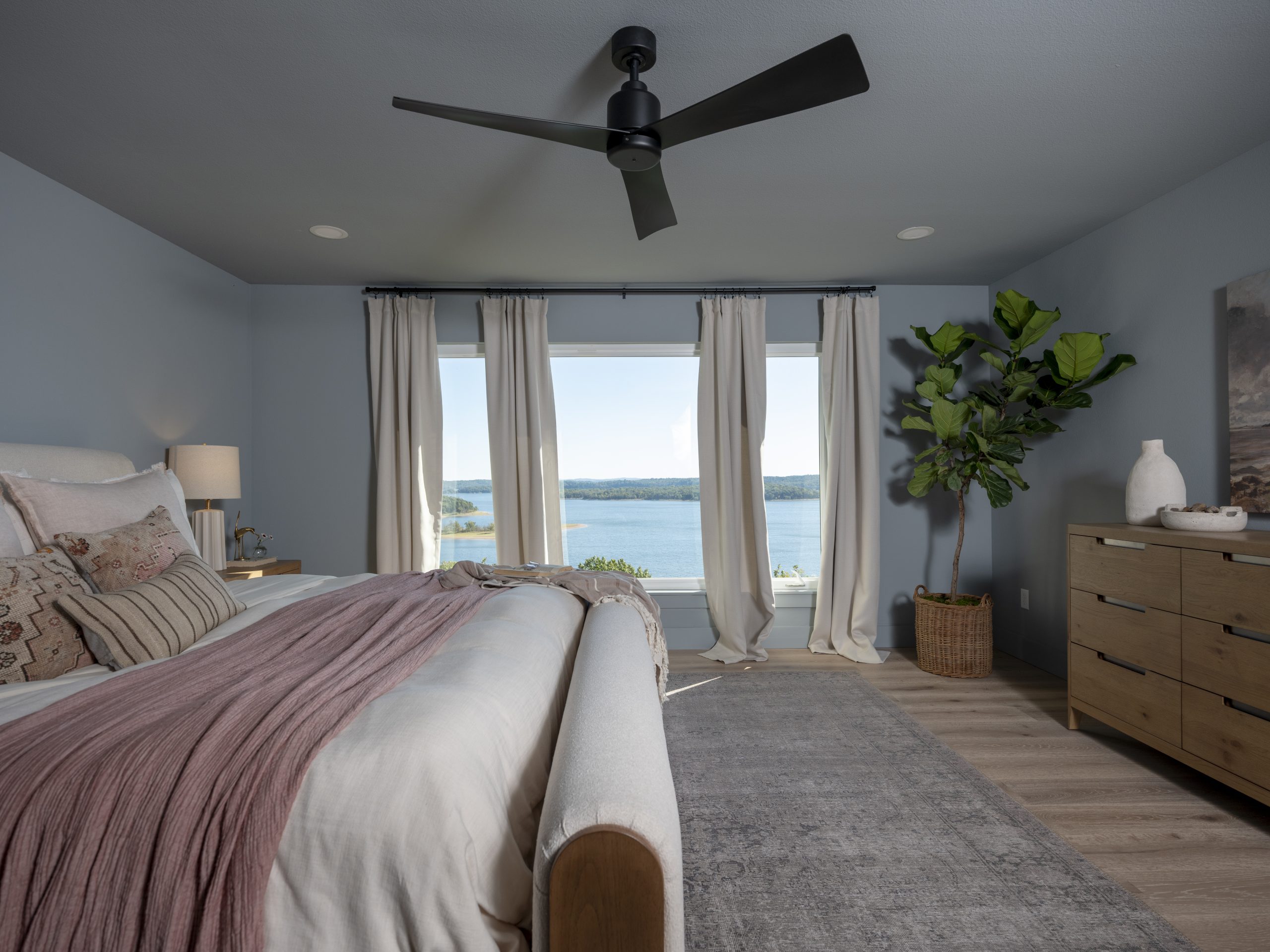 We also closed in an old slider, updated the flooring, and added can lighting along with a modern ceiling fan. The large new window we installed brings in an abundance of natural light and beautifully frames the lake view below. With soft blue walls and fresh window treatments, this room now feels like a peaceful retreat made just for Debbie.