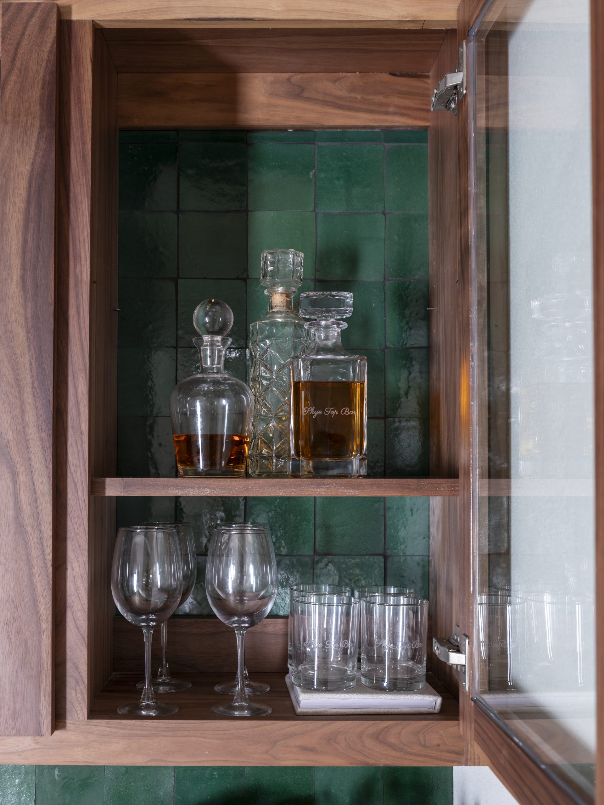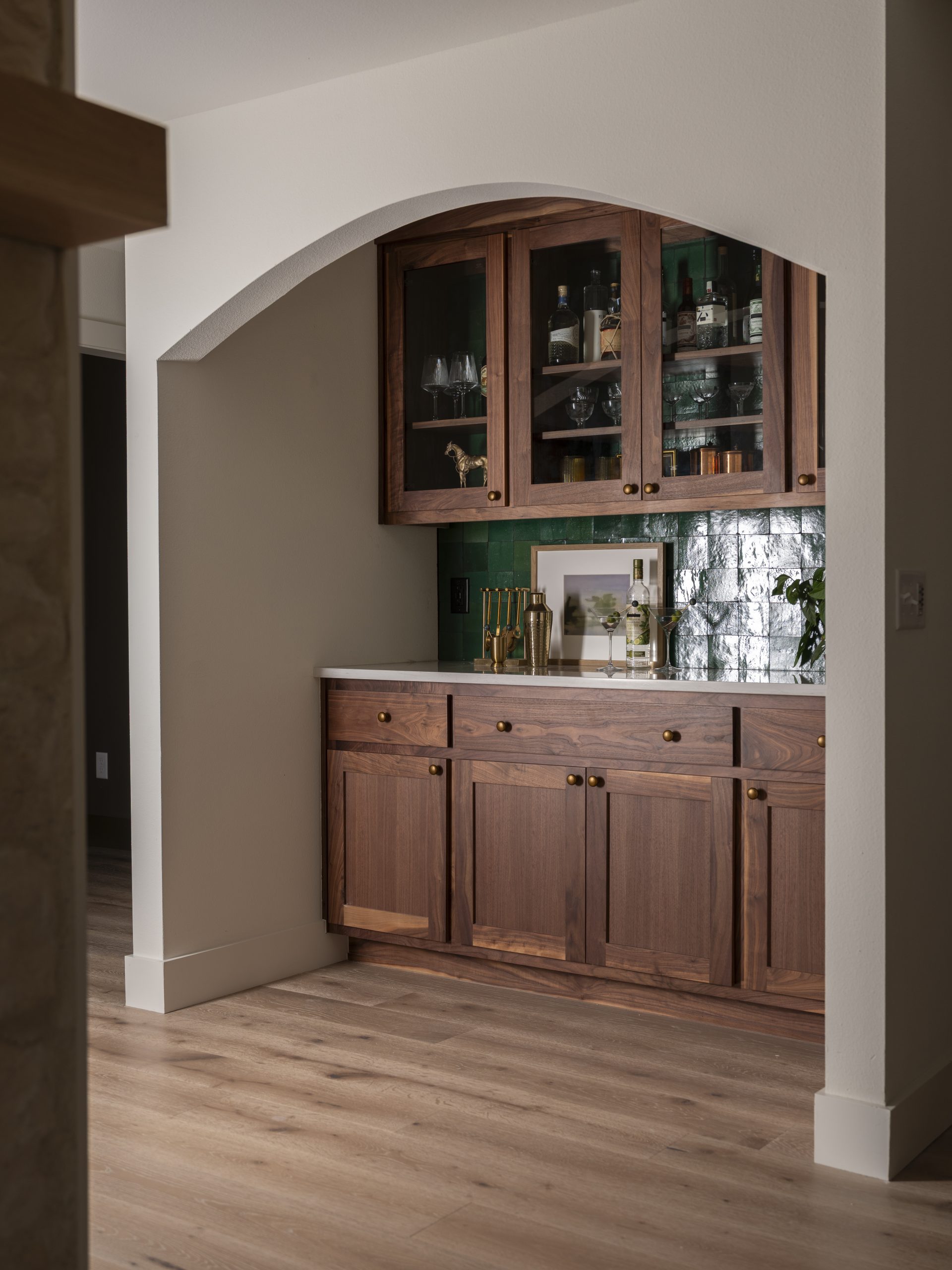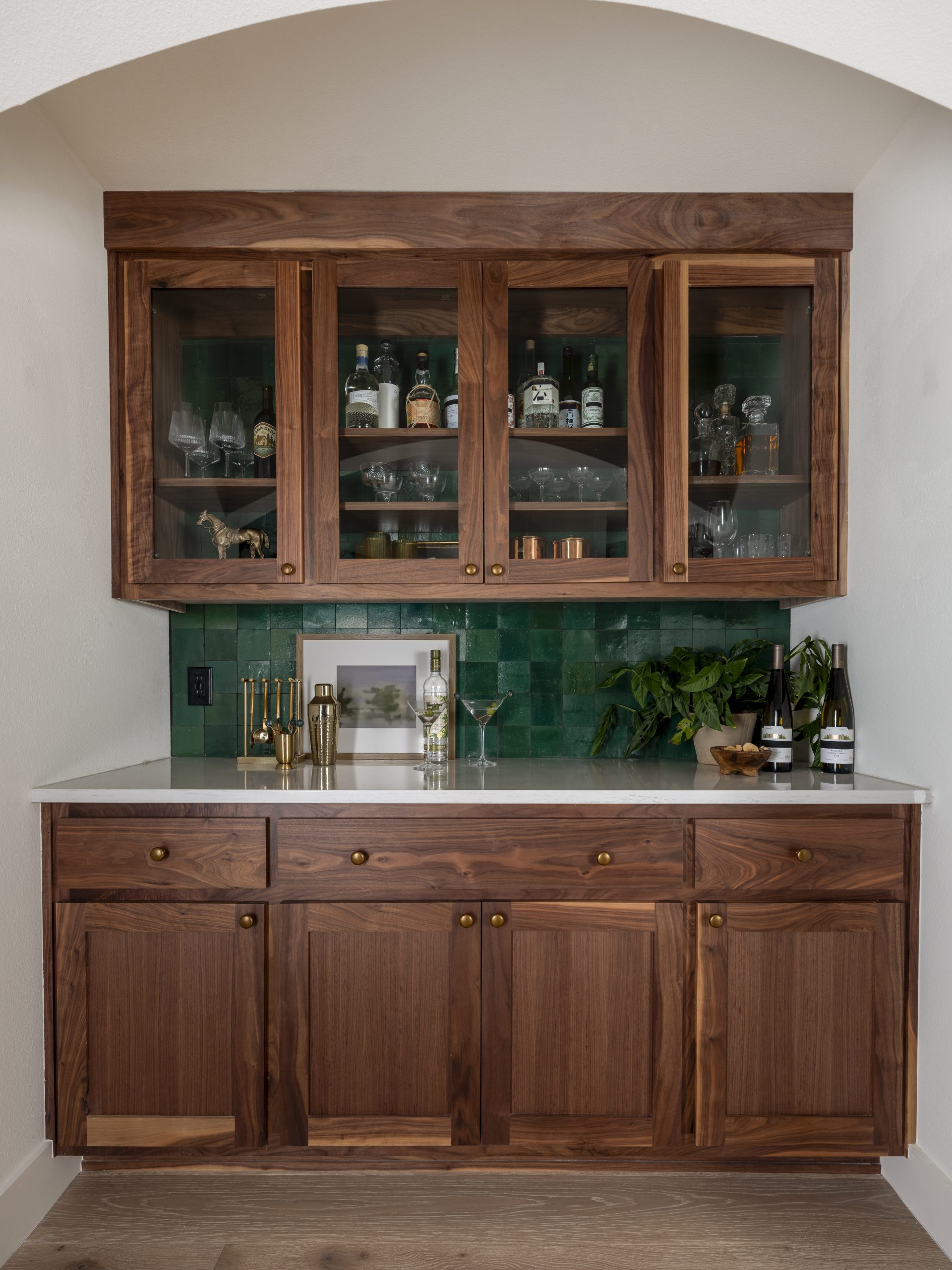 We had an extra space off the living room that was the perfect size for a bar. I had some tile left over from renovating Sylvie’s bathroom, and I knew the rich green tone would make the perfect backsplash to pair beautifully with the arched doorway and the style of this little spot.