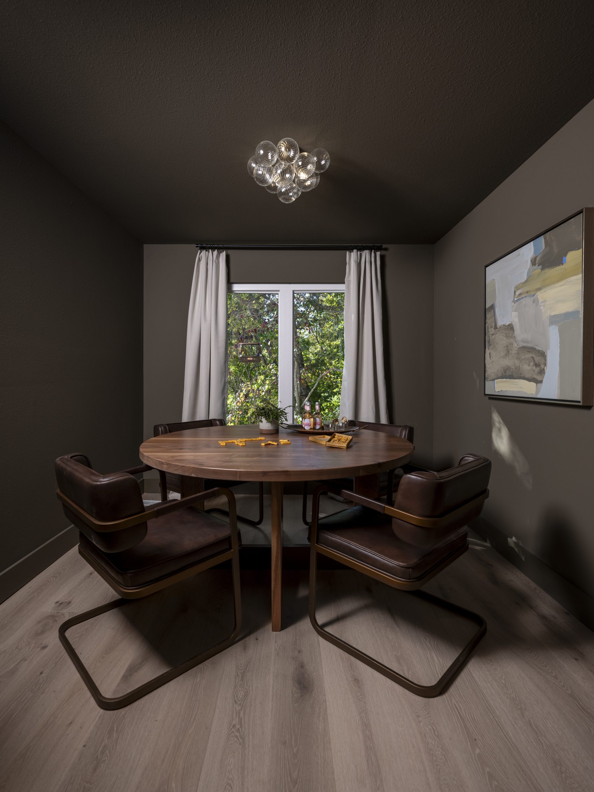 Another area just off the kitchen and living room turned out to be the perfect spot for a cozy game nook. We placed a large, round table here that was handmade by Dave and Austin, creating a place where Debbie and her family can gather for card games and board games. I love how the rich, dark wood of the table plays off the moody green walls, making the space feel both inviting and special.