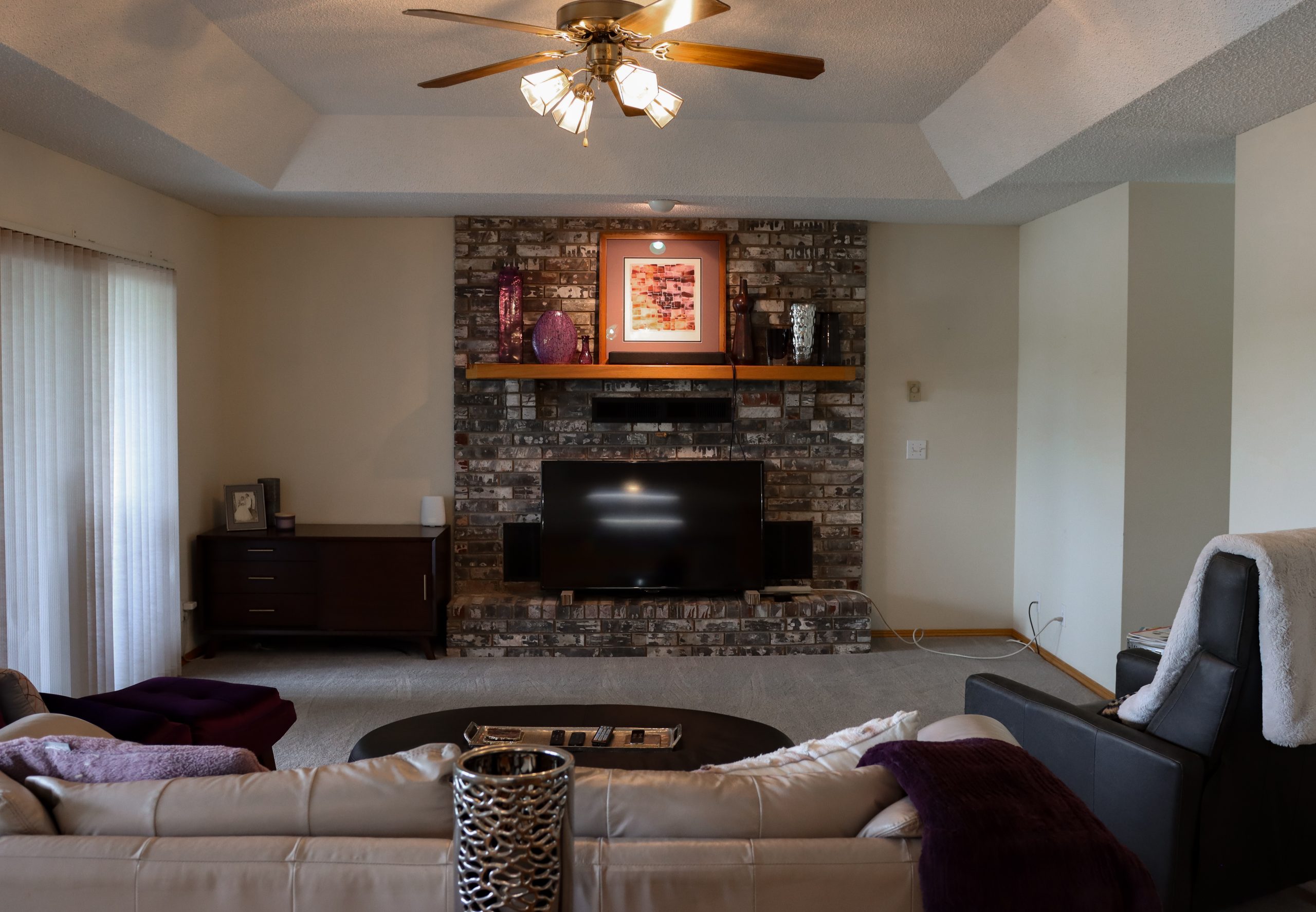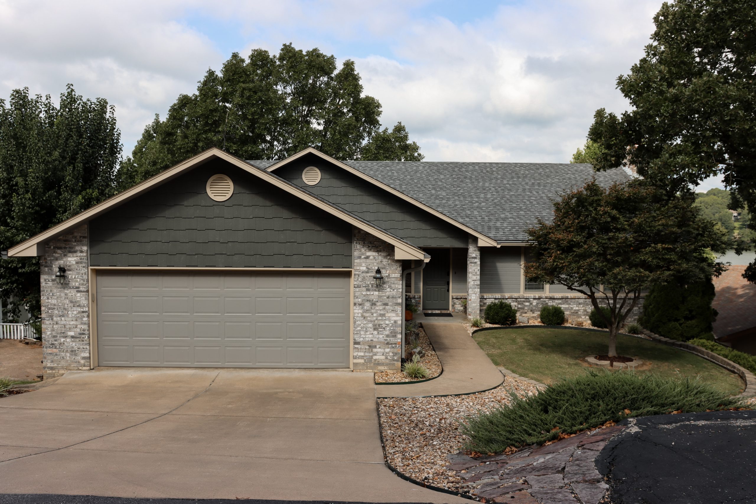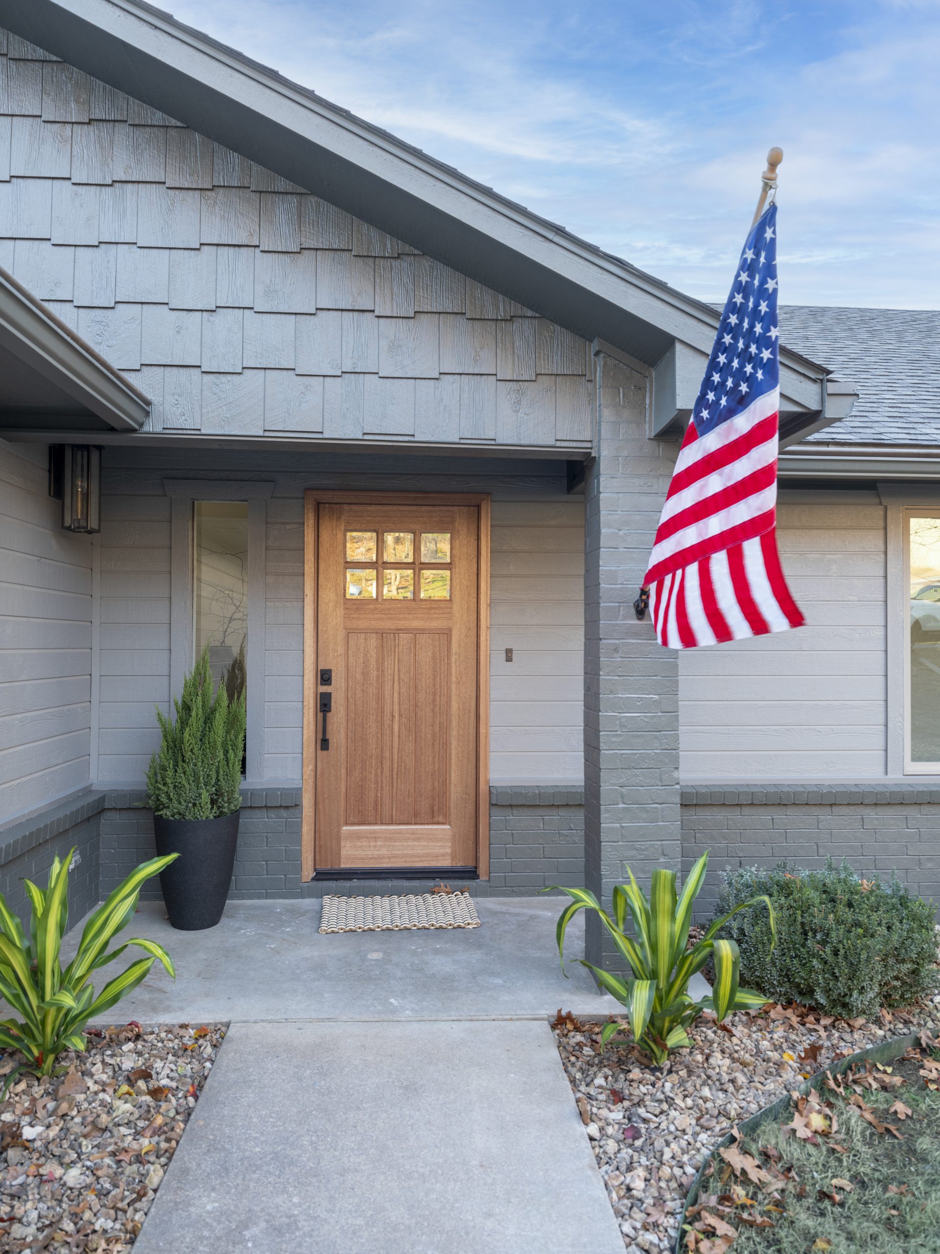 The house was a mix of brick, shingles and different colors. We painted it all one dark color to even it out and make it more modern. The garage door was painted as well, but we left the front door a natural wood to counter the modern exterior and provide some warmth. We also swapped out the light fixtures for larger, more updated ones.
