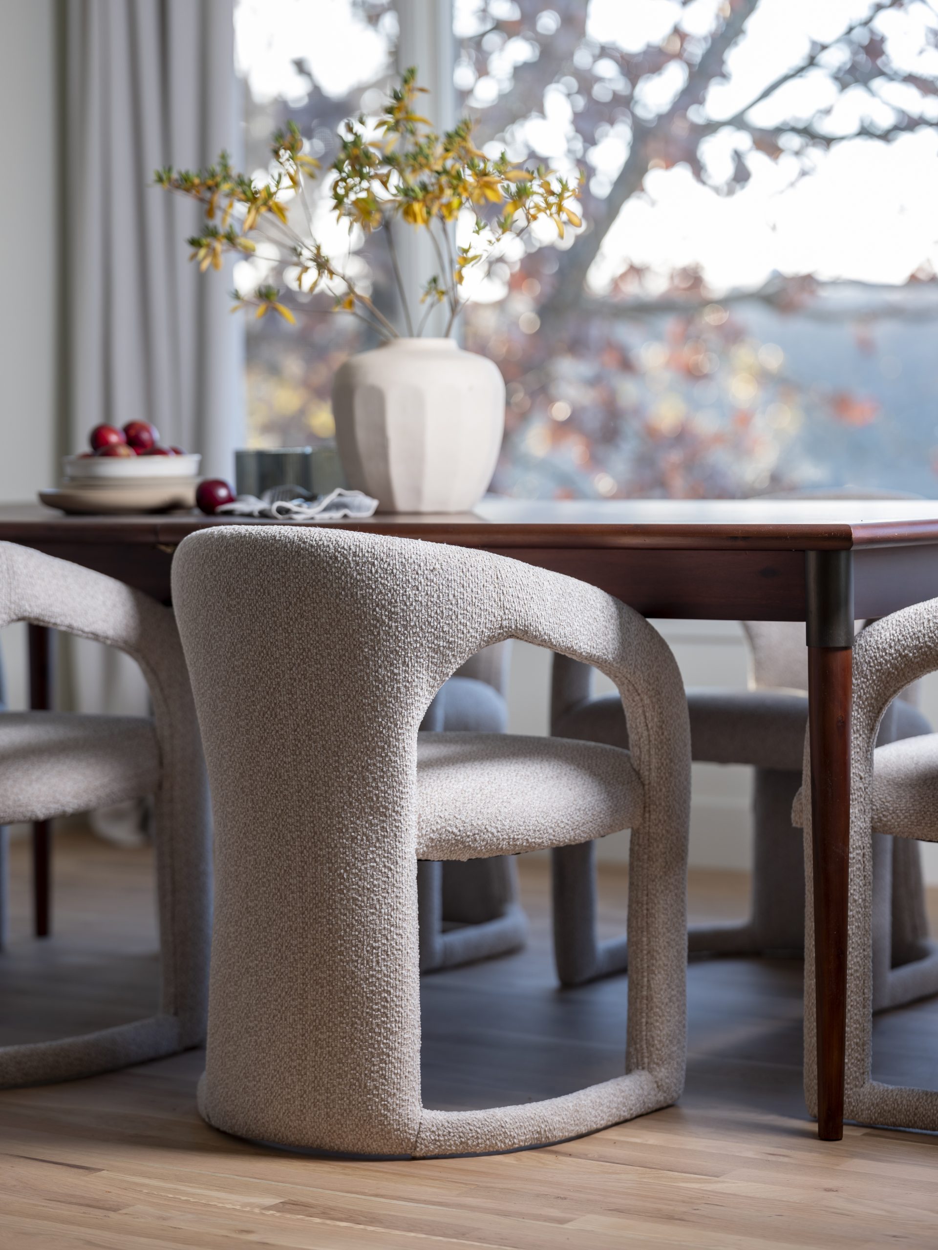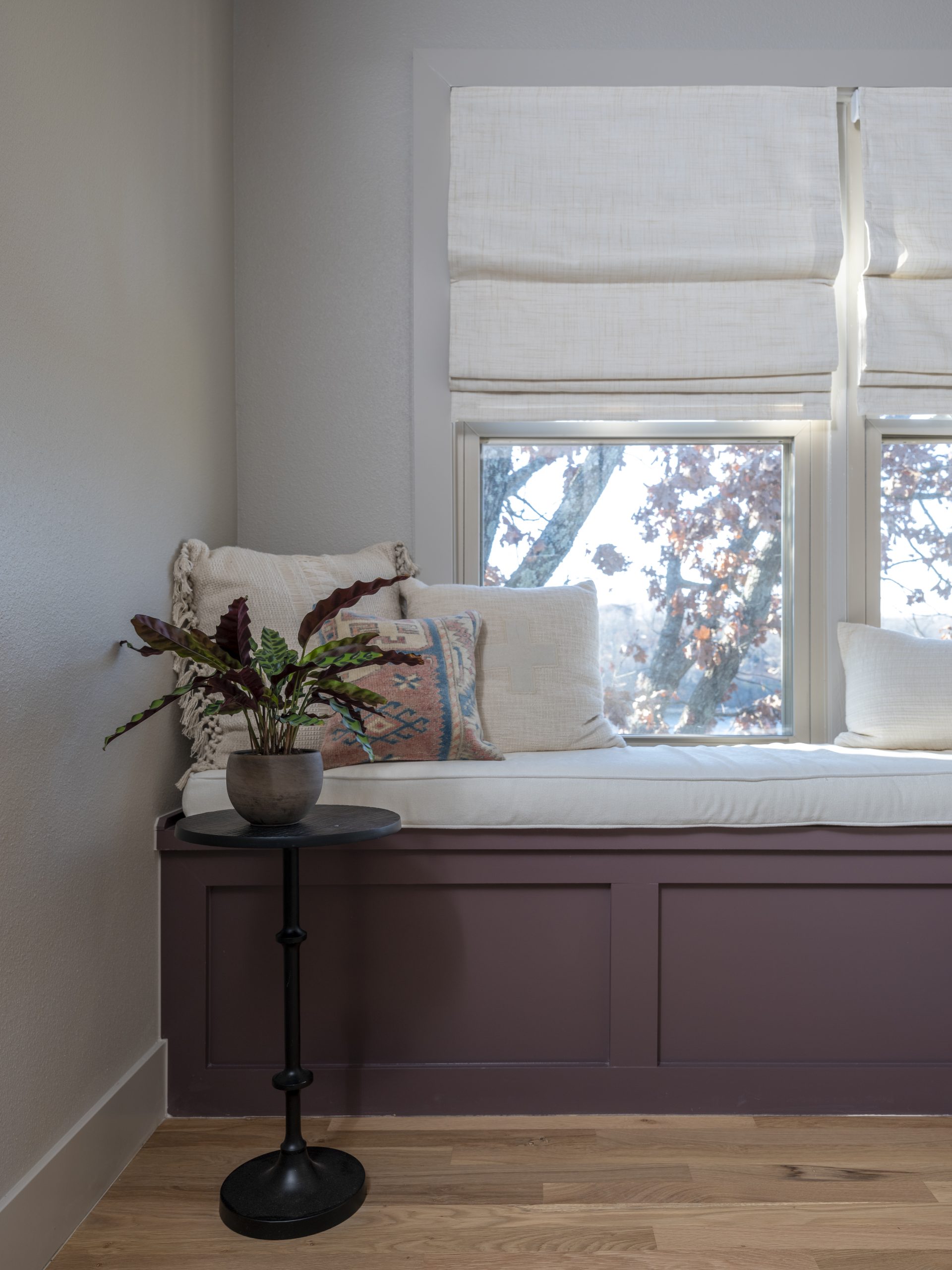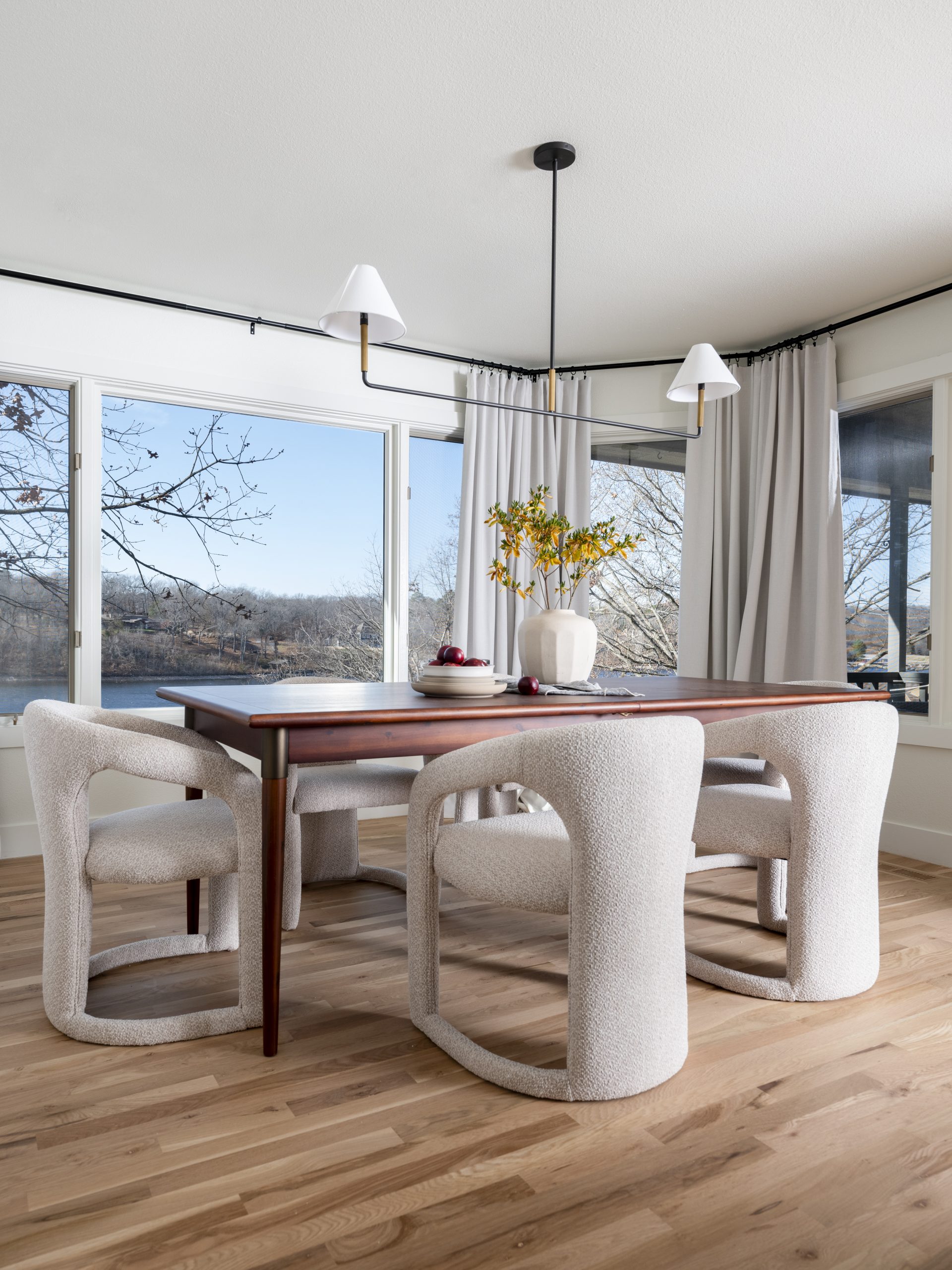 To the side of the kitchen, we created a dining area. There was a full bay window here before but one of the sides had old sliding glass doors. We turned the slider into windows for a more cohesive look and gave all the windows new frames. Then, we finished off the look with new lighting.