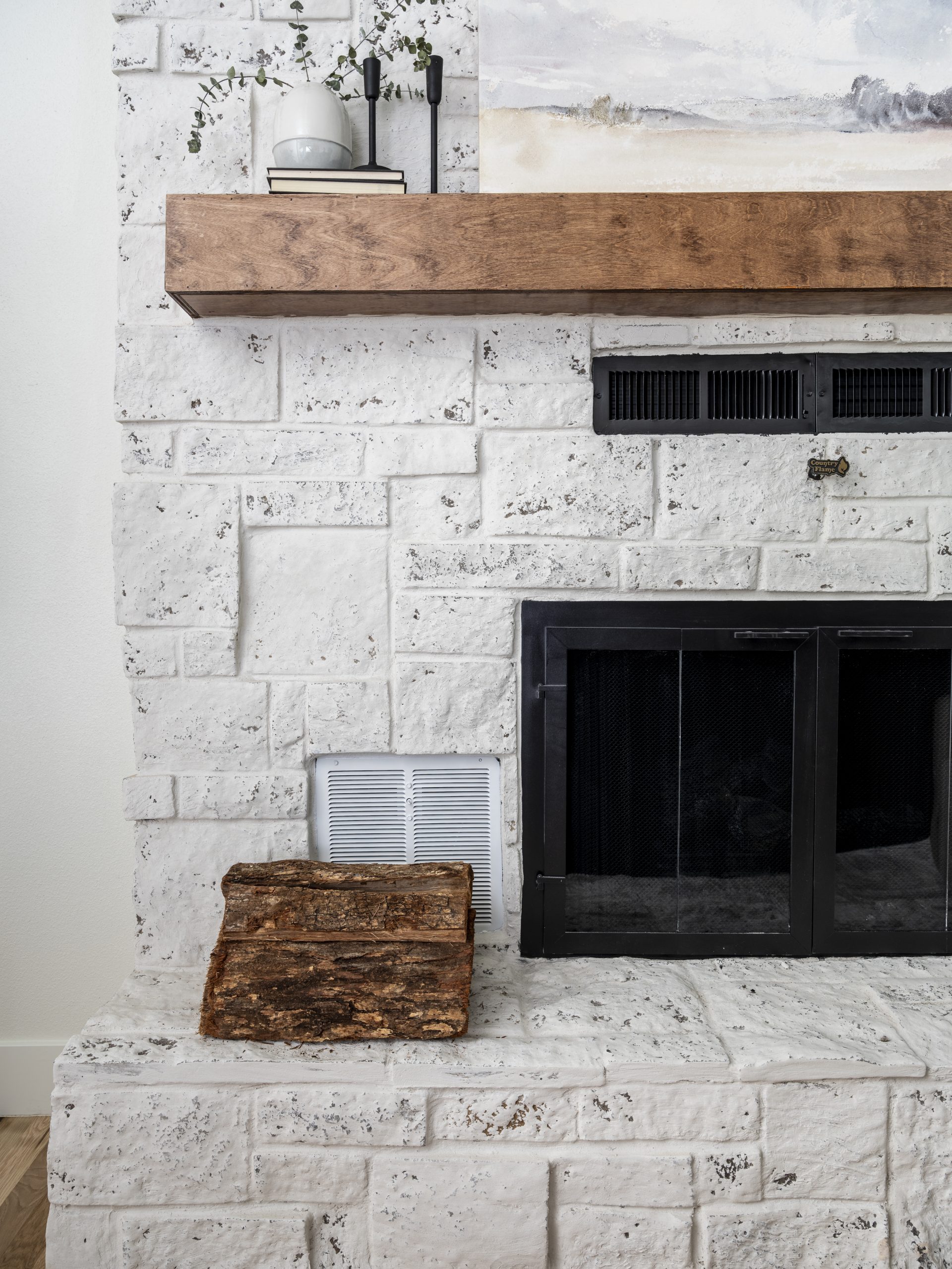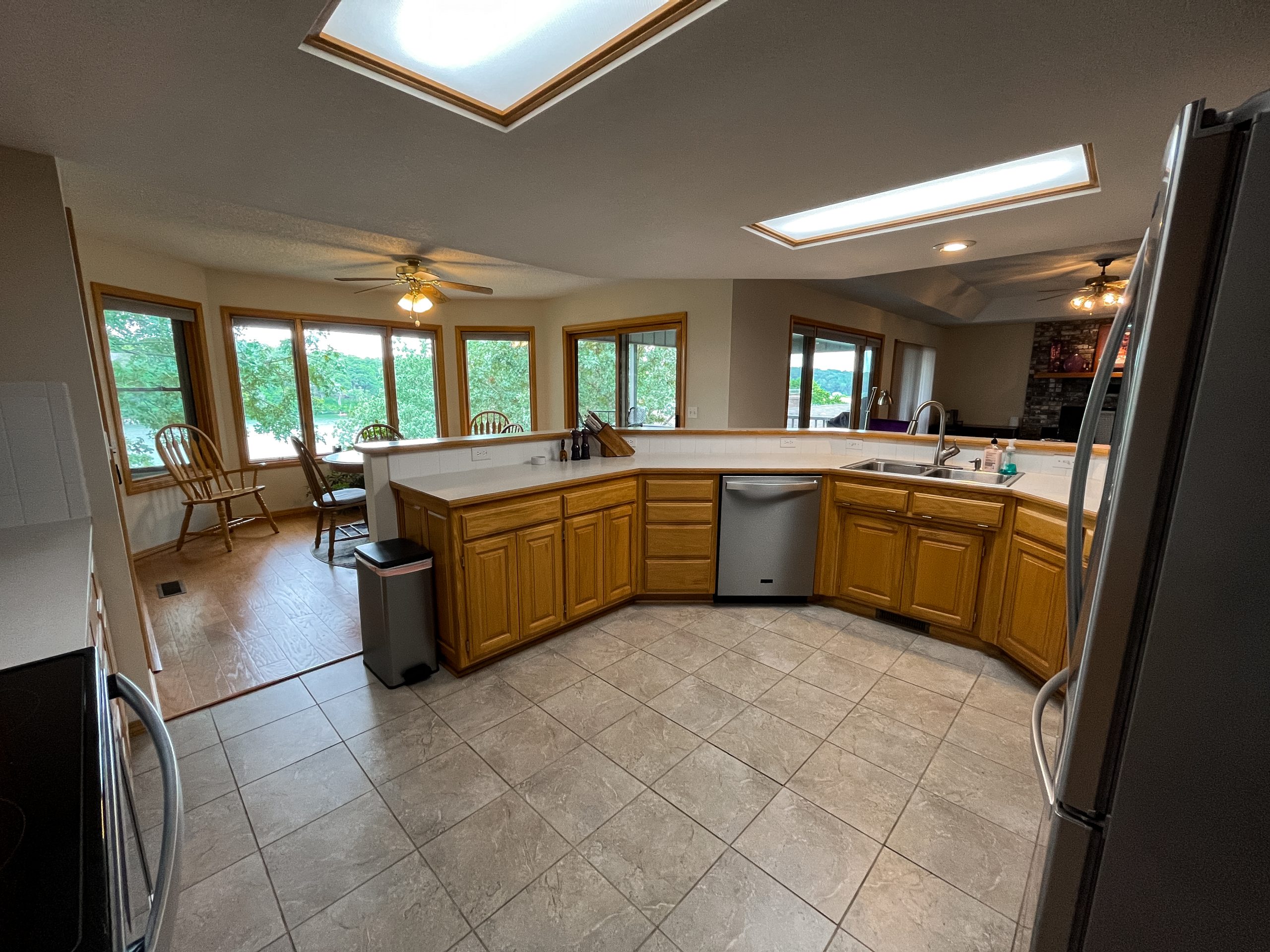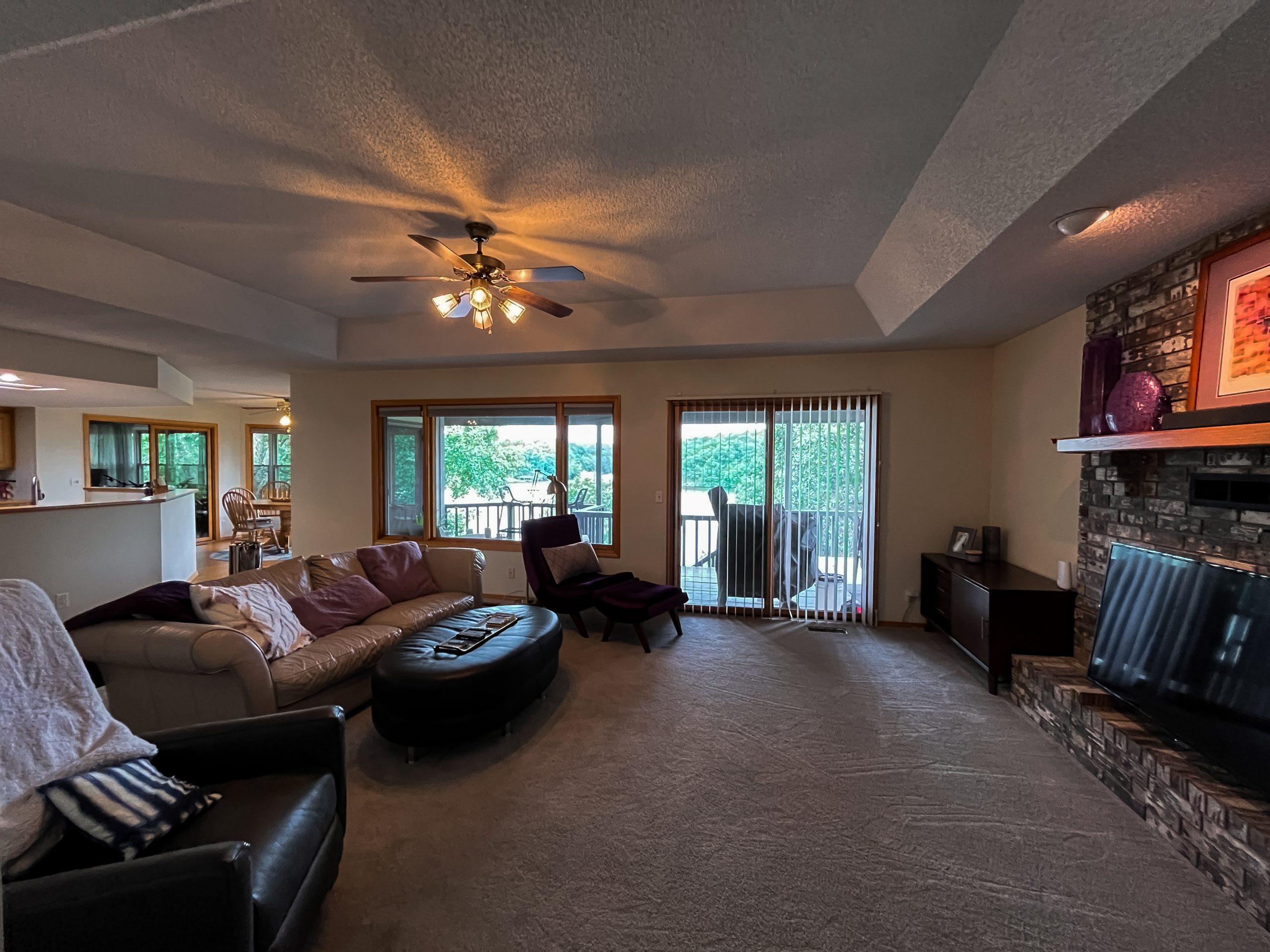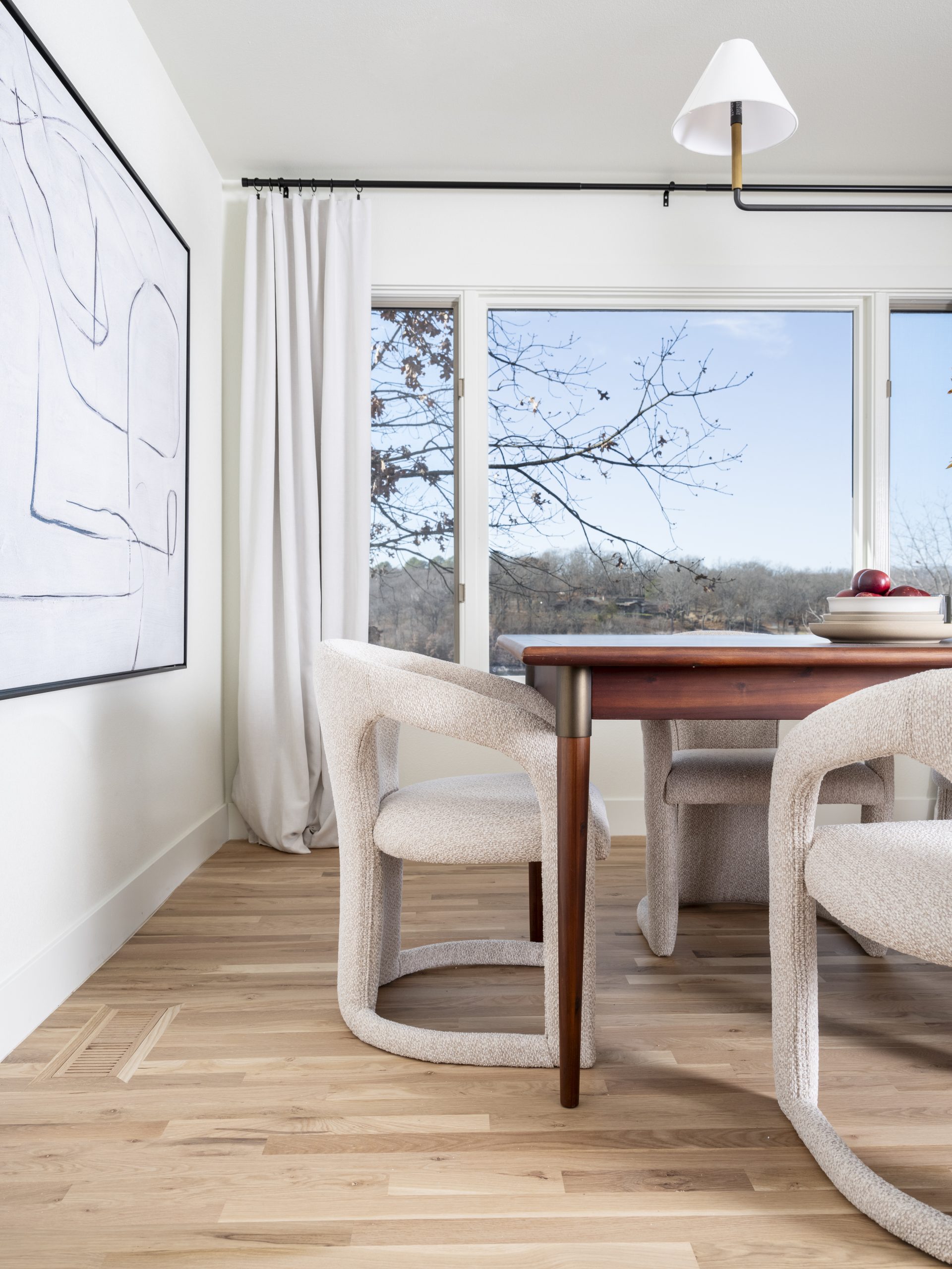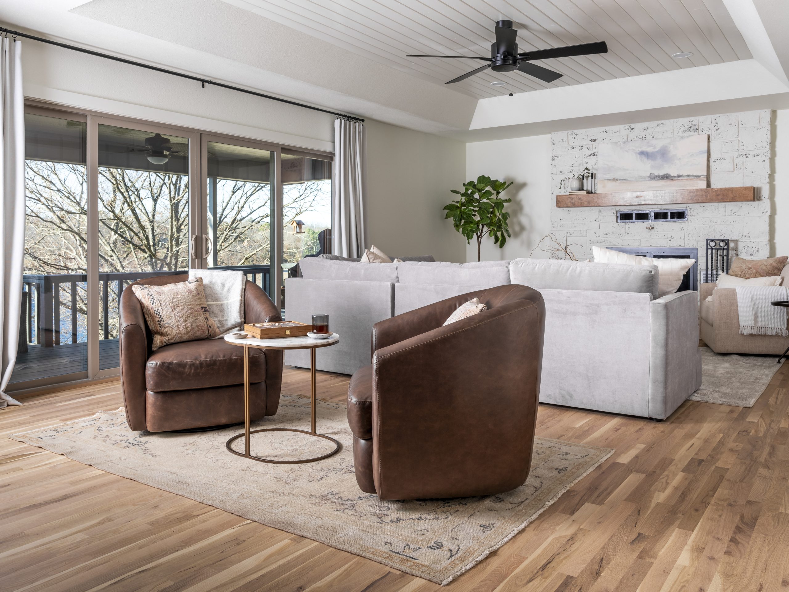 This space already had a nice open concept. It just needed some updating. We scraped the popcorn ceiling and tore out the old carpet. Then, we installed new flooring here and throughout the entire house. The white oak matte finish is soft and modern. Since we had taken out the sliding glass doors from the dining area, we added a big slider here. The old fireplace had the same brick as the exterior of the home. We covered it with stone and applied a mortar wash to lighten the look. These softer shades in the fireplace and the flooring feel more in sync with the lightness of a lake house.