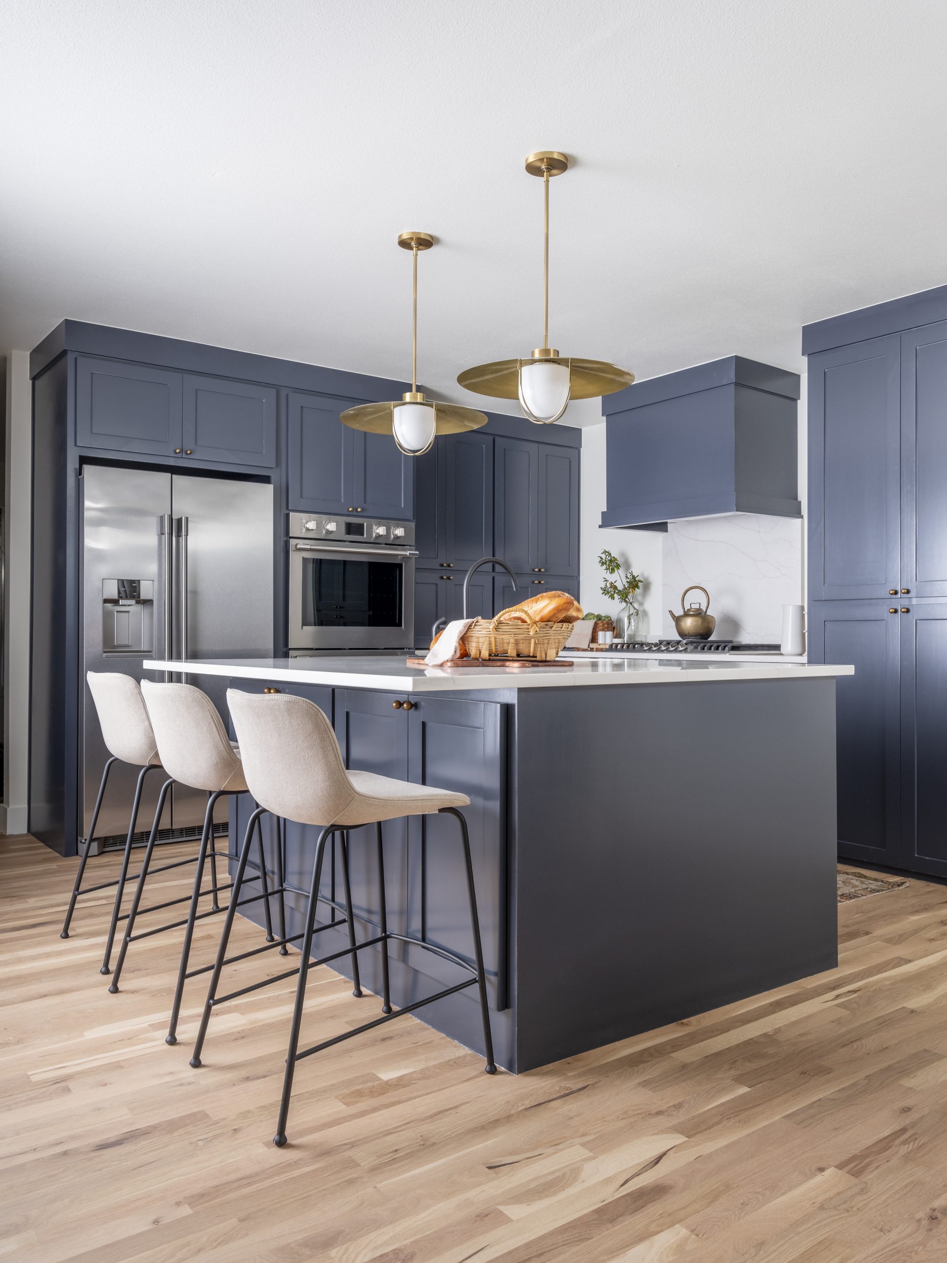 One of the main things Rick and Lisa wanted to change was this weird hexagon-shaped kitchen. It had a large peninsula island that forced you to walk a long way around to get inside the kitchen. It was dated and not functional at all. We completely gutted the kitchen, removing a wall and the tray ceiling and making it more of an open concept. We opted for a smaller island this time for better flow. Lisa likes dark cabinets, so we chose this dark blue shade that also brings weight to this side of the house and mimics the blue water of the lake.