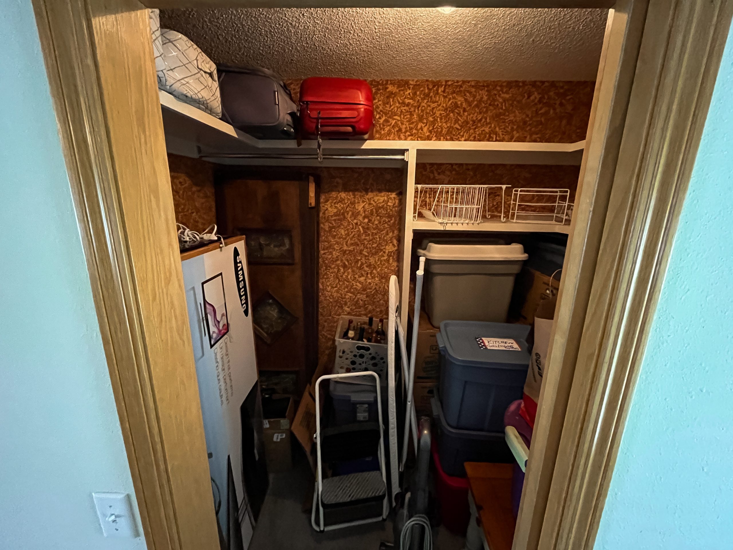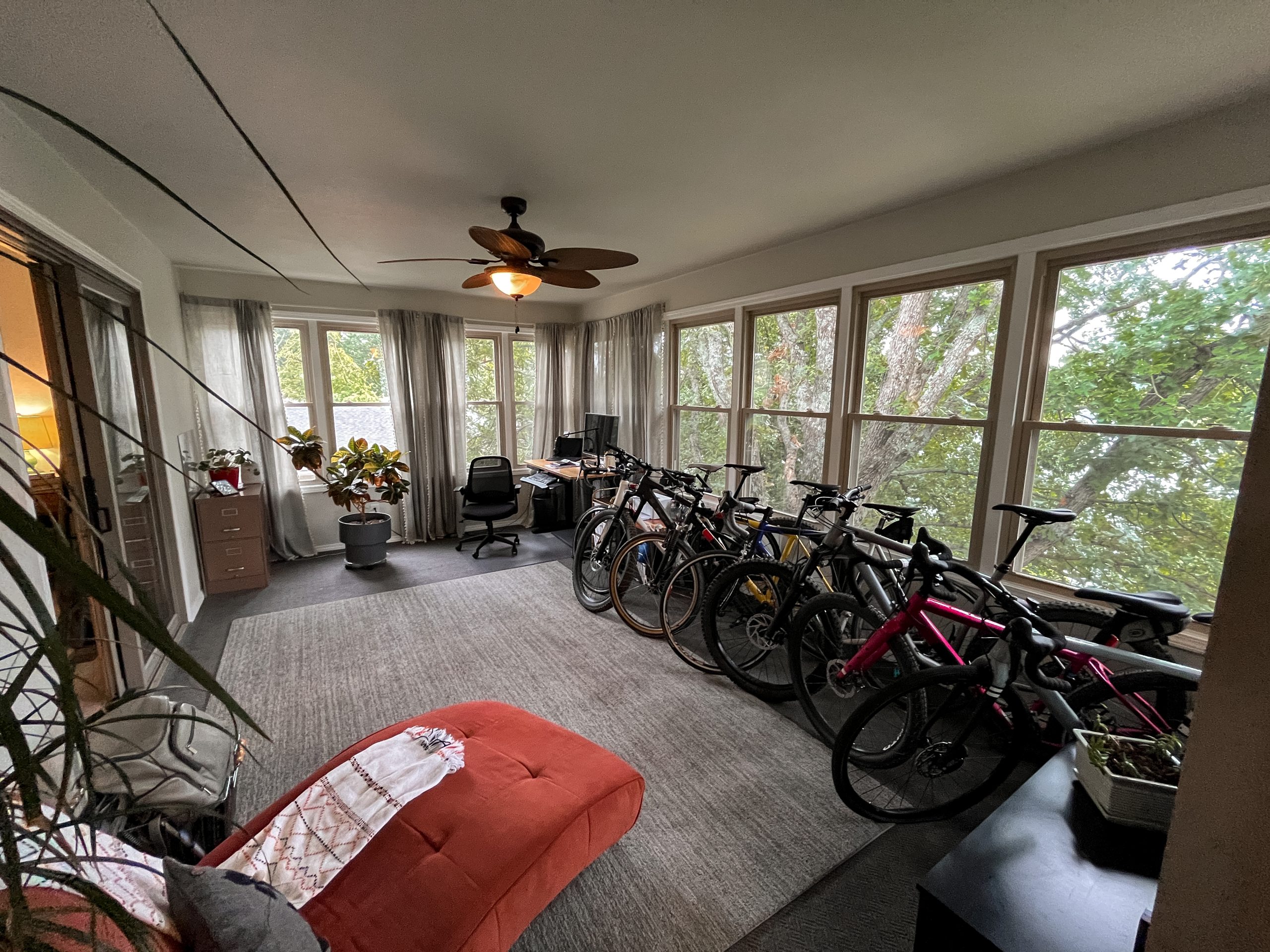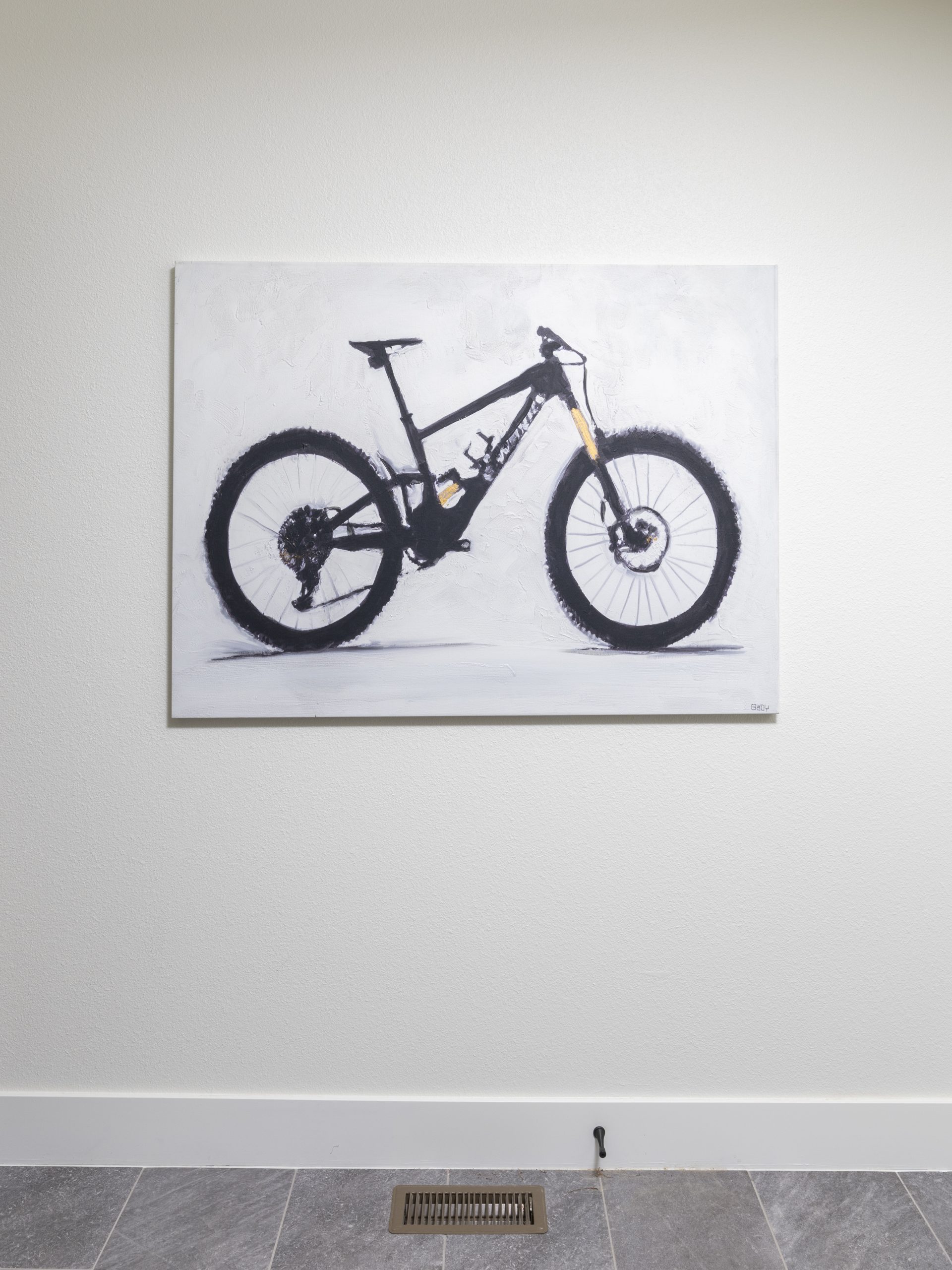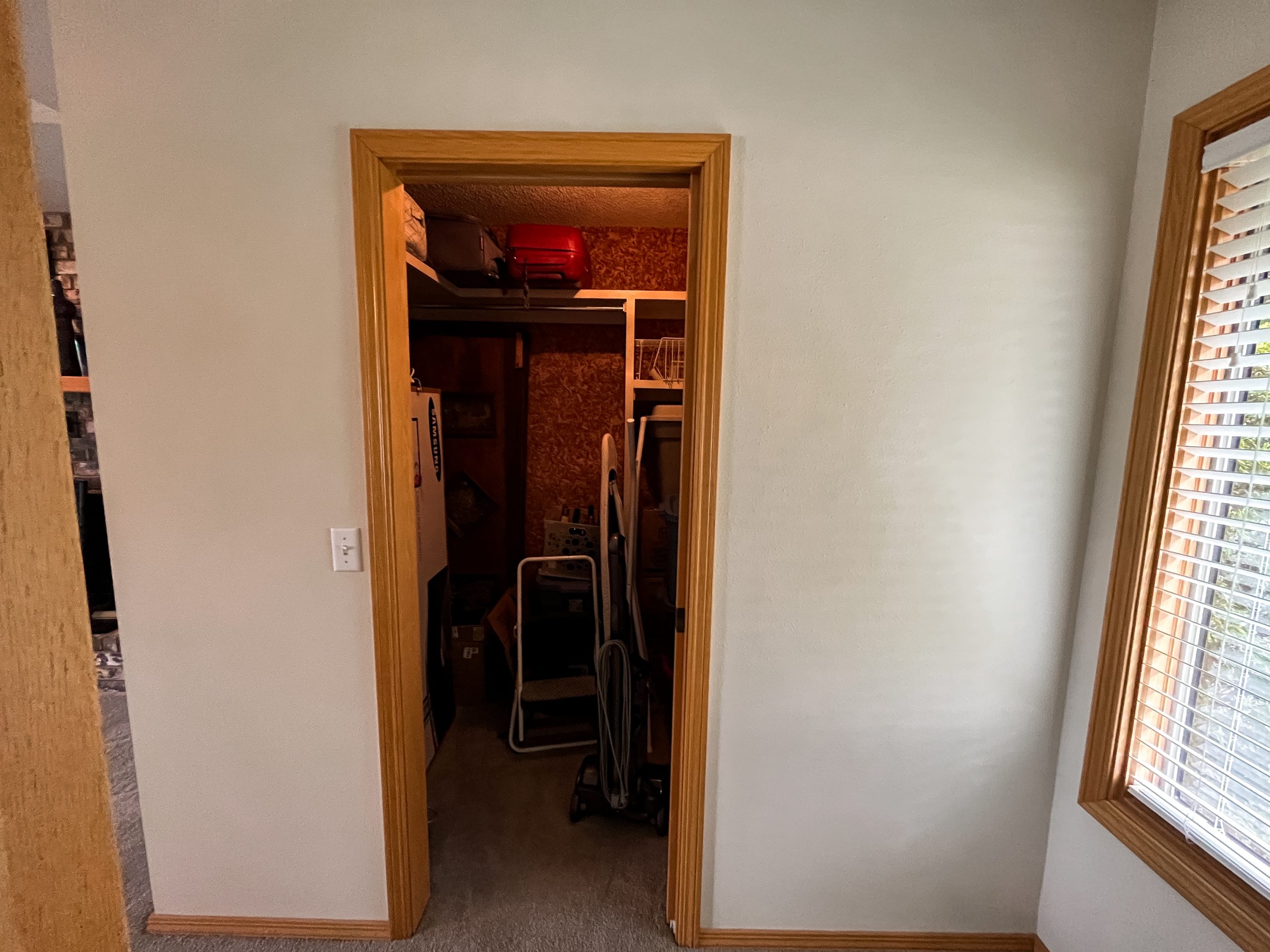 This was a small laundry room which we made larger by absorbing some of the space from the main bedroom closet on the other side of the wall. With the larger size, we were able to turn it into a laundry room and bike room. This was much more convenient for Rick who was walking his bikes through the house to store them in the sunroom. Dave installed a bike station and kit on the wall that moves around and adjusts for storing tools. Now Rick has easier access to take his bike straight out through the garage.
