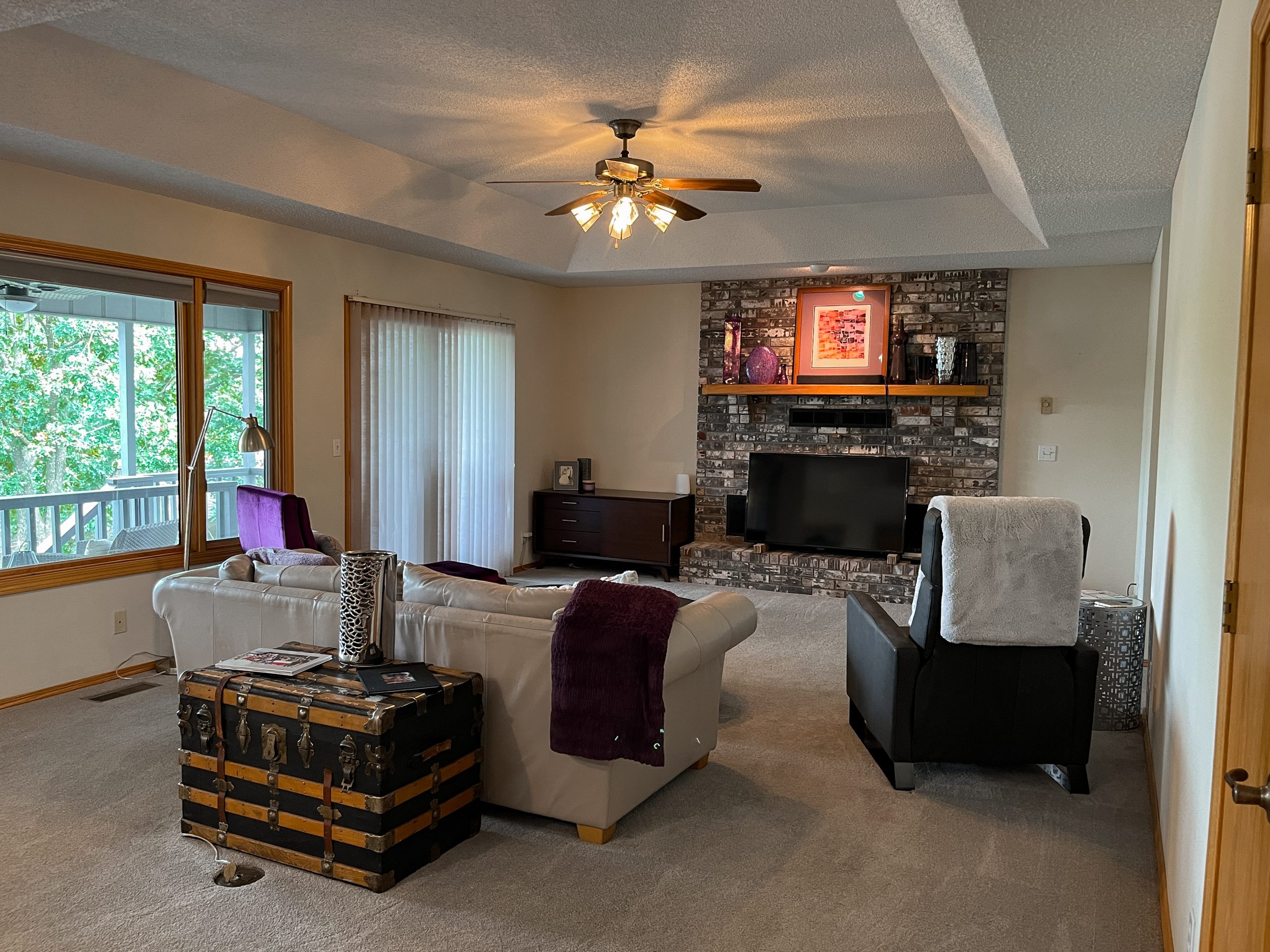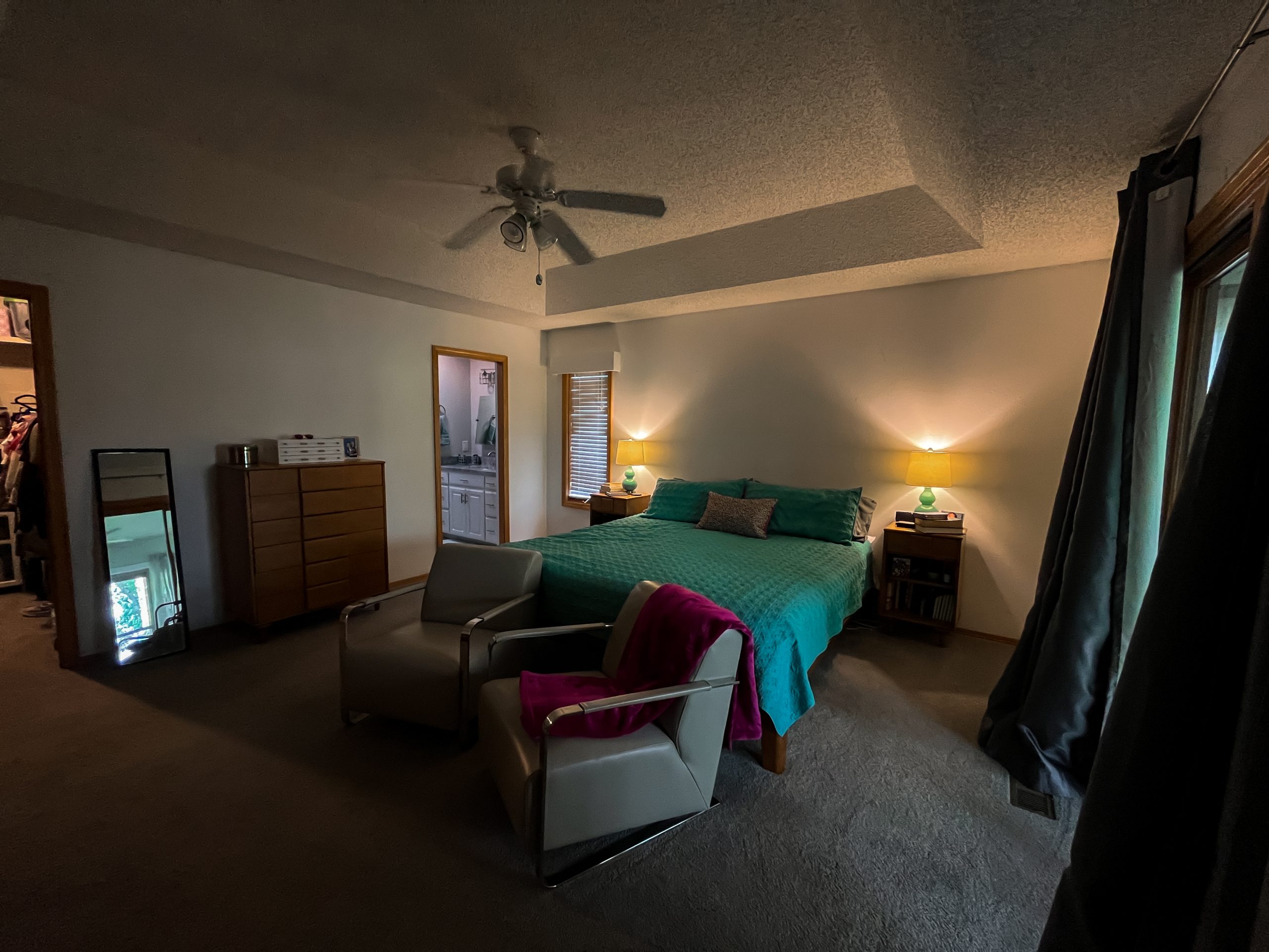The bedroom needed some updating. We gave it a fresh coat of paint, new trim, a new ceiling fan, new window treatments and new canned lighting. We also replaced the old carpet in here with the same new flooring as the rest of the house. This room used to have an old sunroom next to it where Rick had been storing his bikes. We transformed that into a sitting room with a desk for Lisa. She had wanted an office space. There was enough space here to also give them a large walk-in closet, as well as a large window seat which Dave framed out. It adds a touch of coziness to Lisa’s office and has a nice view of the beautiful lake below.