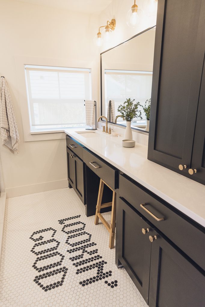 With Bowman’s approval, I worked with her mom on just the right saying to install in her bathroom. Penny tile in hand, I went to see Cynthia and we talked about how the tile would look and what it should say. She reminisced on the 1950s song, “Hey, Good-Lookin’” by Hank Williams that she sang when Bowman was a child. She came up with “lookin’ good,” a perfect sentimental touch for this bathroom space!