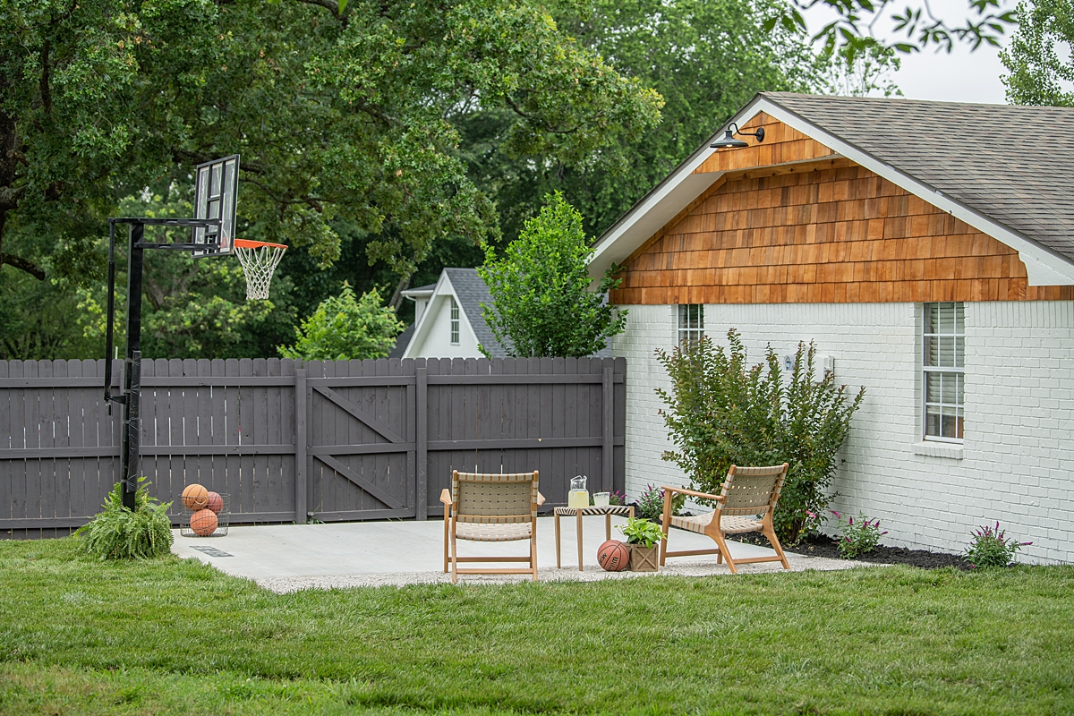 We had one more surprise to show Kimberley with this reveal. Her sons, who have no other place but the street to shoot baskets, are also wading through their teenage years without their dad, whose consistent message to them was to “never give up.” So we made a new basketball court for the boys and added that message right under the goal.