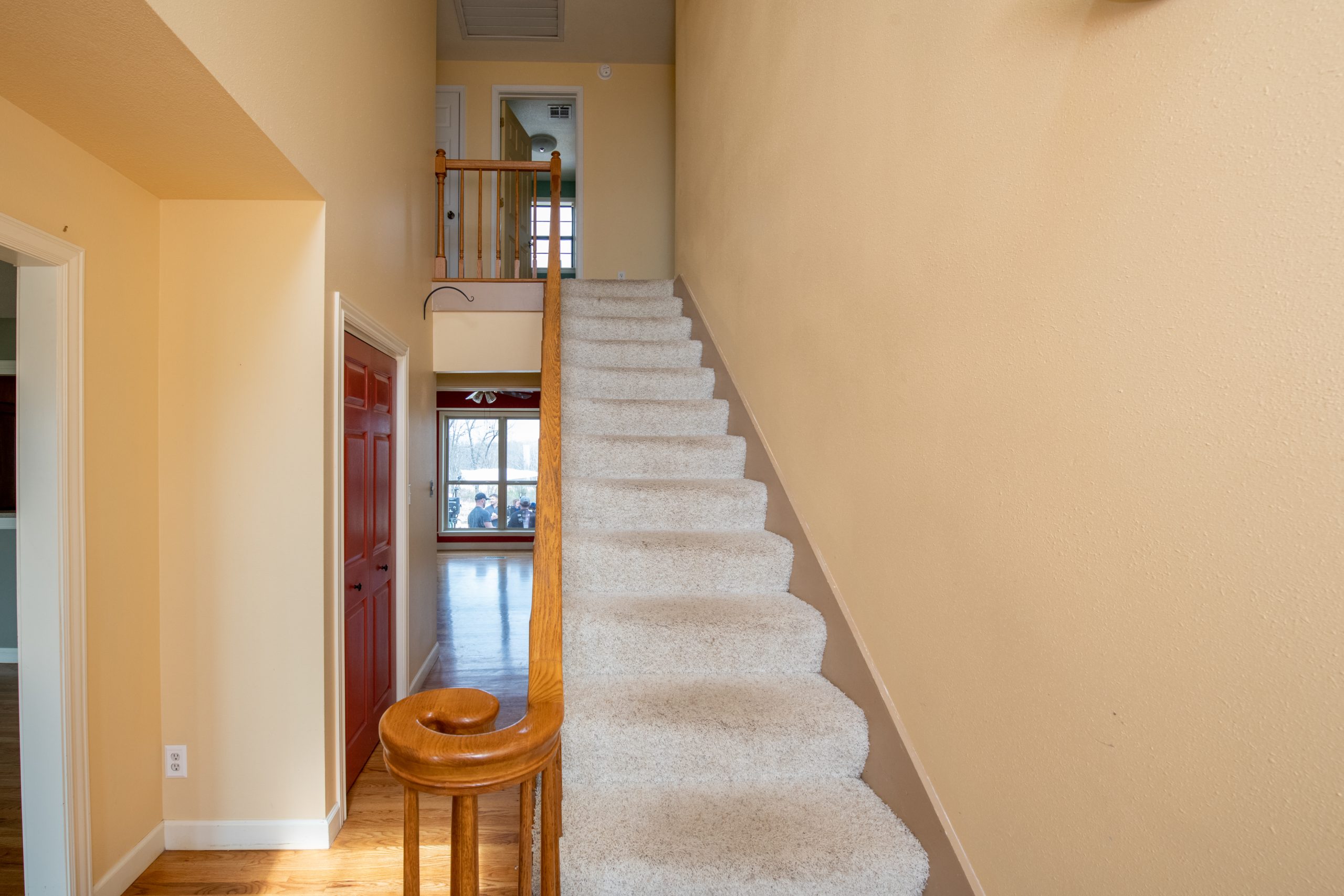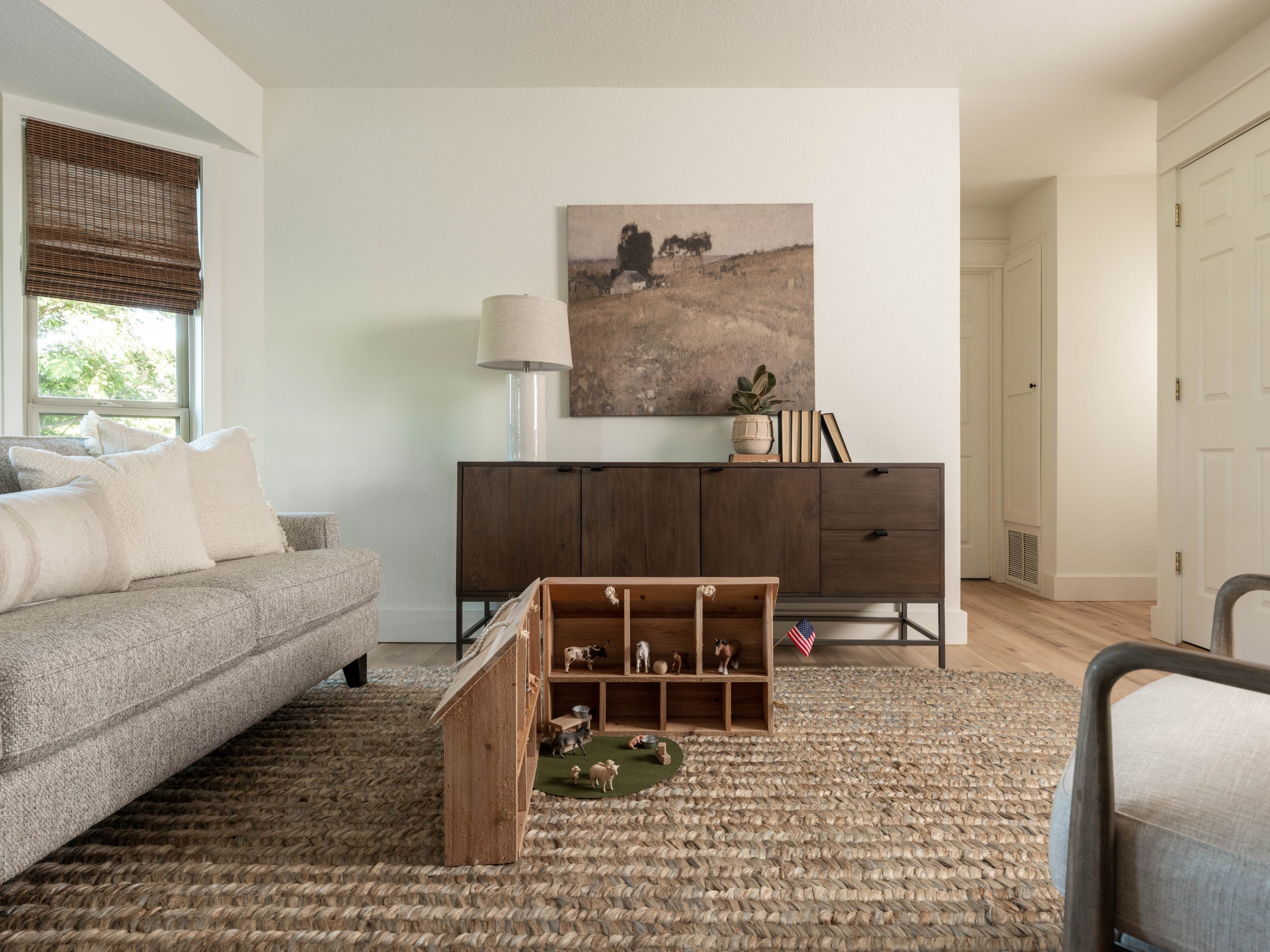 The floor in the living room, and throughout the entire house, is a non-glossy white oak. It’s the same flooring I have at home, and it’s great for kids and animals because it holds up really well against scratches. The staircase leading upstairs is visible from the entryway and living room. We replaced the old handrail with a more modern black metal version.