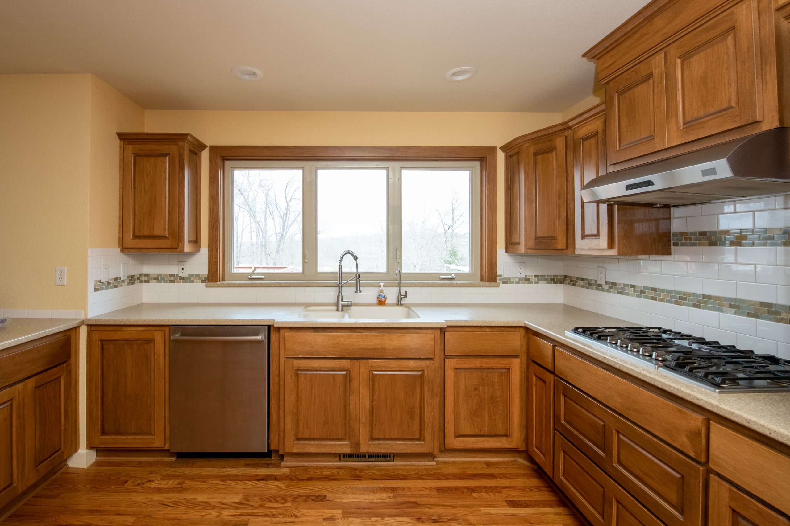 To the white countertops and white cabinets, we added some contrast using black hardware and a touch of shine from this gorgeous marble backsplash. We didn’t have a lot of height in this part of the house so instead of putting in hanging light fixtures, we went with canned lights and these beautiful wall sconces that flank the hood. The sliding glass doors here give plenty of light and allow the Coughenours to see their animals.