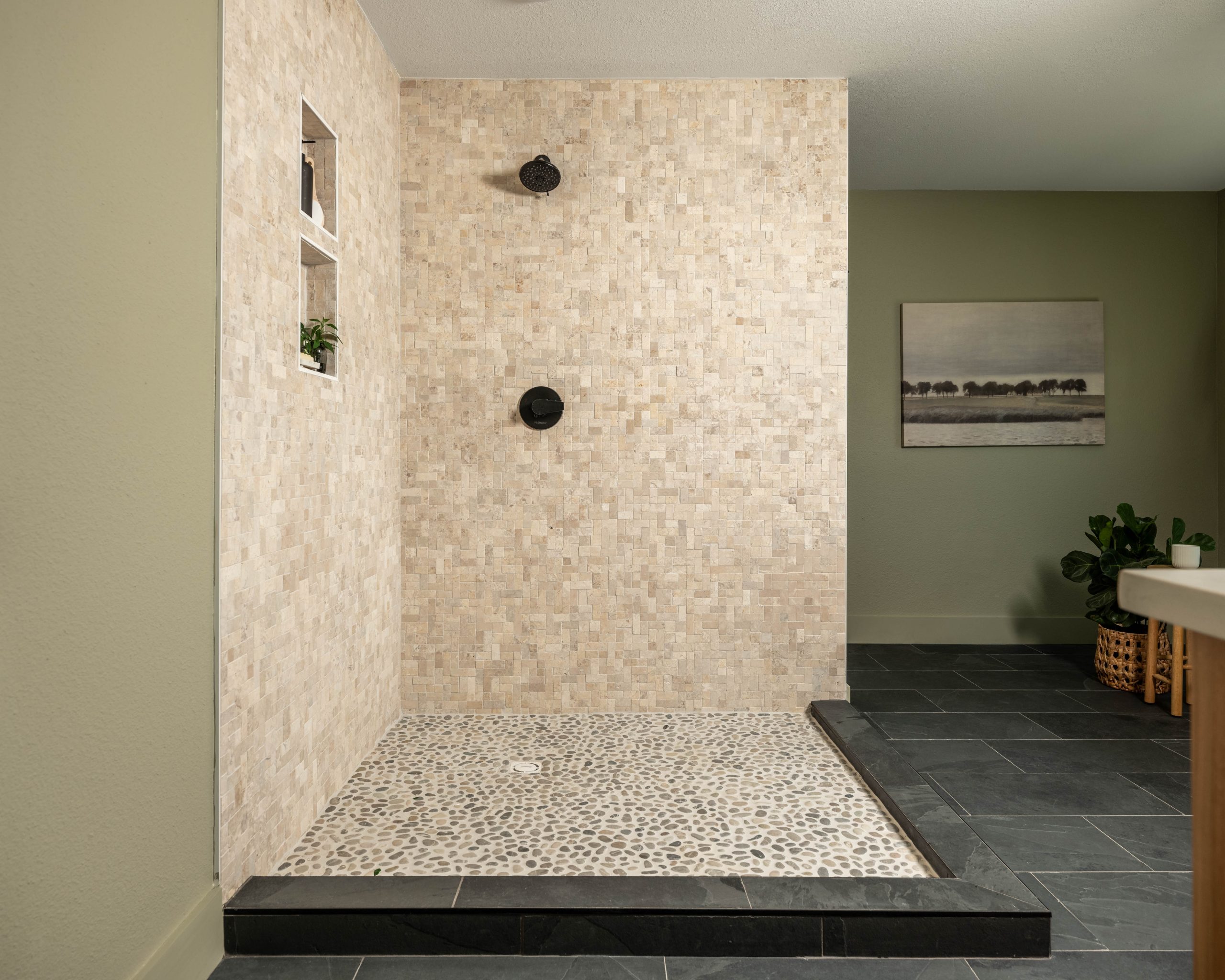 The bathroom, which also came from the space we took from the garage, is equally large. There’s plenty of space for an old-fashioned (yet modern) soaking tub, a stand-up shower (the custom glass didn’t arrive in time for the reveal, we installed it after! But, yes, there is glass!), water closet and a double vanity. The black slate matches the flooring we used for the laundry room and mudroom, and it ties in the modern black hardware, mirrors and light fixtures. To counter the black, we added warm organic touches with the stone flooring in the shower and the natural wood finish on the vanity.