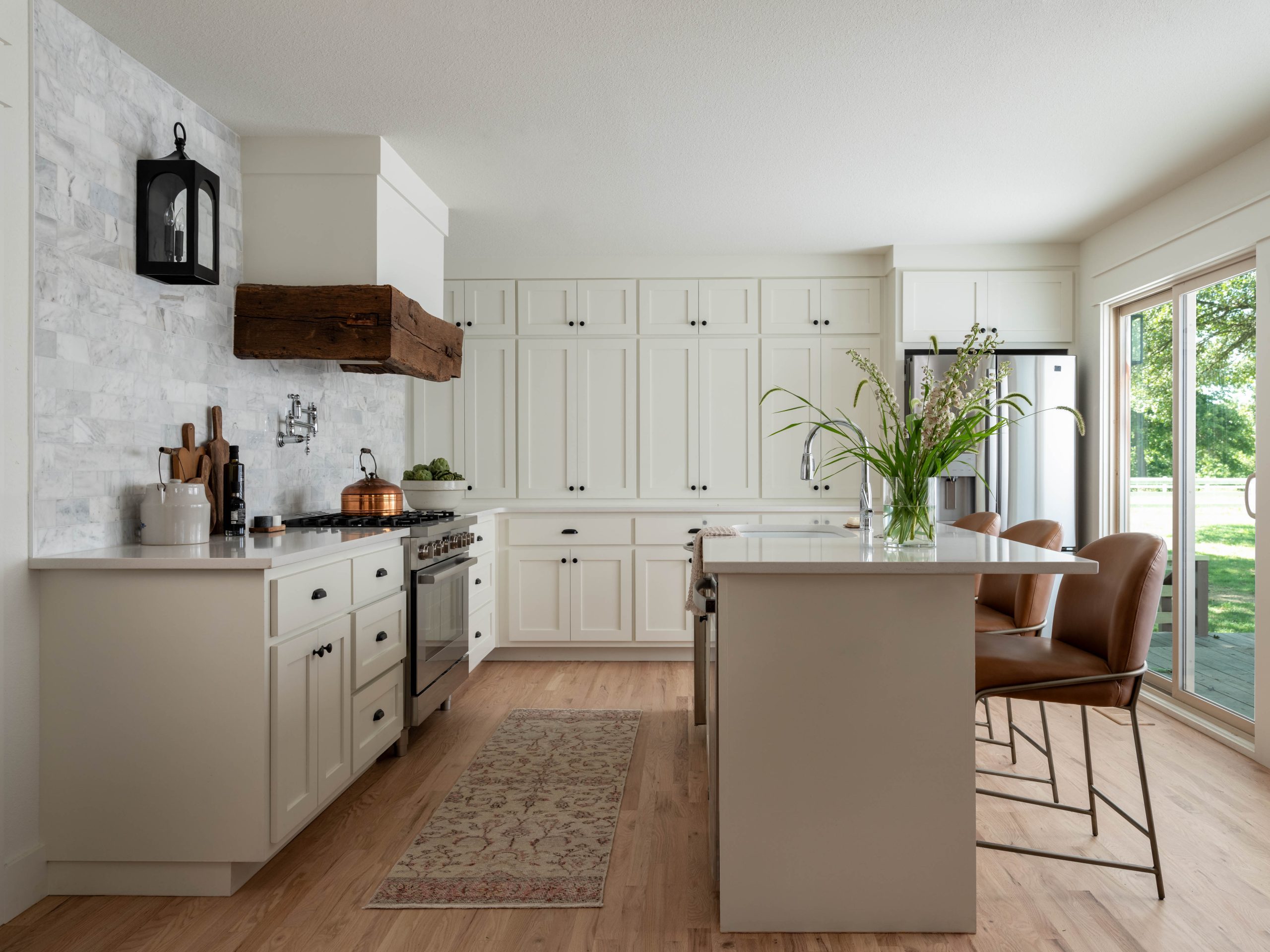 This spot had originally been the dining room with a cut through to the old sunroom. We added a wall to close off the sunroom and create an L shape for the new kitchen, and had plenty of room to add a large built-in kitchen island and perimeter cabinetry. Cheree had wanted an all-white kitchen. It came out bright and cheery, especially with the extra touches we made to warm it up and blend in with the farmhouse style of the rest of the house. One of my favorite choices we made for this house is the wooden surrounding the hood. We found this large chunk of wood at the neighbor’s house across the street (who are friends of ours), and it was perfect. I just love the imperfections of the hand-hewn beams.