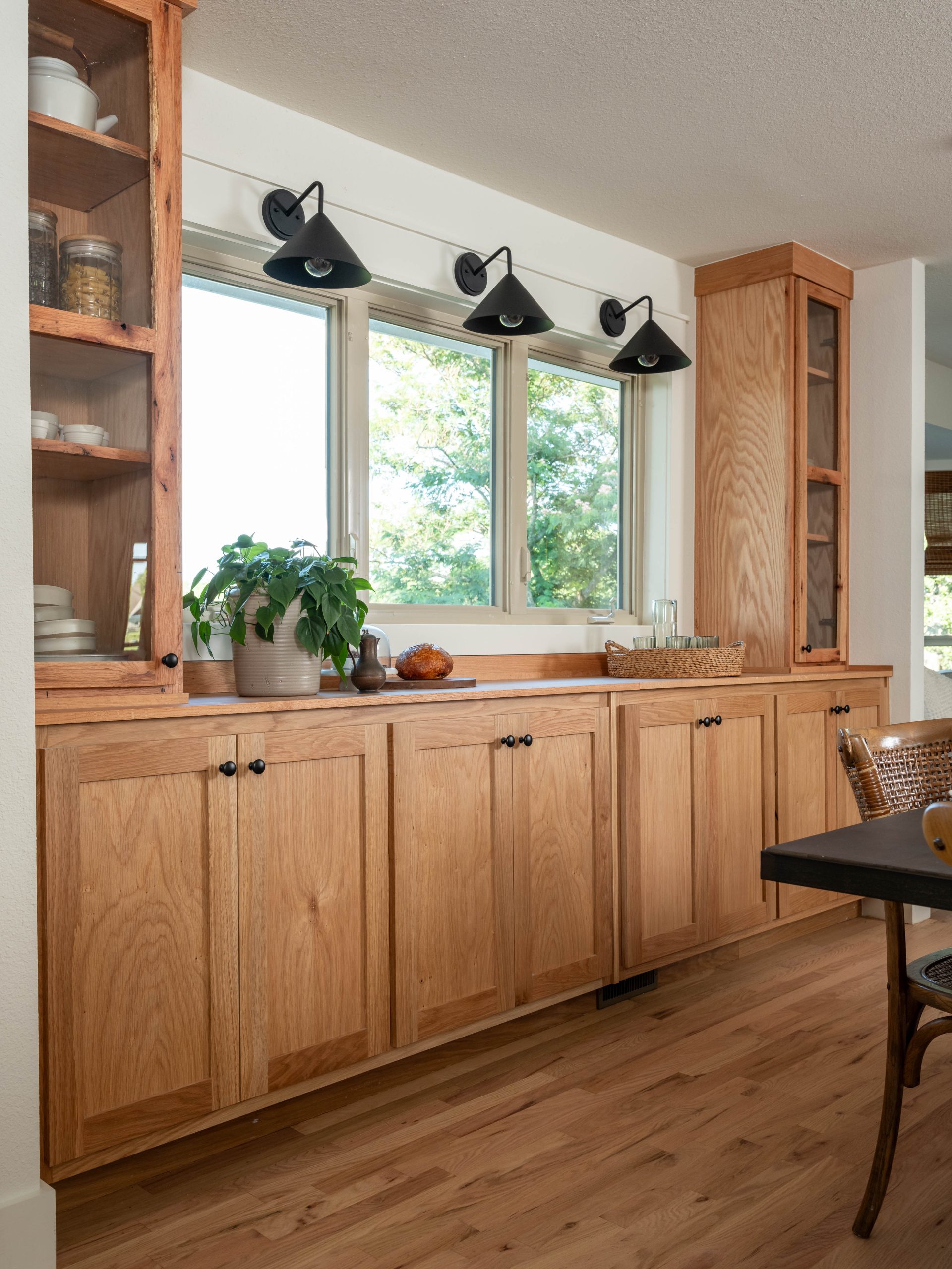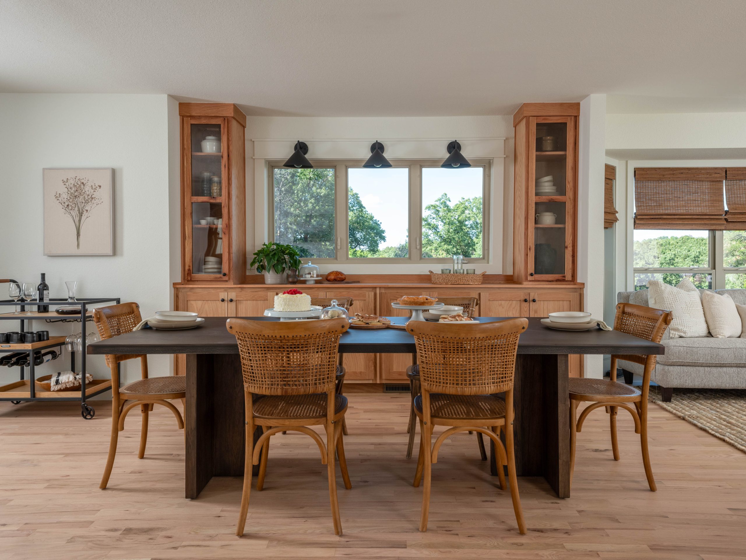 This area had originally been the kitchen with a dividing wall between it and the dining room. When we moved the kitchen over to the other side, we were left with an awkward window where the kitchen sink used to be. Dave built new cabinets around the existing window and kept them a nice natural wood to differentiate them from the kitchen and go with the farmhouse look we were going for. Now, this area has extra storage and is perfect for kids (or friends) to hang out while parents are in the kitchen. There’s still plenty of room for a long dining table for meals and games.