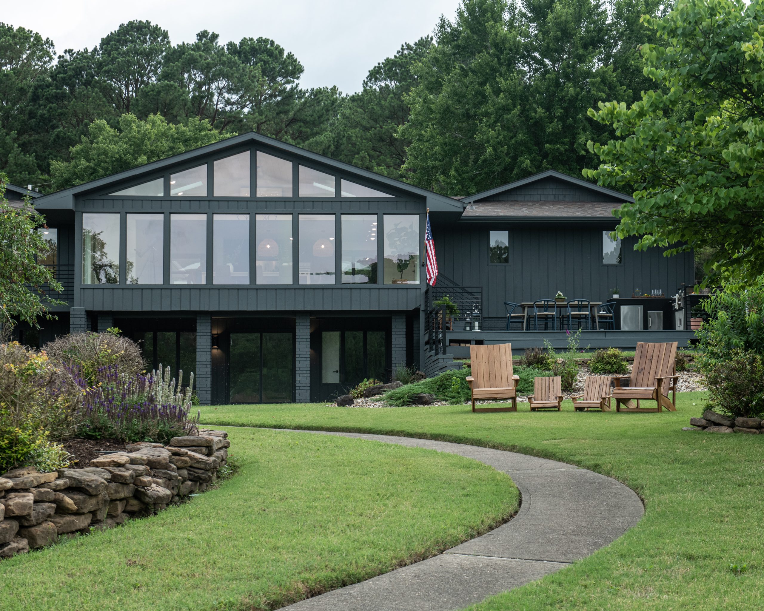 This is where the Coughlins plan to spend a lot of their time. To create a true outdoor entertaining space, we added a modern outdoor kitchen for grilling and hosting. For maximum enjoyment of that extraordinary lake view, we changed the flow and path so it all headed toward the water.