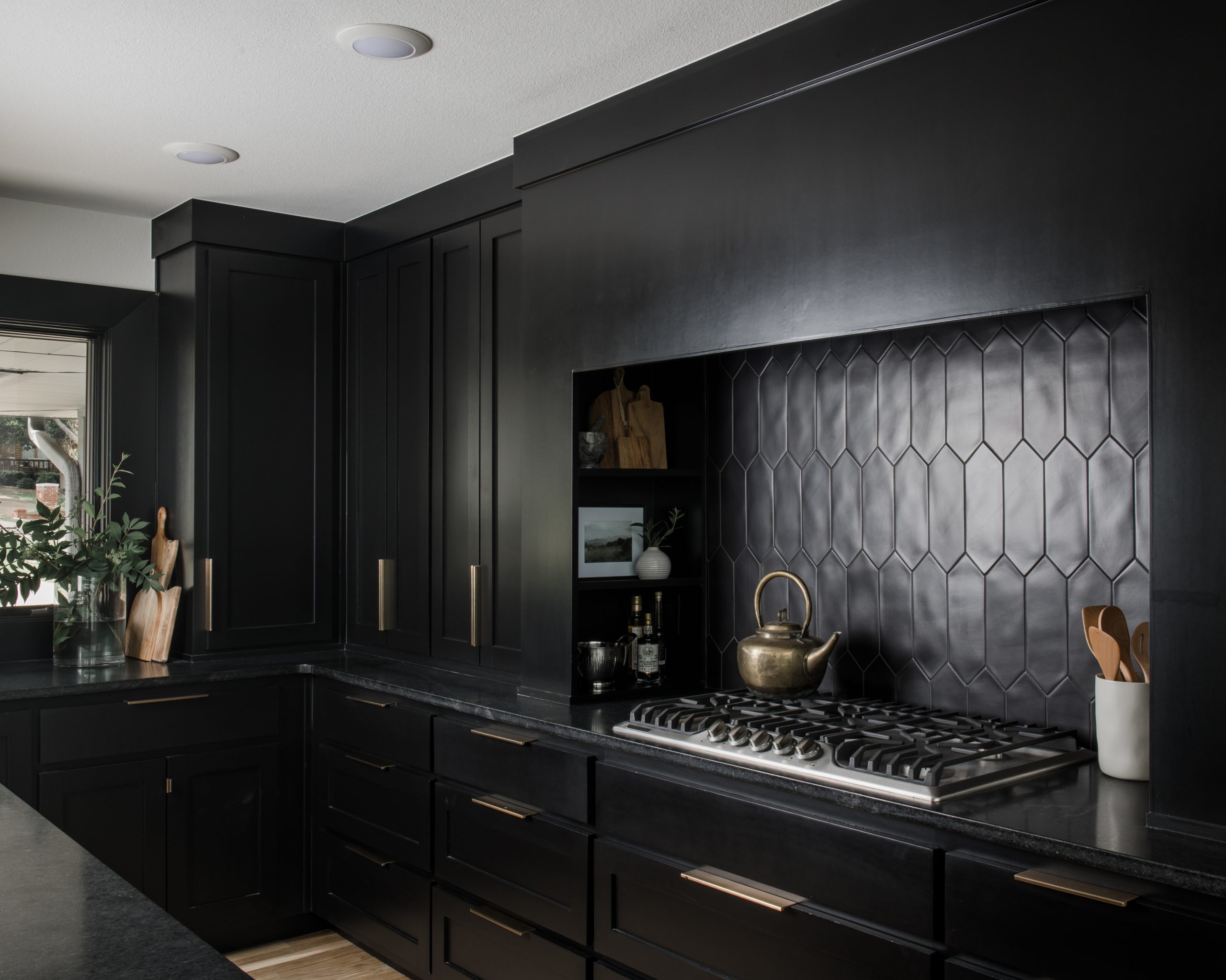 The current kitchen was dark and felt closed off from the living areas around it. Moving the front door allowed us to remove a partial wall and we were able to create a spacious kitchen by bumping the whole kitchen over. Sticking with Kathleen’s vision for a unique look and feel, she told me to go either all-black or all-white. When we met (off-camera) and reviewed her inspiration images of kitchens she loved, I saw a clear trend toward all-black. I was excited to go for the all-black, bold kitchen and absolutely love how sophisticated and stunning the kitchen turned out.