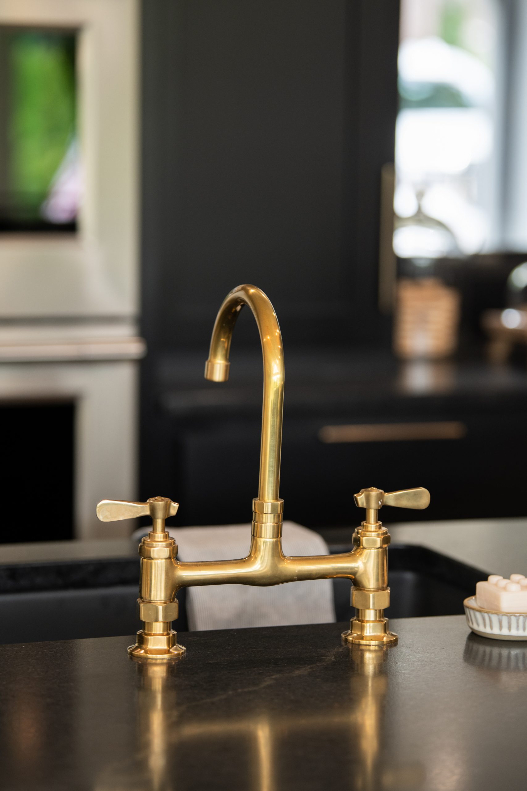Custom cabinets and countertops, modern hardware, brass fixtures, a big island, and a uniform shade of black all over resulted in a gorgeous showstopper of a kitchen. The woven sconces infused a bit of casual lake vibe into this sharp, modern kitchen.