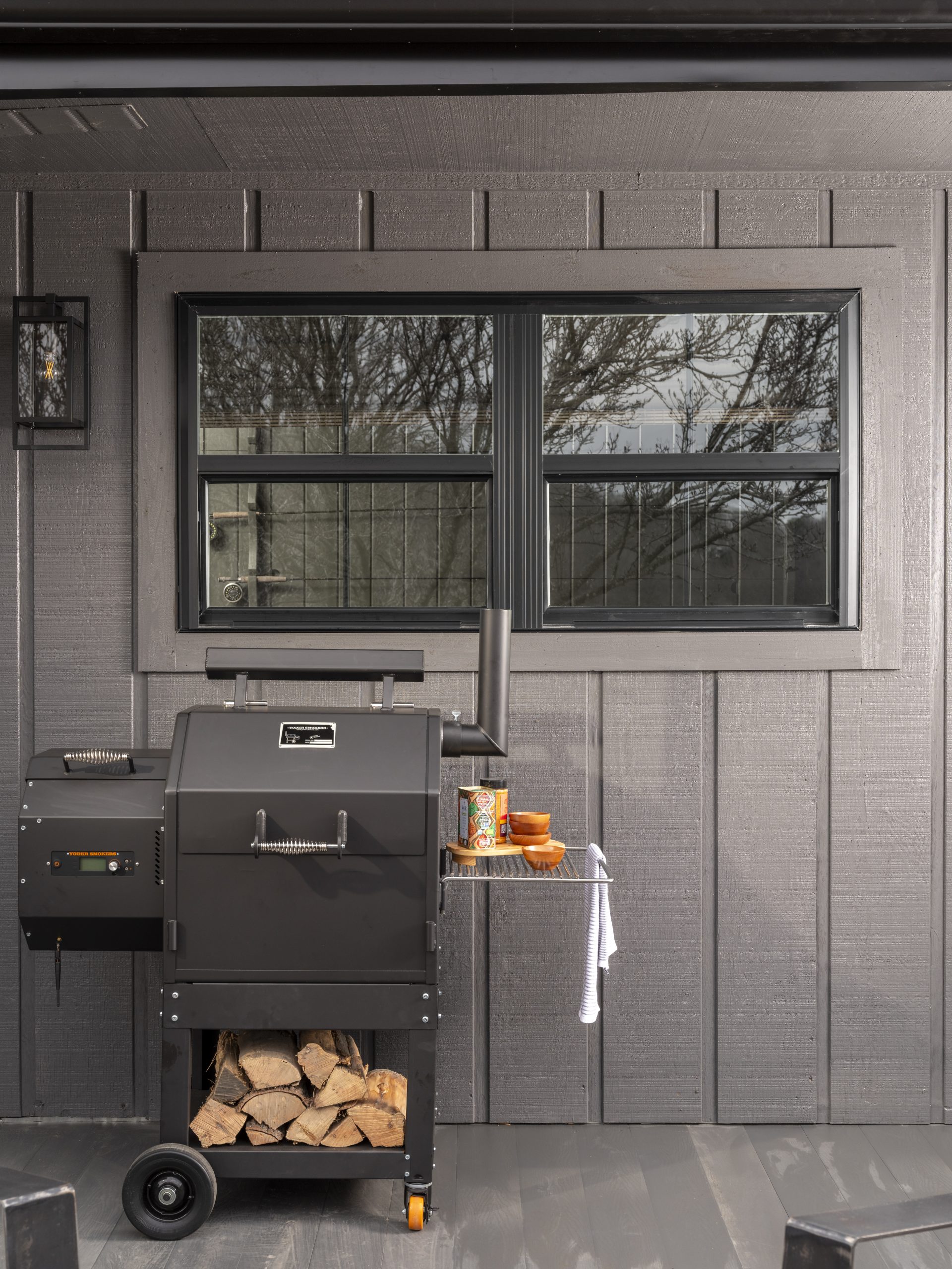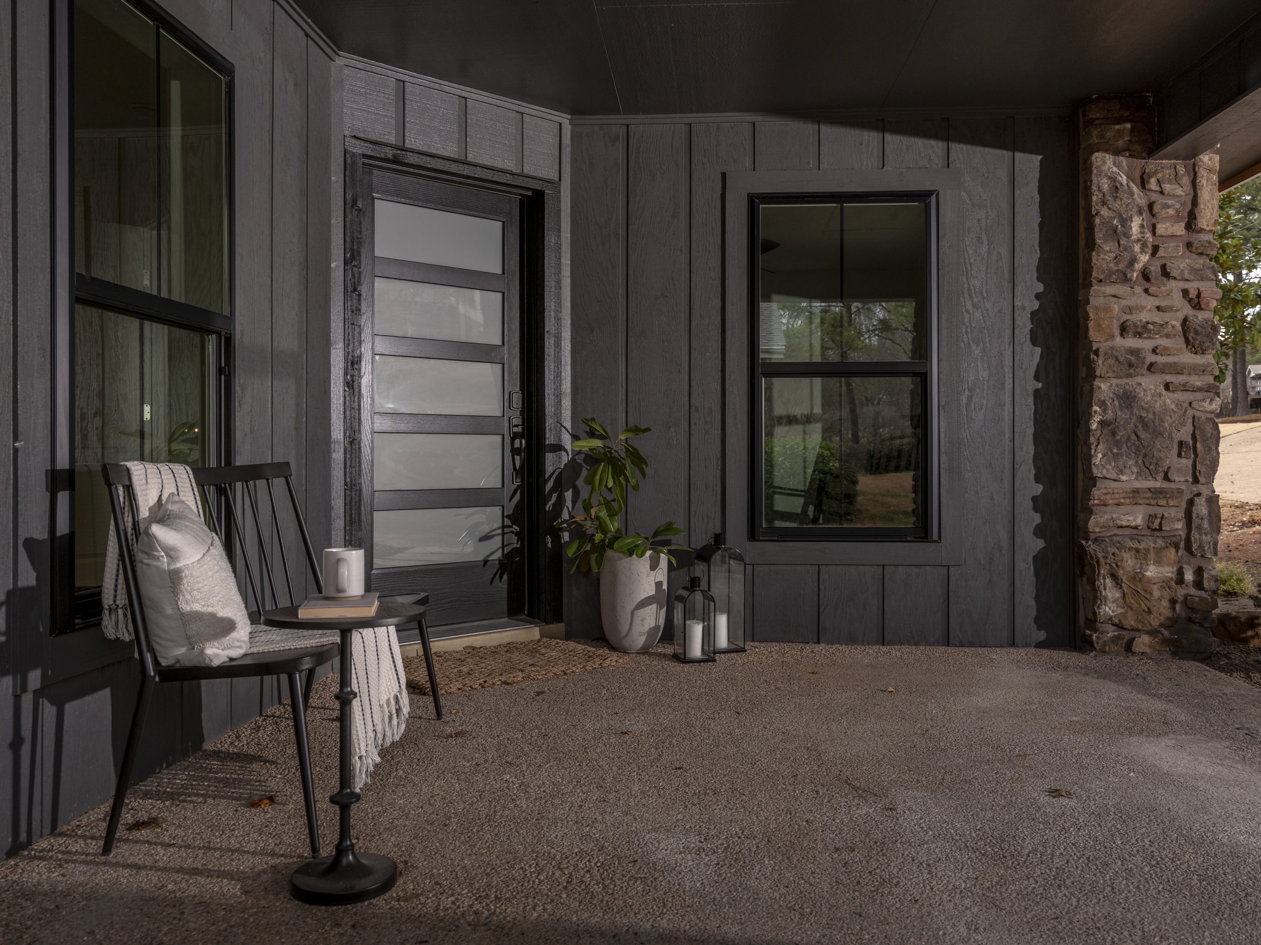 The landscaping was completely overgrown and covering up a large part of the house. We took all of that out and added smaller bushes. The house got a new metal roof and a dark coat of paint all over to update its look. For extra curb appeal, we added a peak to the center and an additional window to break up the siding. The dark window frames with the stone look much cleaner and much more modern. We finished up the look with a new front door and new light fixtures.
