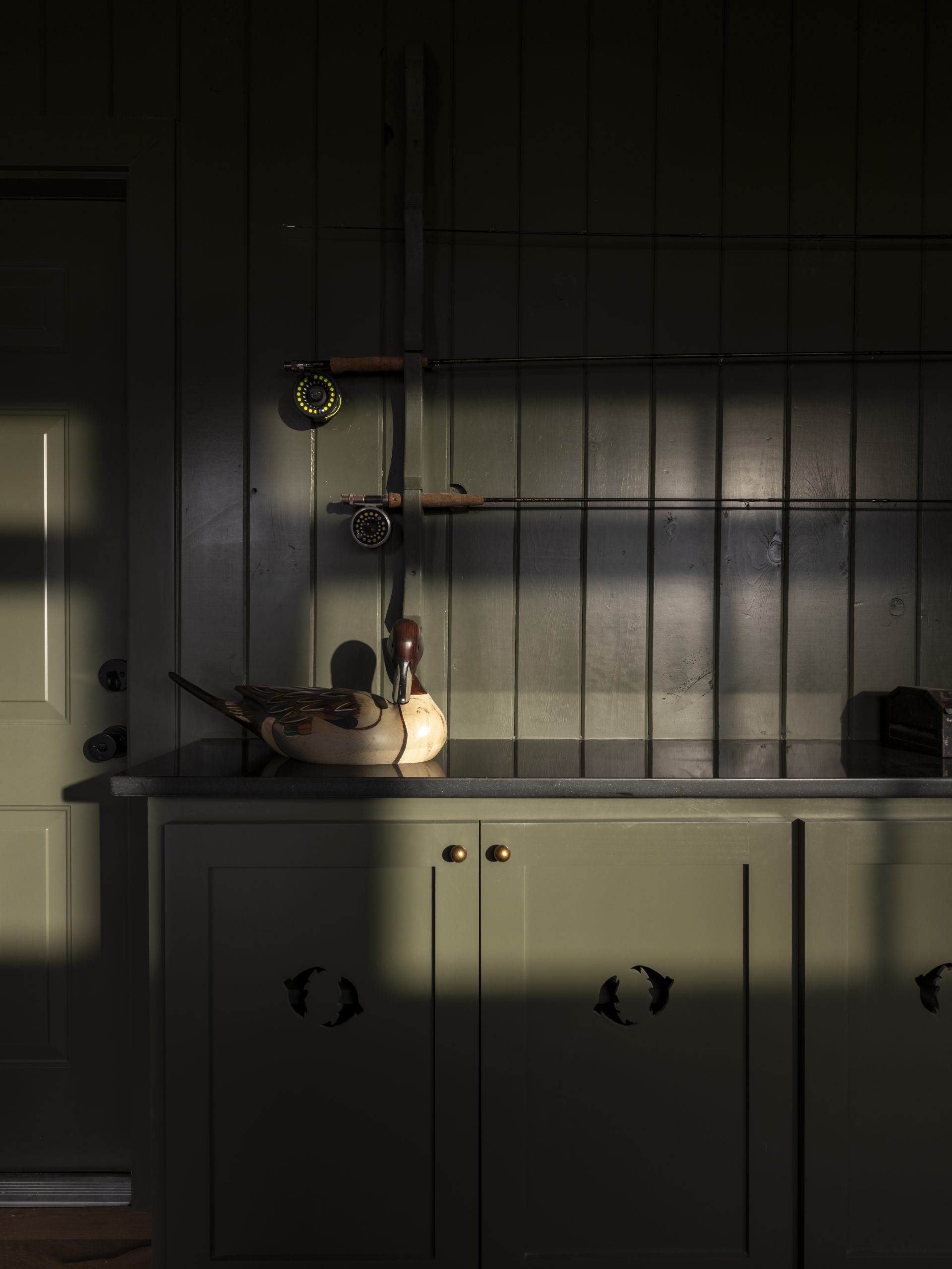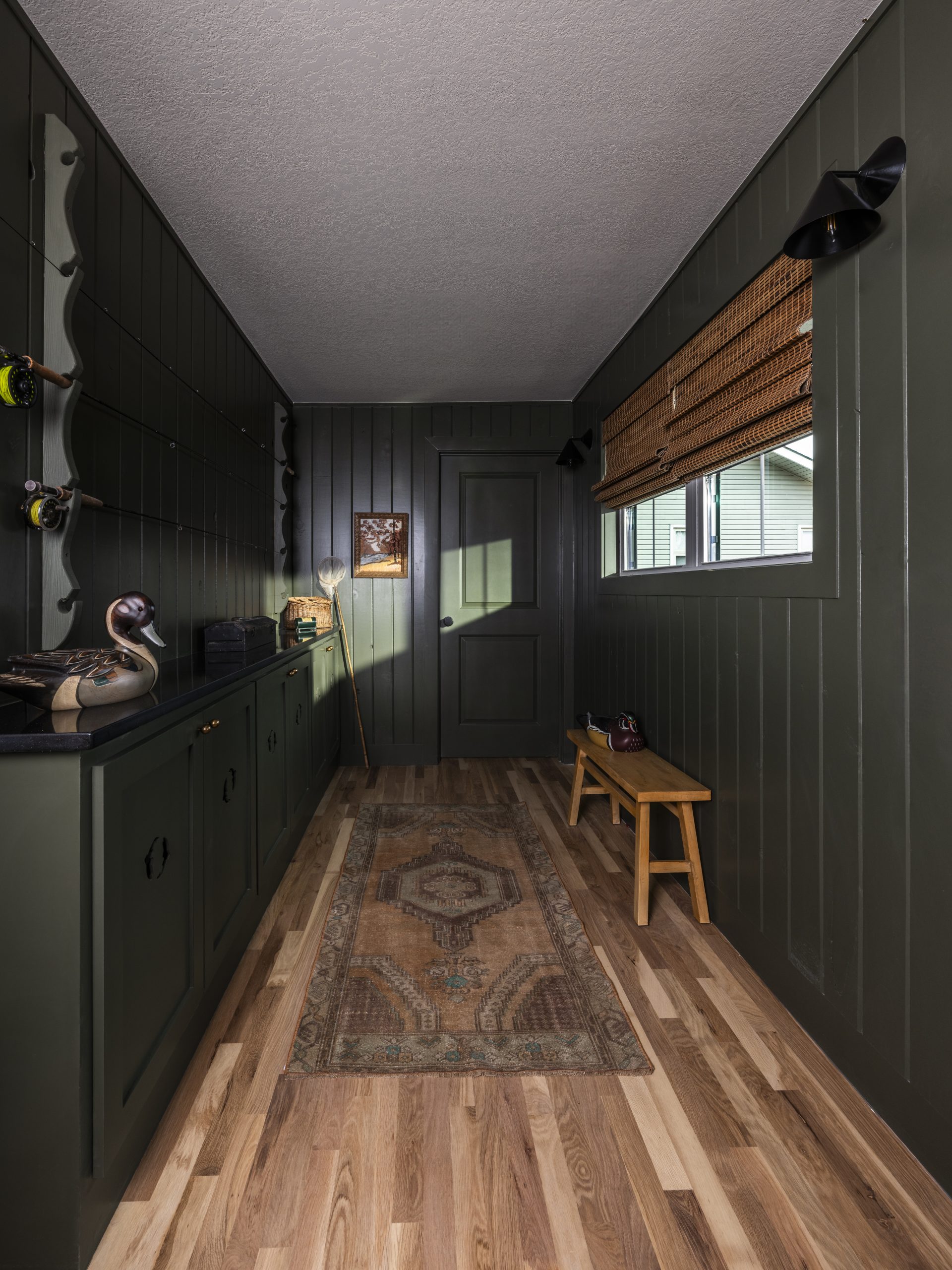 Most people don’t have a fishing room! This was an extra special thing we did for Uncle Bob, who loves to fly fish. We carved out space from the large garage and converted it into a laundry room and fishing utility room where Bob can hang his rods and store all his equipment. Dave used a CNC machine to cut fish designs into the cabinets he installed. The whole room was painted a hunter green color to give it the feel of a true fishing cabin. The location of this room is perfect because the door leads out to the back deck. Now he can keep all his fishing gear right here and go straight out to the lake to fish.