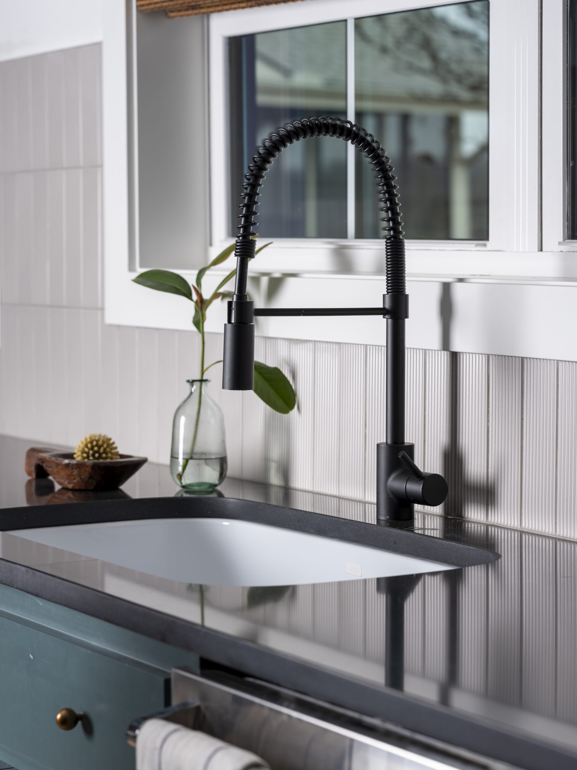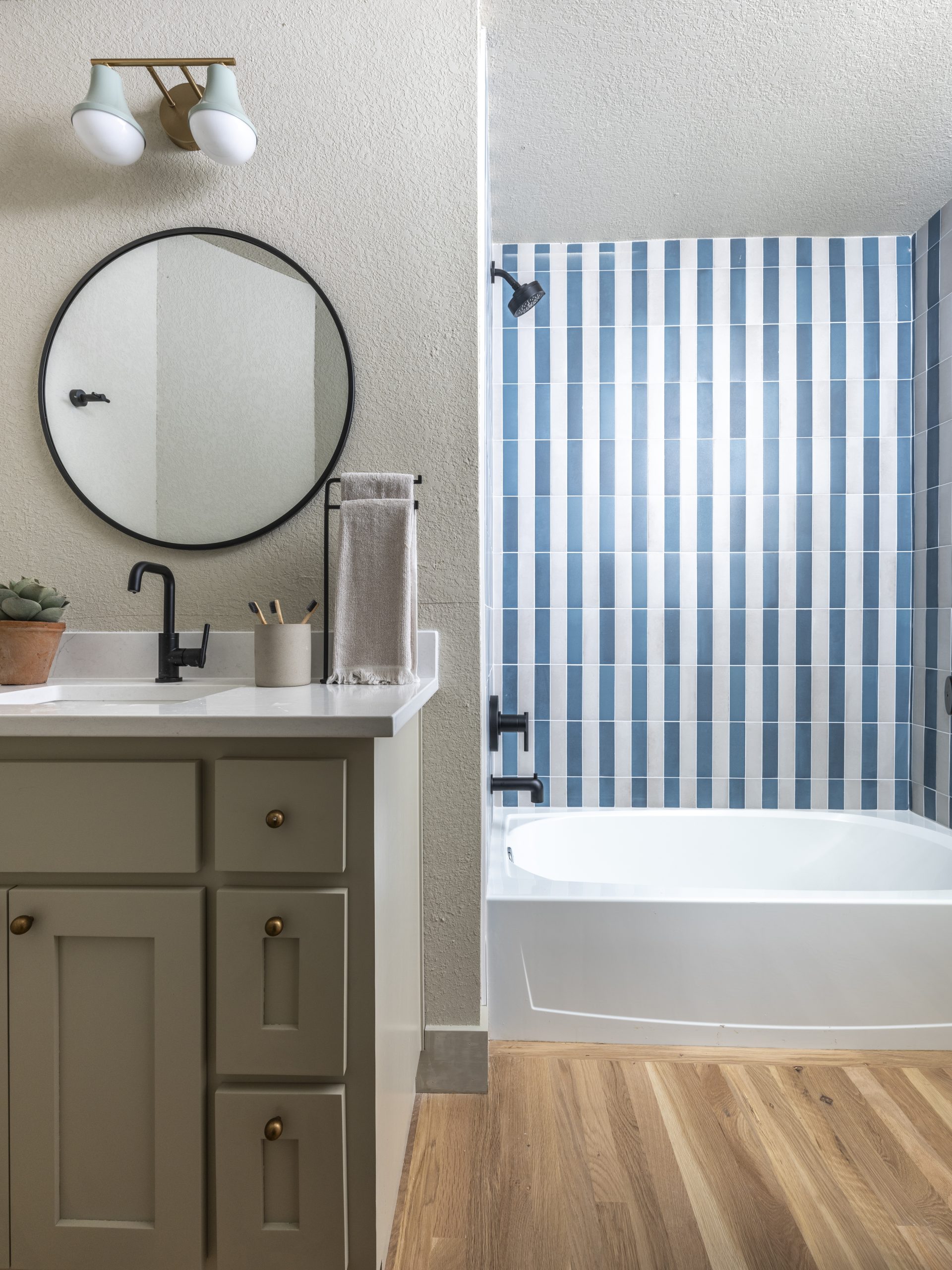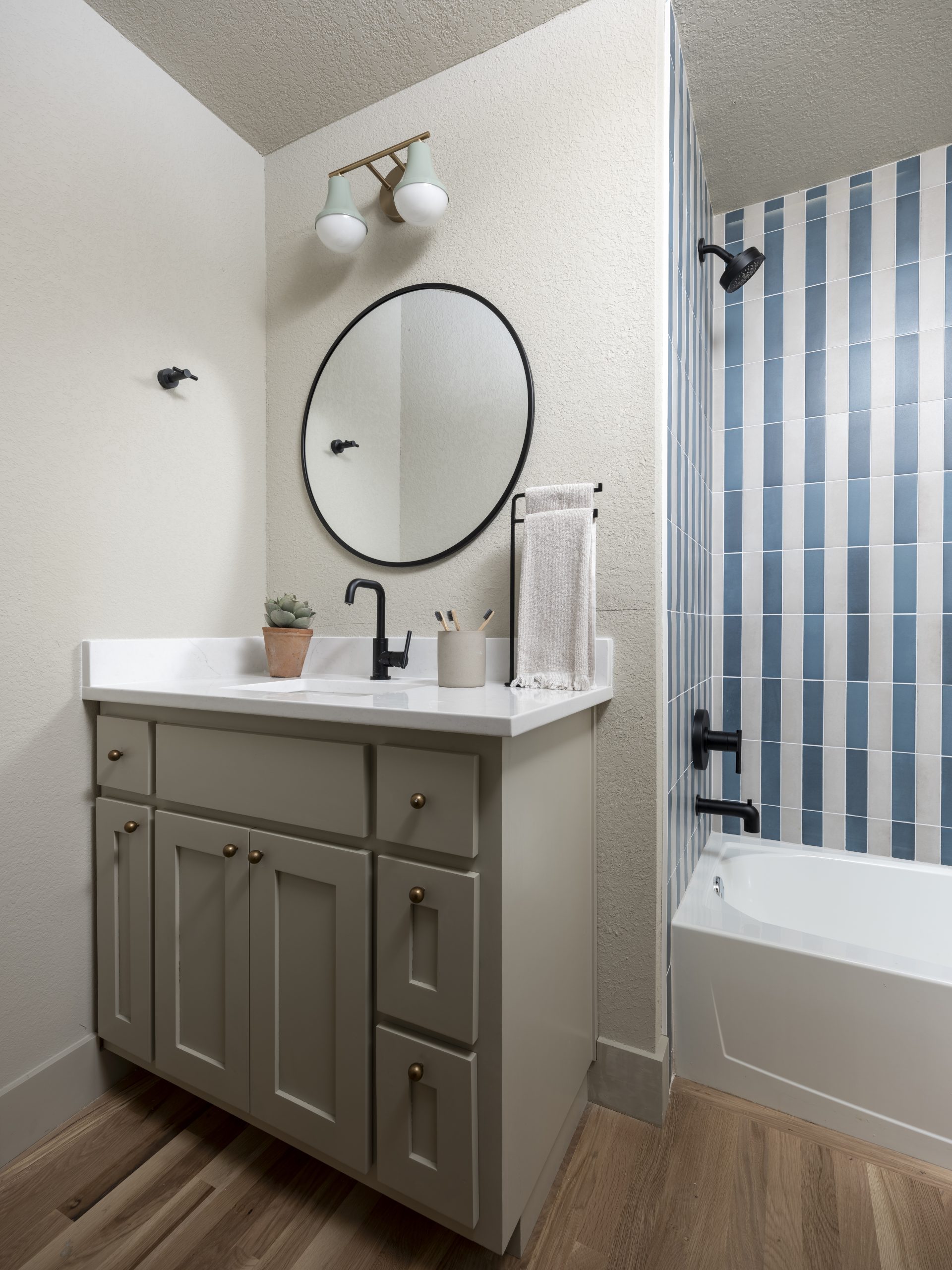 This didn’t get revealed on the show, but we also remodeled the bathroom that’s near the kitchen and the living room. We added a fun tile and chose a modern color to make it much nicer and ready for guests to use when they visit.