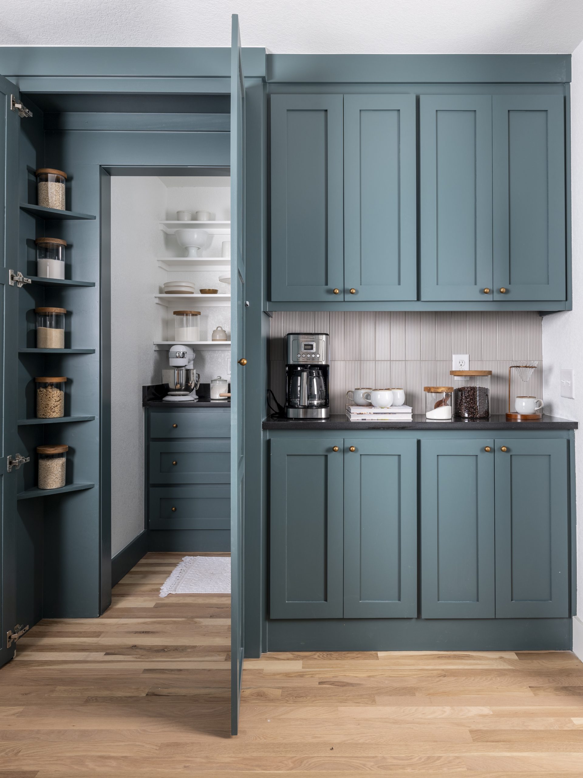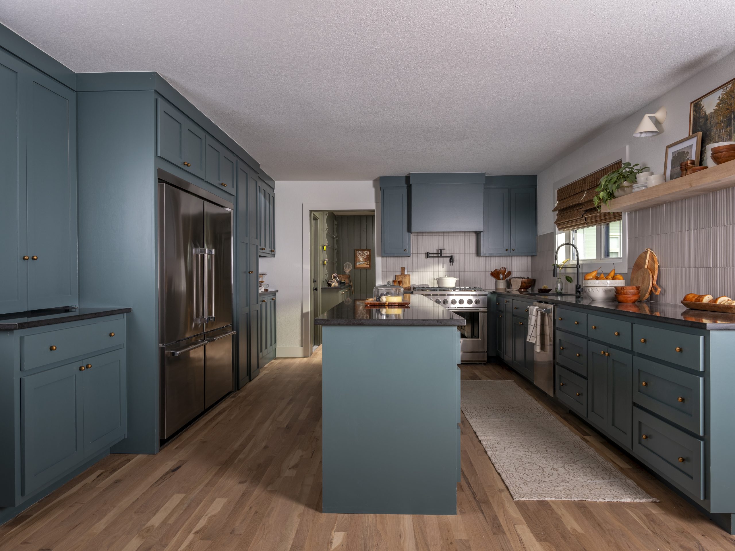 We added a large island, hidden walk-in pantry, fridge wall, new cabinets, new countertops and new appliances. I chose a a deep blue for the cabinets to bring in the colors of the beautiful lake outside the window. Uncle Bob and Jill like a midcentury look, and these colors and tile pattern bring that to life.