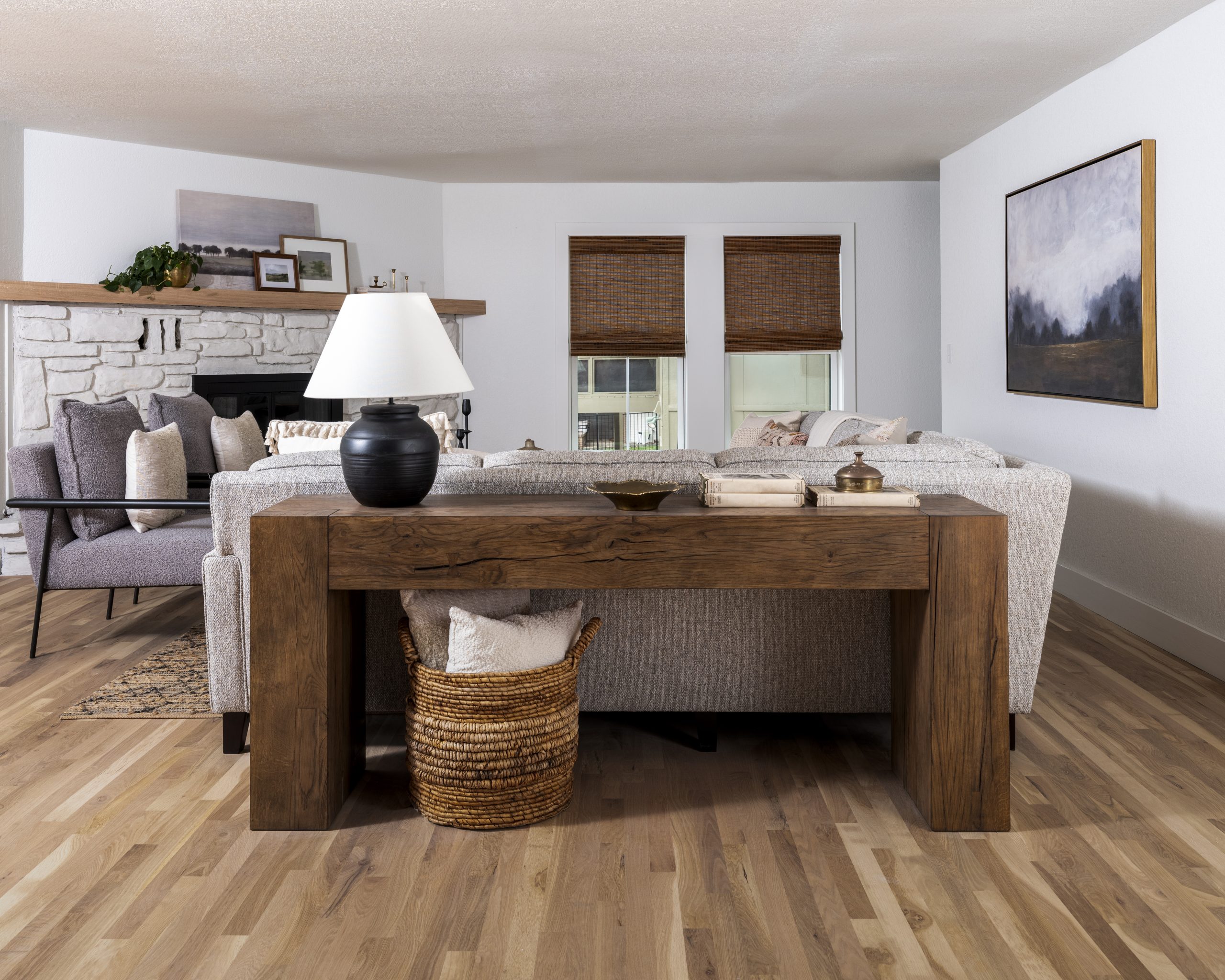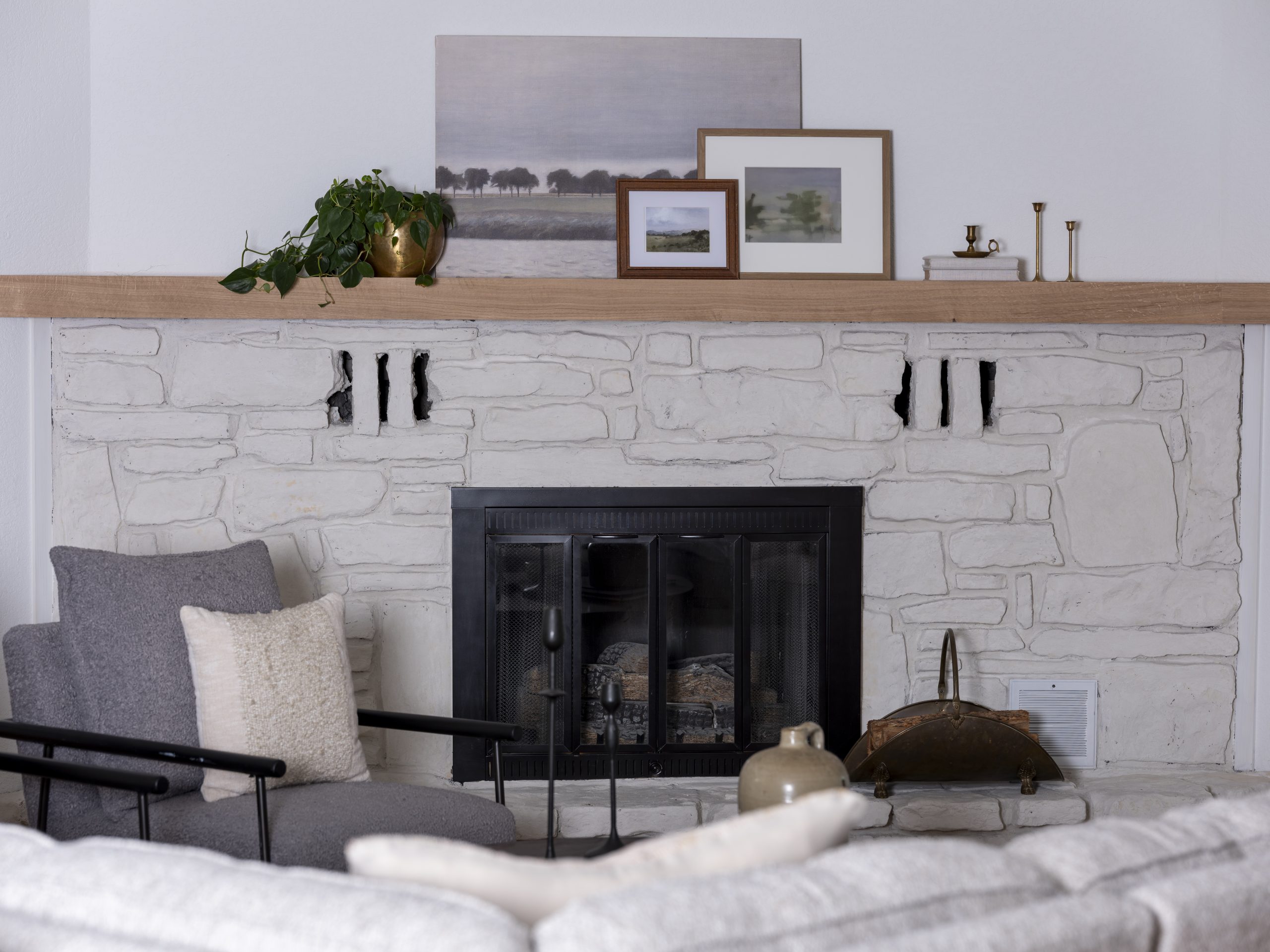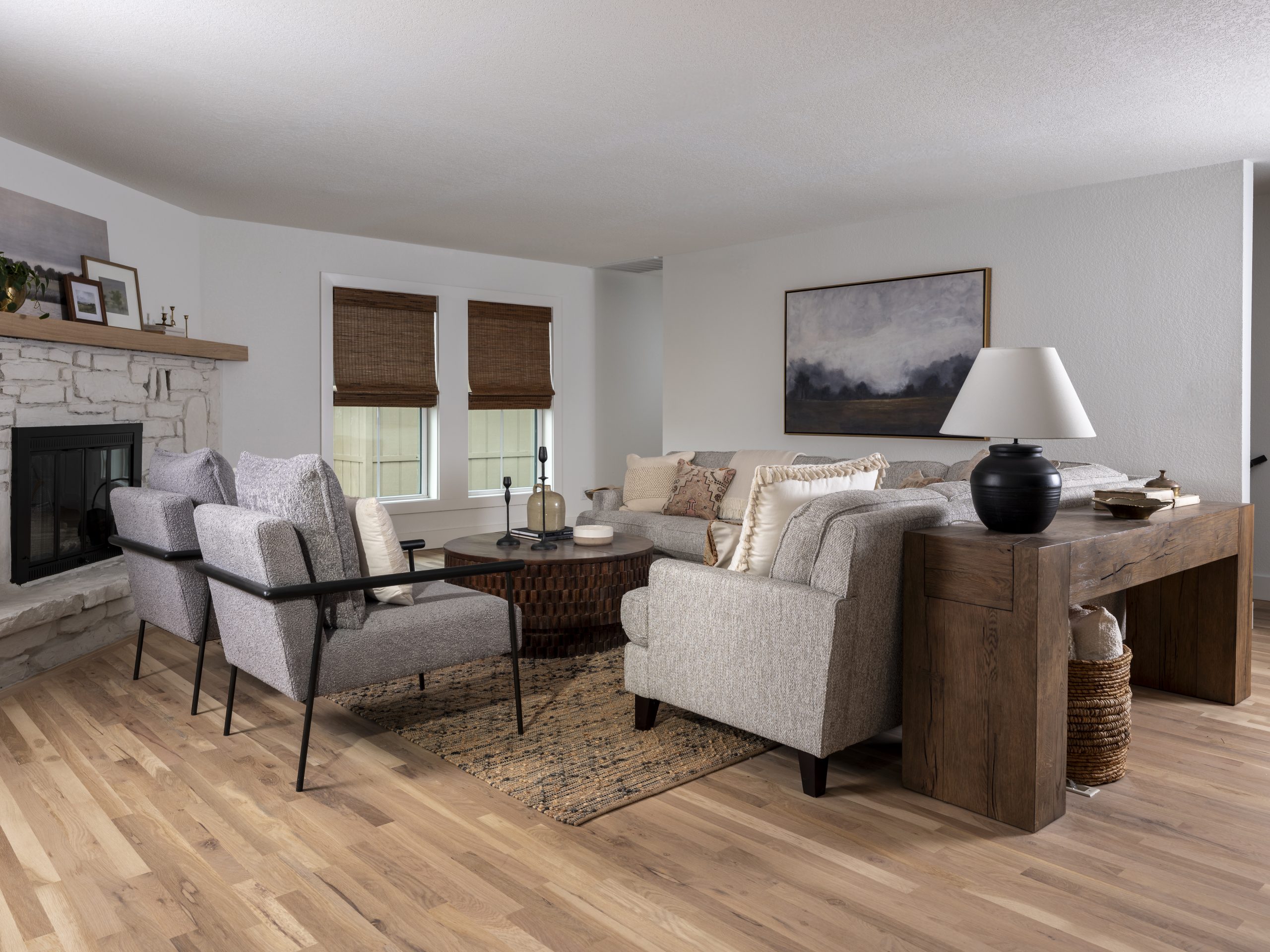 We reconfigured the entry hall so that it now flows better – including moving the laundry room to a spot in the garage. This included changing the layout of the doors near the entryway. For the living room, we started with a nice open space that just needed to come into the 21st century. In order to brighten up the heavy fireplace, we sheet-rocked over the top half and mortar-washed the stone on the bottom half and added a white oak beam mantle. The brighter tone goes much better with the lighter feel of a lake house. We also removed the carpet and replaced it with new white oak wood flooring.