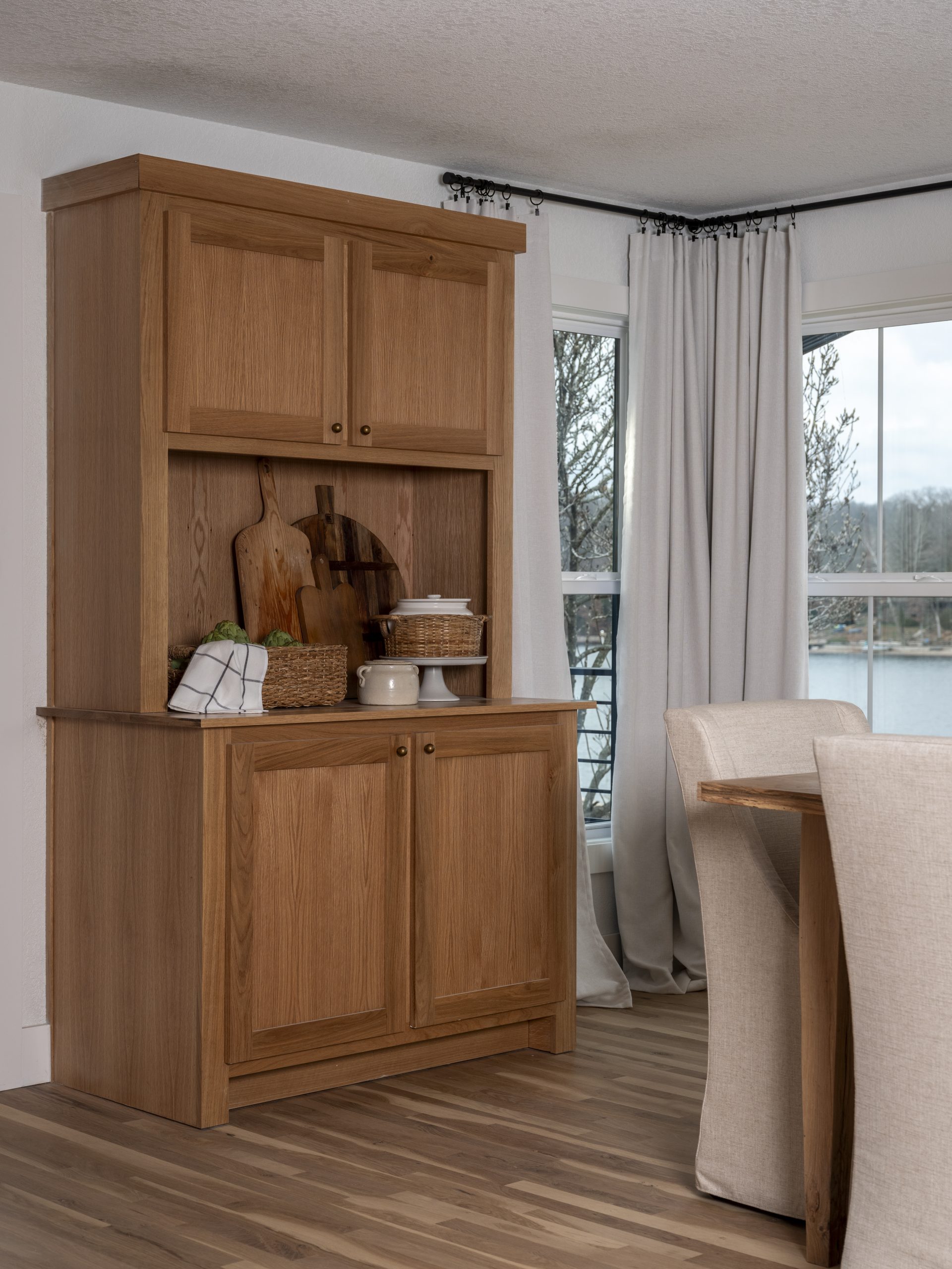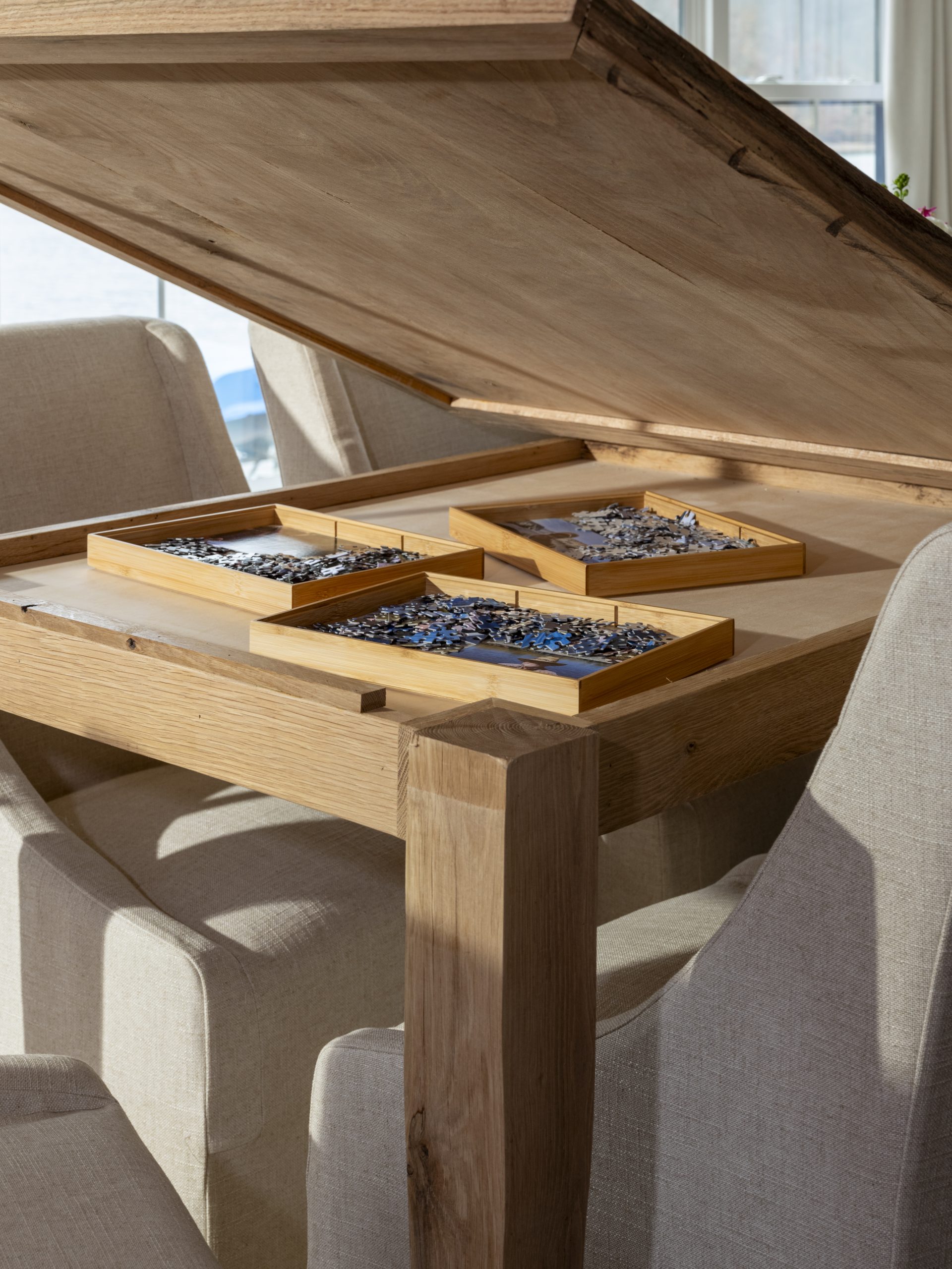 Next to the kitchen, this used to be a four-seasons room. We upgraded it to make it part of the main house and changed it into a cozy dining area that doubles as a game room. To do that, we installed new insulation and new windows. We had plenty of space to add a butler’s bar and this beautiful white oak table that Dave made. I love this table! The lid lifts so you can store games and puzzles while you work on them. Our family is huge on making puzzles. I actually had to pull Dave away from one of the puzzles here a few times!