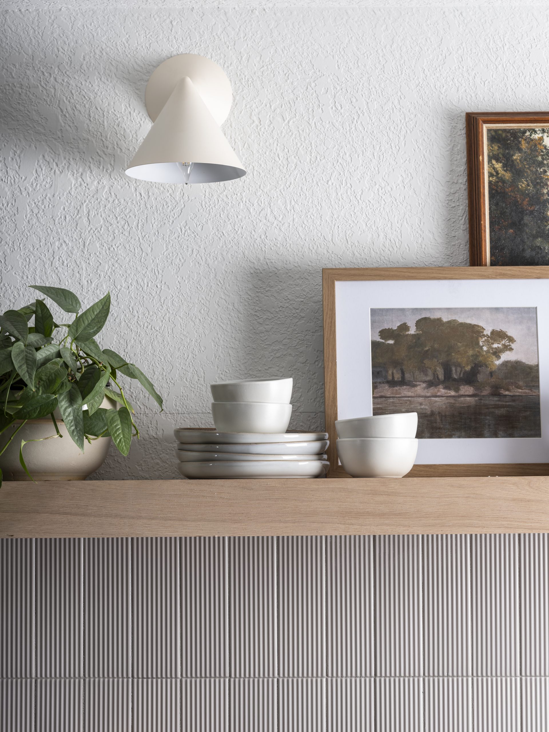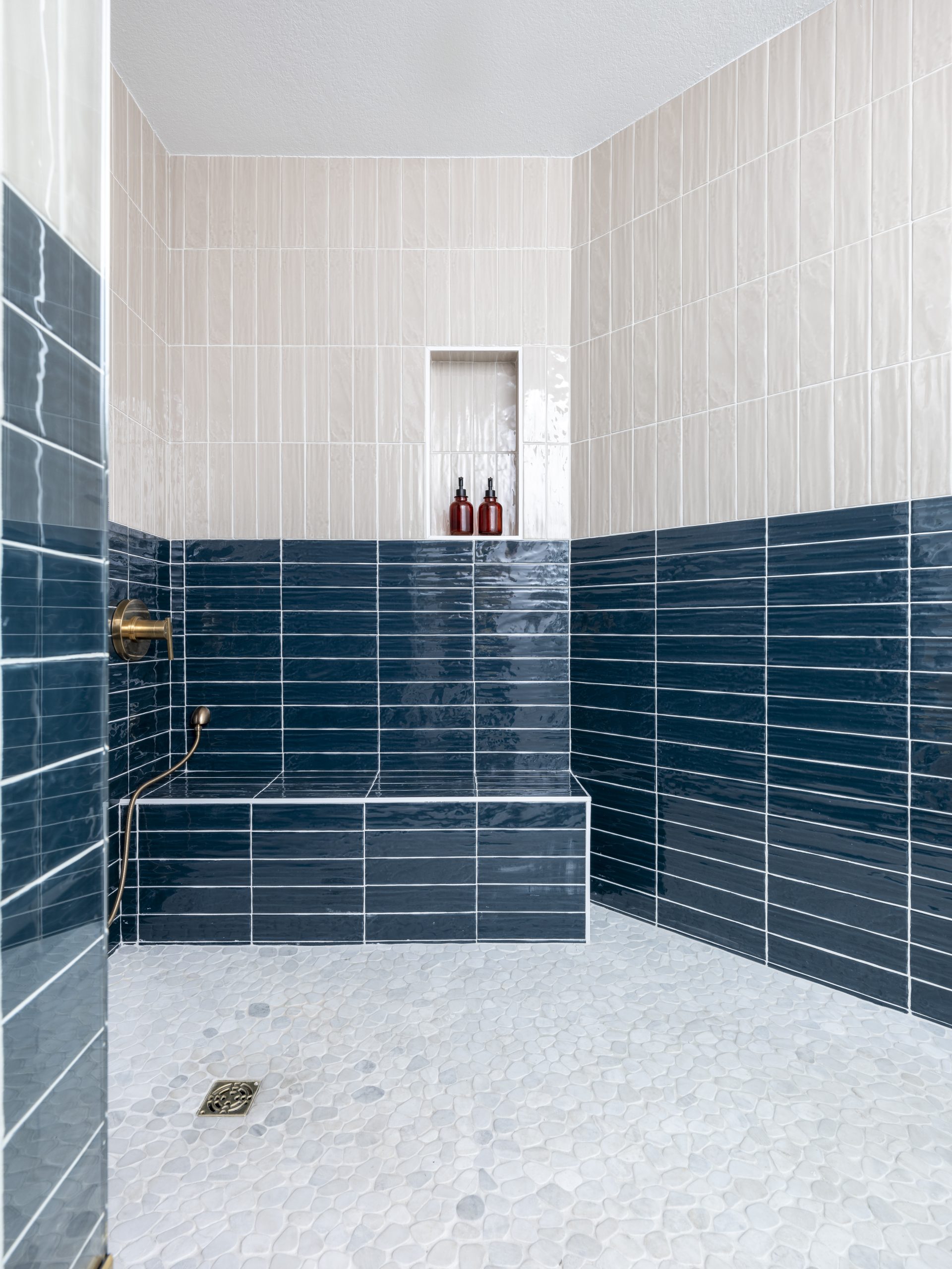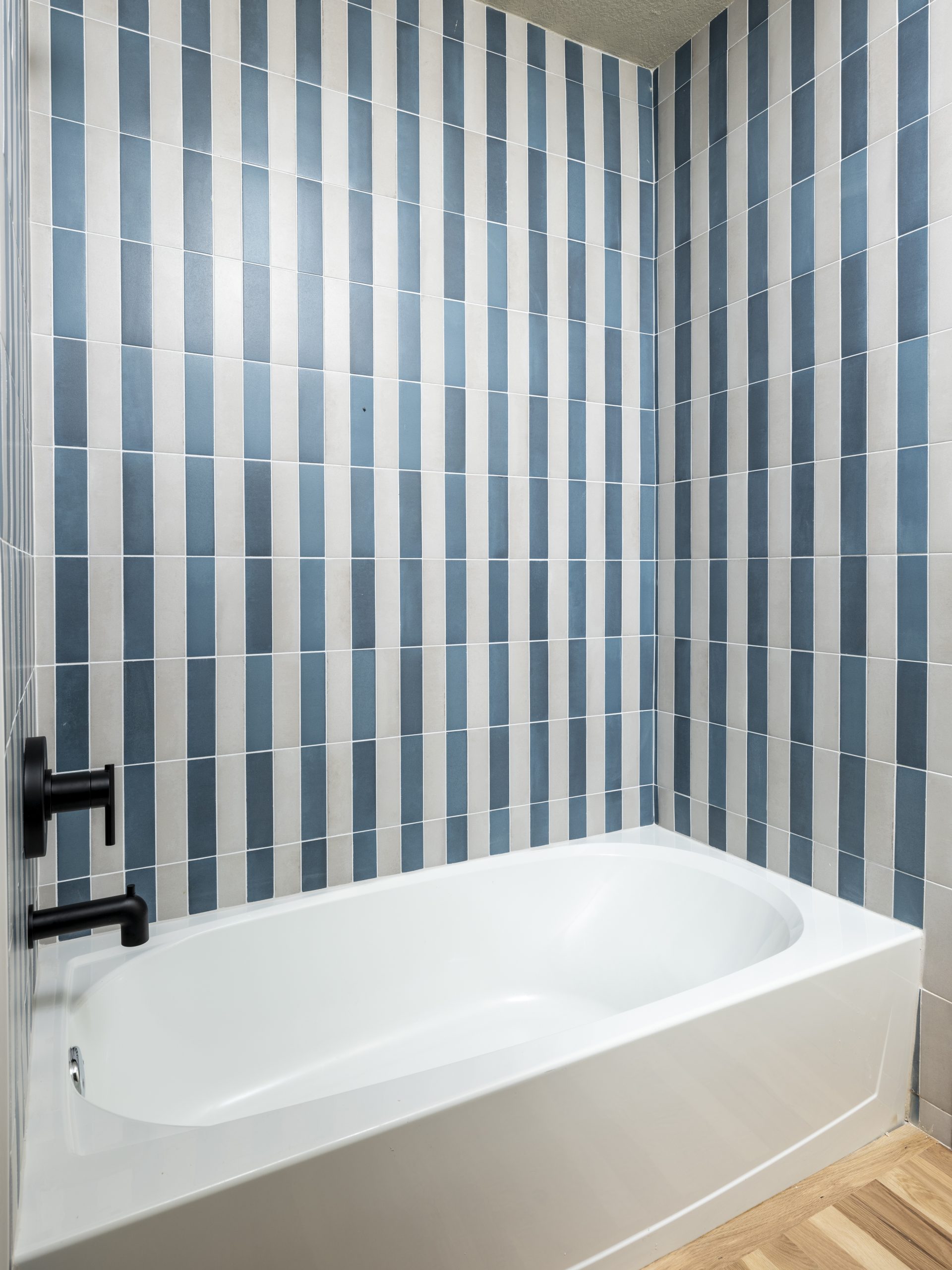 For the bathroom, we chose a mixture of traditional wood and modern tile. The white oak vanity adds warm tones while the shower’s modern tile adds interest to the space. The tile pattern is fun but still sticks to the classic look.
