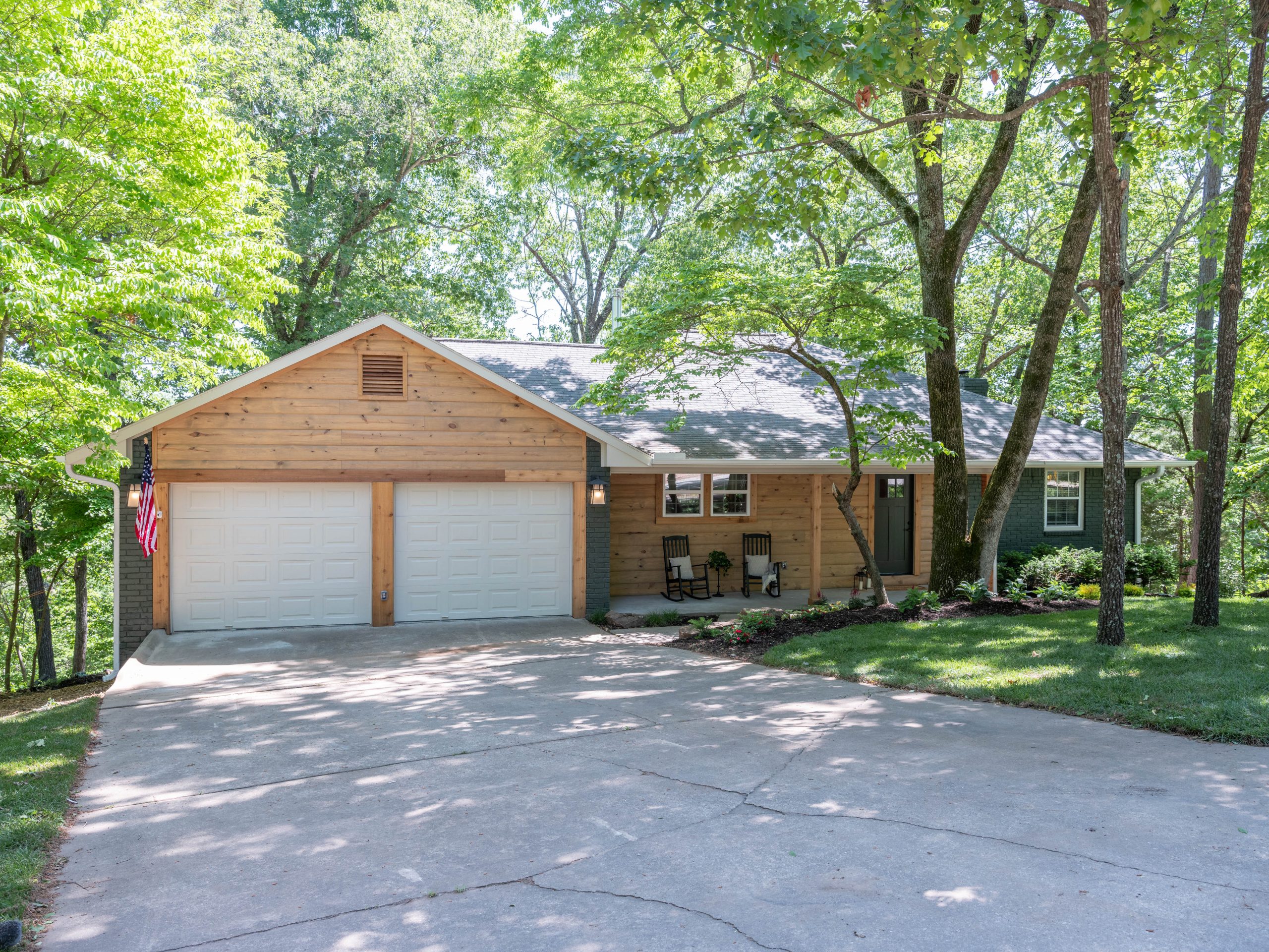 When we first pulled up to the Elleman’s house, our first impression was that it didn’t really look like a lake house. So, we knew right away that one of the most important things we wanted to do was to help this house honor the beauty of its surroundings. We began by removing the vinyl siding from the walls and replacing them with log siding to give it more of a cabin feel. We also wrapped the front posts with cedar. With those natural wood elements and a coat of green paint, the house now blends in with the woods and gives off that cozy cabin feel Aaron and Allyn wanted.