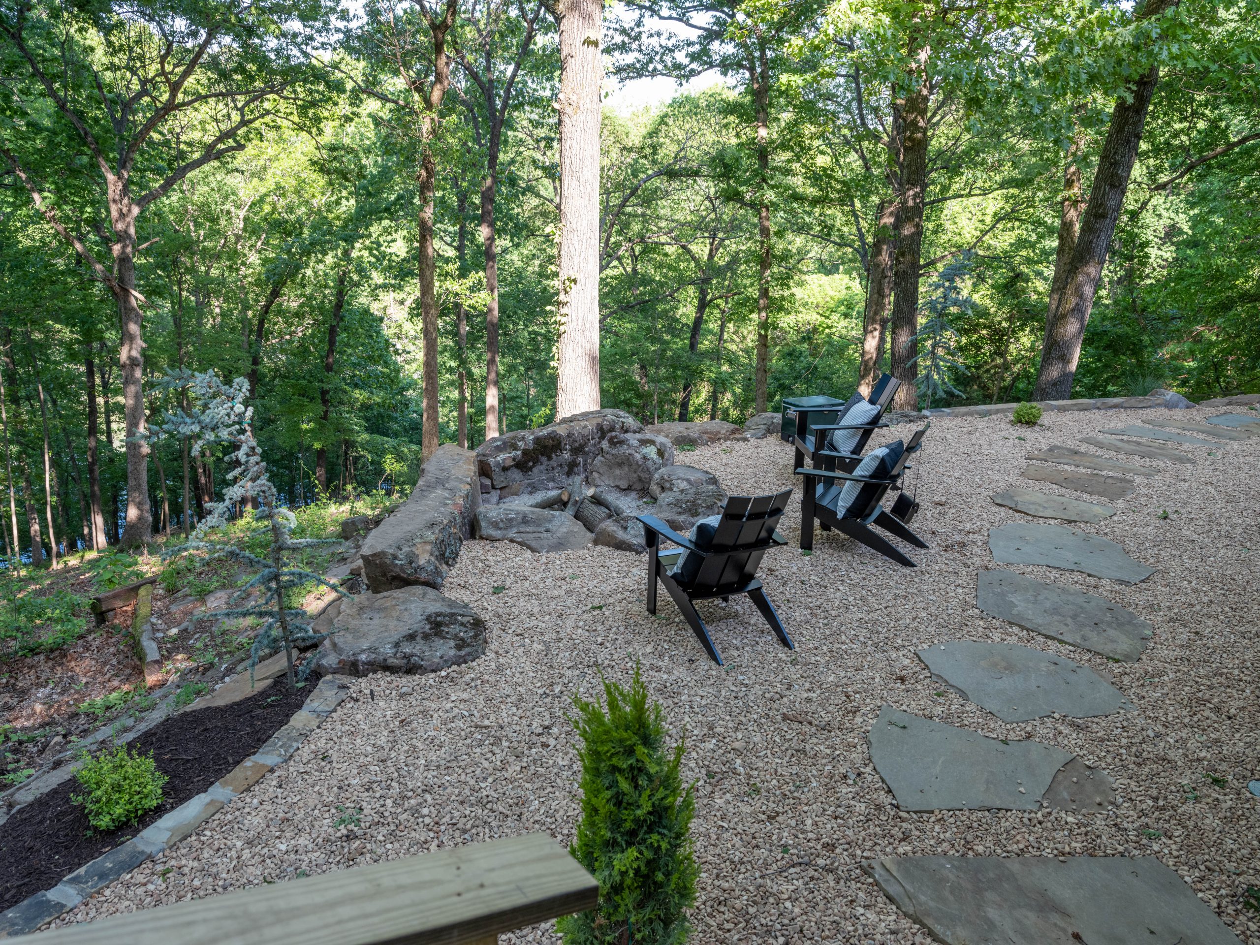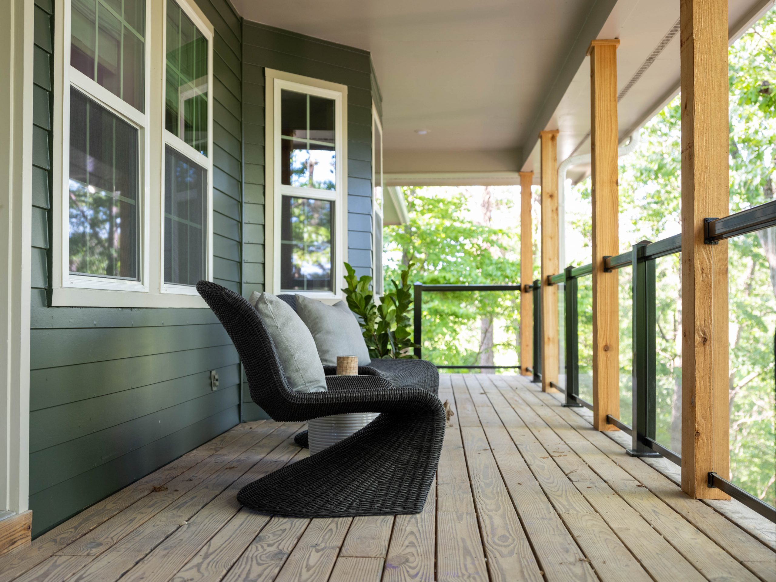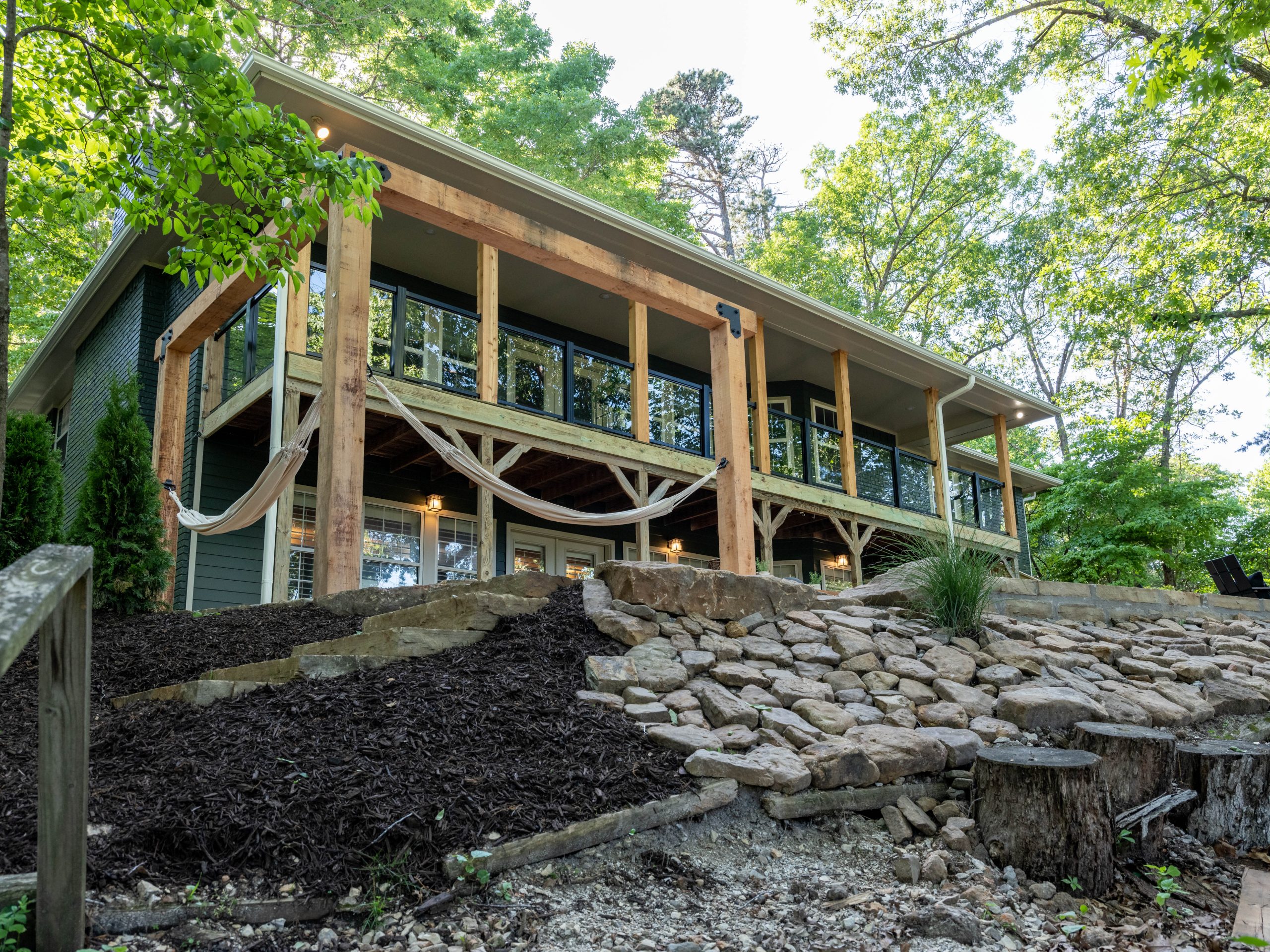 This is the area that makes Aaron’s eyes light up! Here, we removed the old railing, which wasn’t up to code, and replaced it with more driftwood on the handrail part and tempered glass below that. Now, when you sit on the patio your view isn’t obstructed and the Ellemans can truly take in the beauty of the outdoors – which was the whole point of the purchase of this house. Out here, on the back porch, is where you really feel like you’re in a treehouse. Down below, we added a fun firepit and a hammock station. I can just see the next several years of S’mores and fun family time out here.