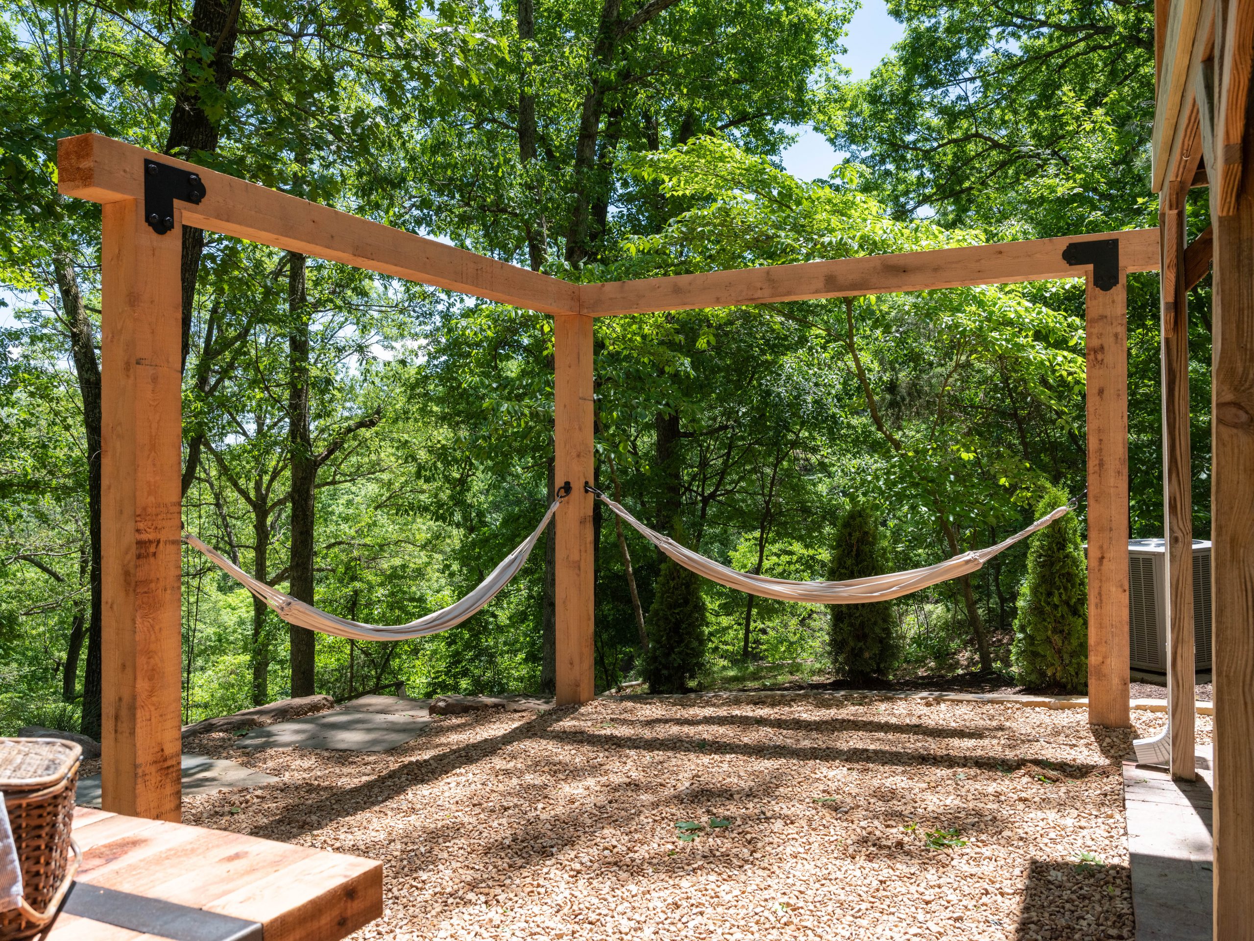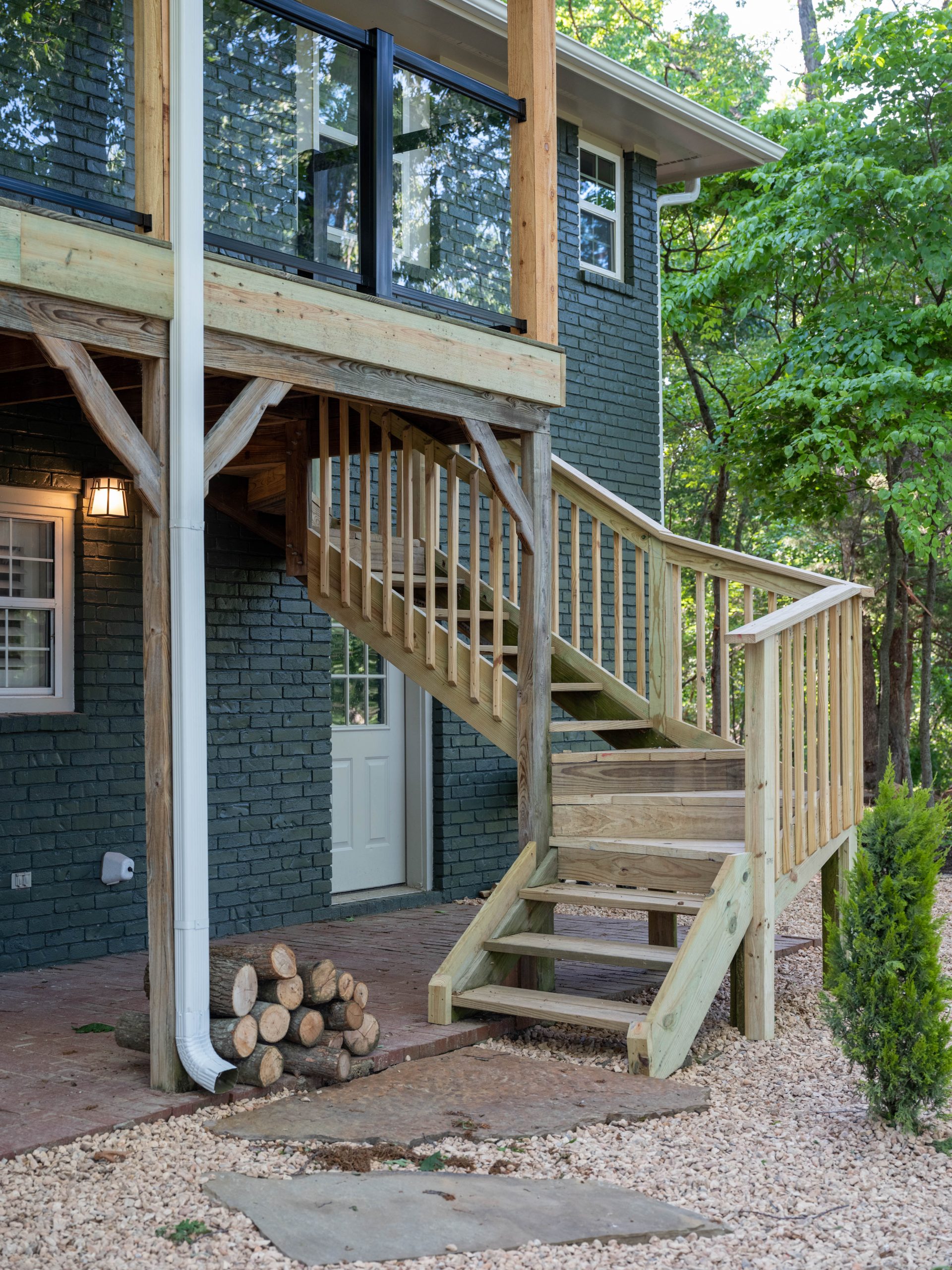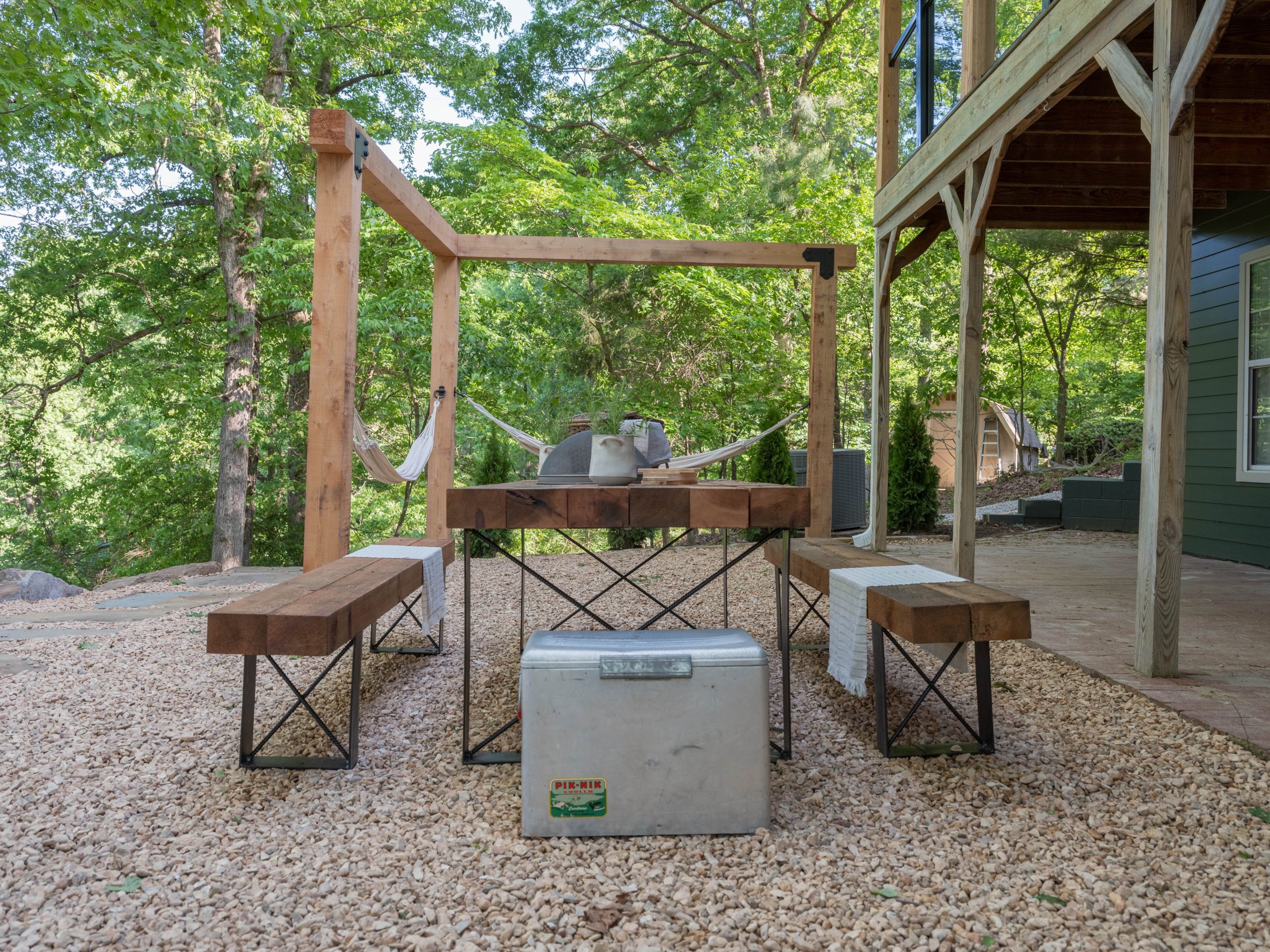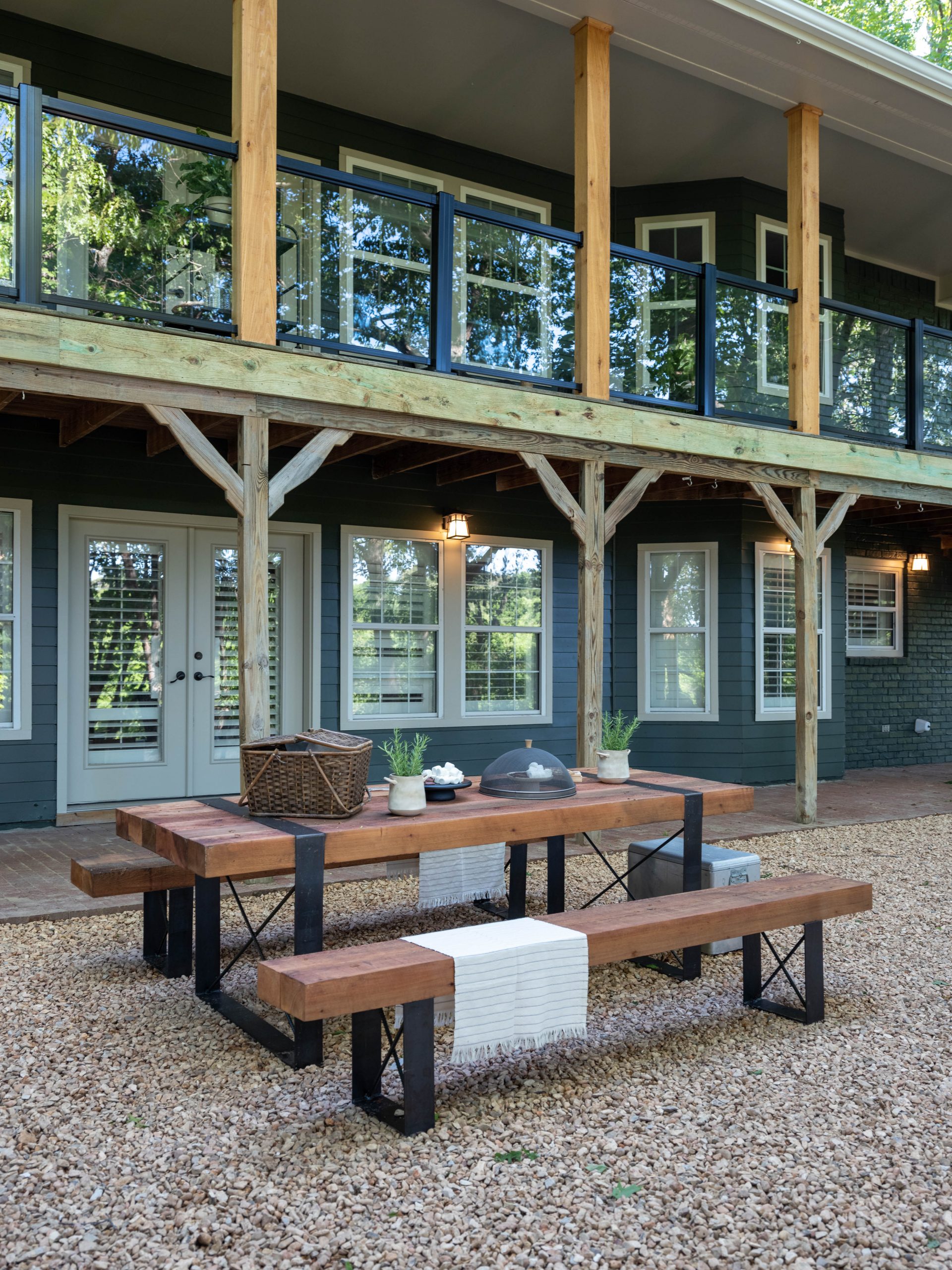 This is the area that makes Aaron’s eyes light up! Here, we removed the old railing, which wasn’t up to code, and replaced it with more driftwood on the handrail part and tempered glass below that. Now, when you sit on the patio your view isn’t obstructed and the Ellemans can truly take in the beauty of the outdoors – which was the whole point of the purchase of this house. Out here, on the back porch, is where you really feel like you’re in a treehouse. Down below, we added a fun firepit and a hammock station. I can just see the next several years of S’mores and fun family time out here.