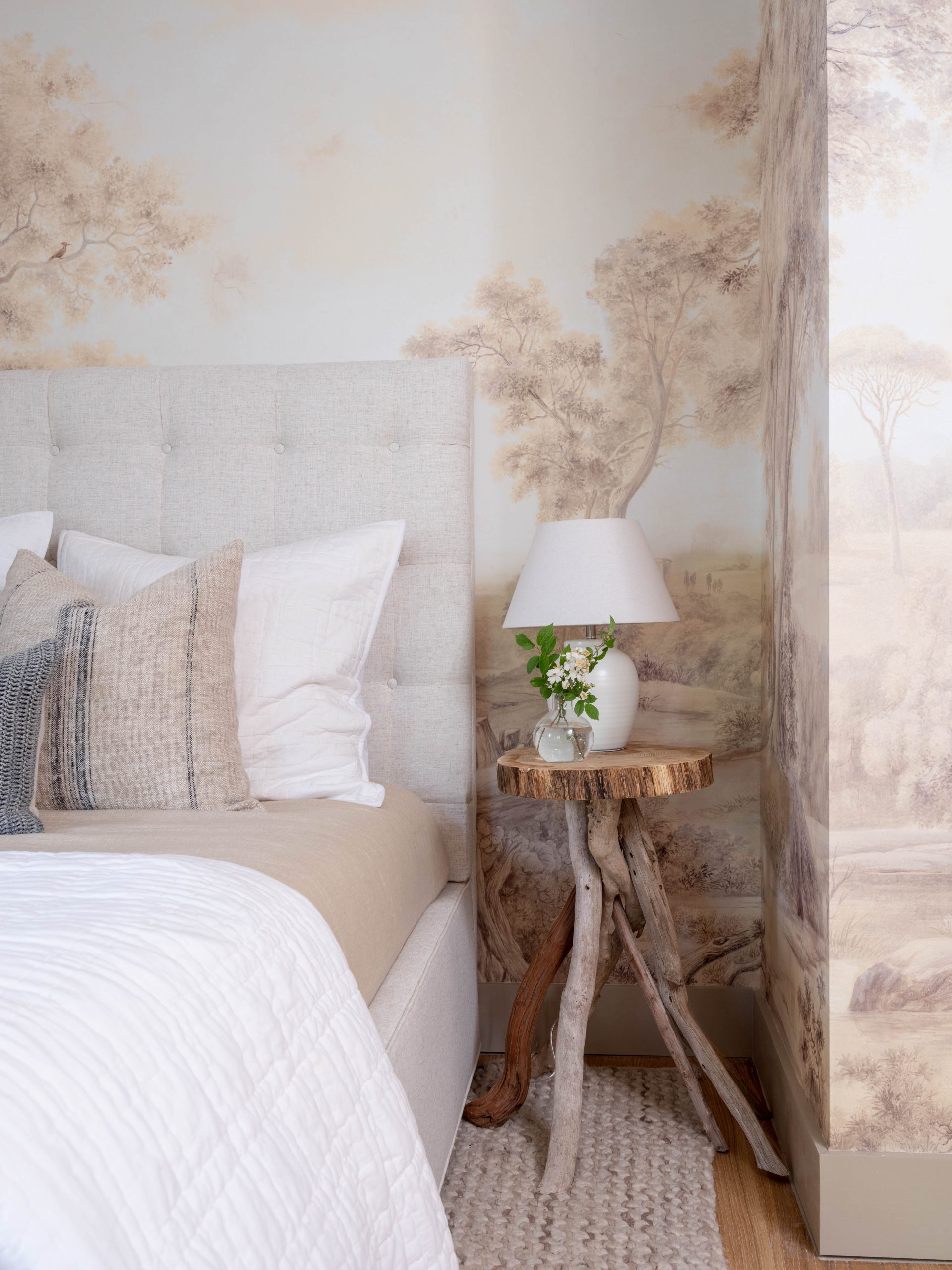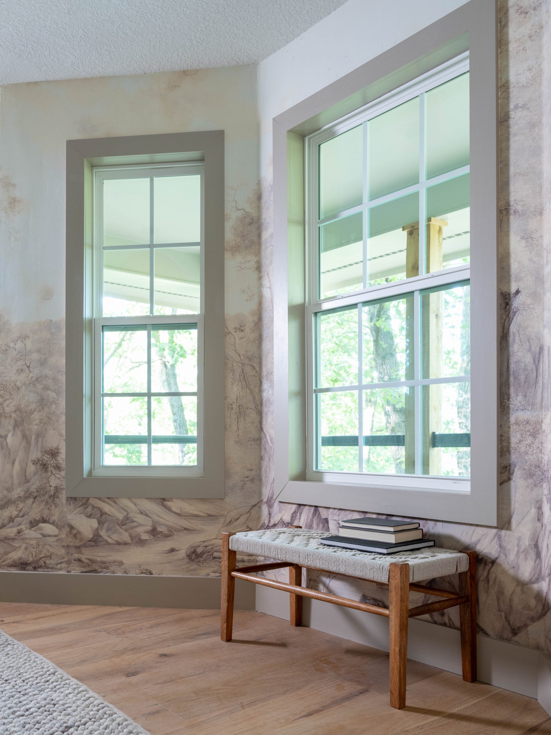 The best view in the house was through a window in the laundry room. That just didn’t seem right. So, when we reconfigured the main floor, we took that space – plus the old dining room – and made it into a bedroom with a bathroom. Originally, the main bedroom was in the basement with no view. For this room, I was able to find a wallpaper print of a soft, serene wooded scene. I enlisted a local artist to hand paint two small woodpeckers onto the trees in soft, muted tones. This was a beautiful way to honor the memory of Allyn’s mother, and I’m so happy she liked it.