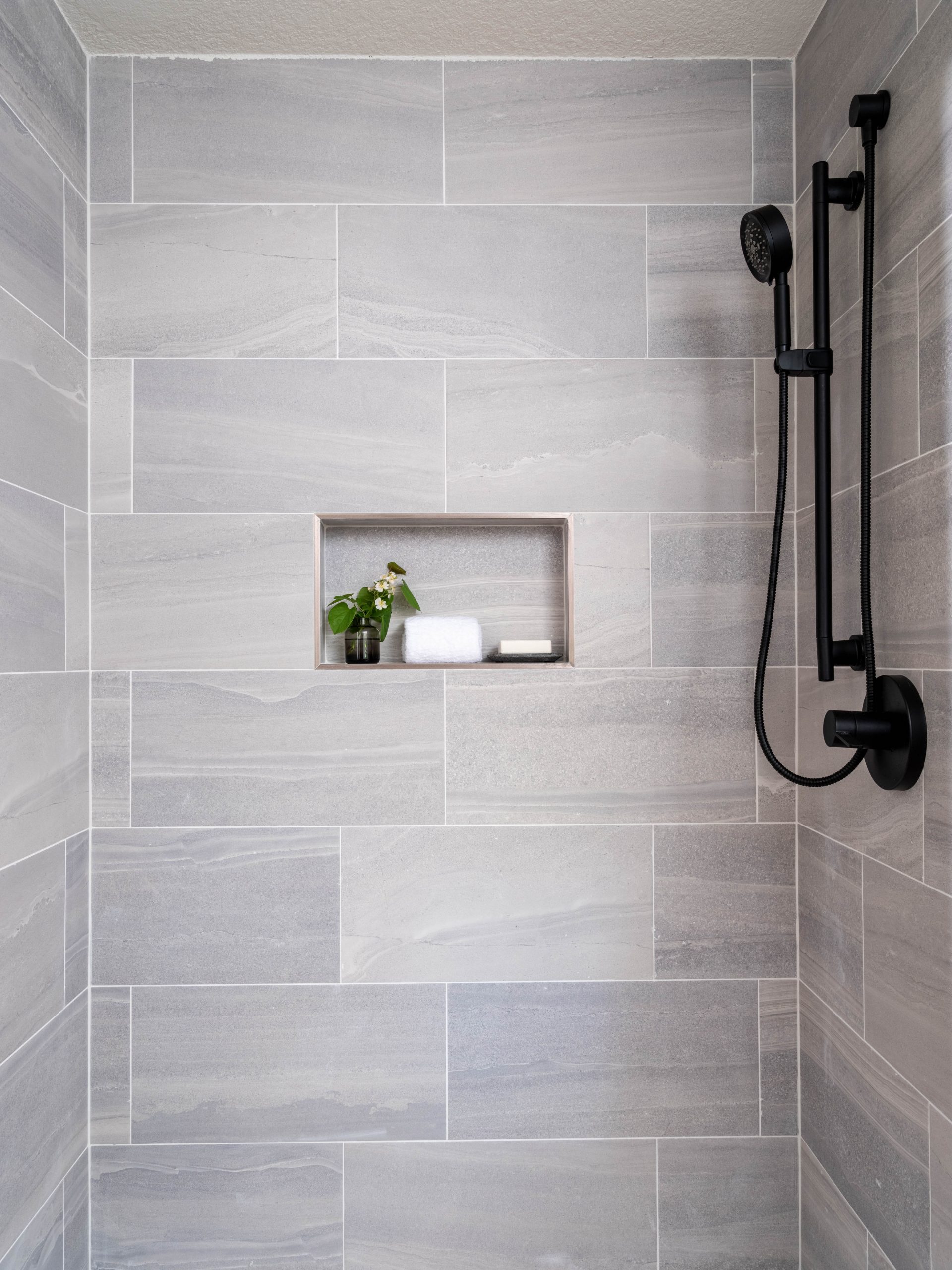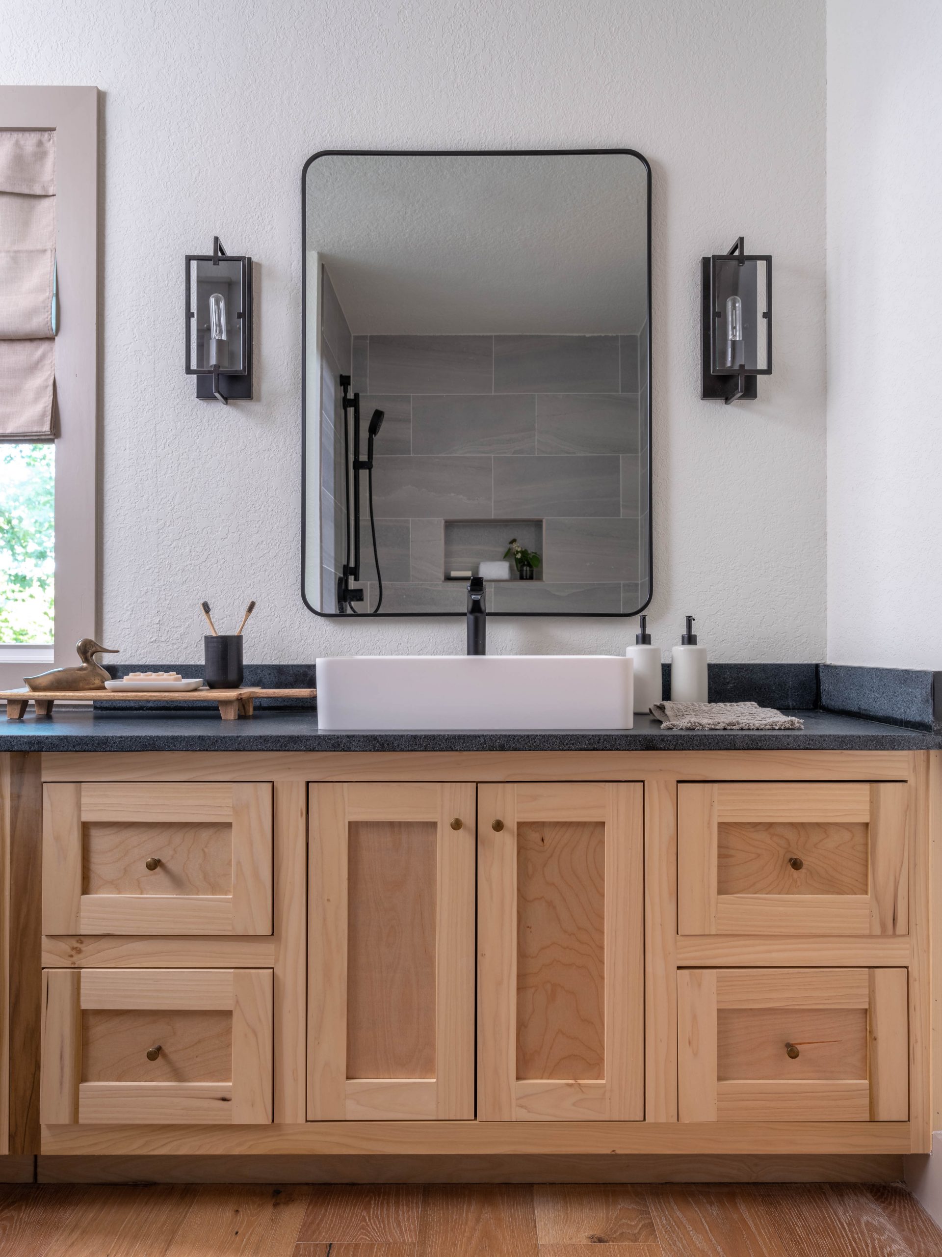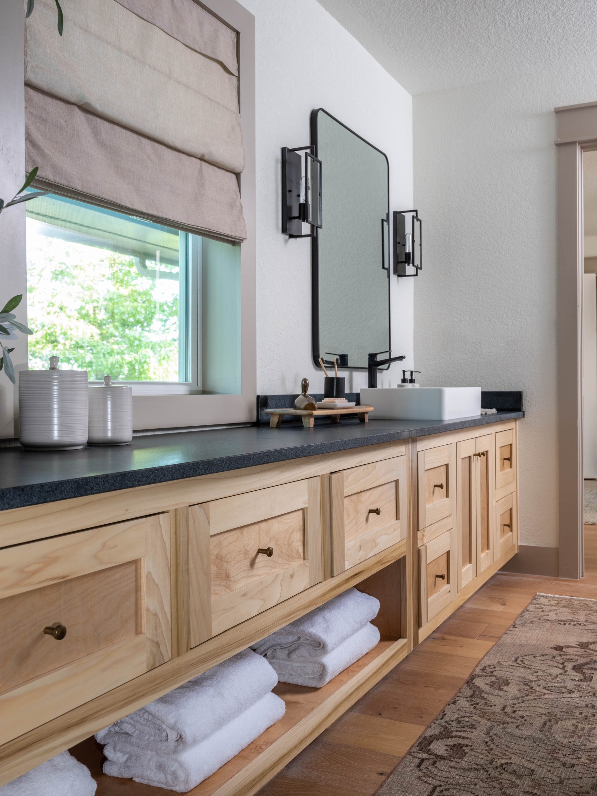 And, now, the main bathroom has the best view in the house. Since this was the part of the house (previously the laundry room) that already had the beautiful view of the lake below, we made sure to keep this window. We added calming water-like tile and kept the cabinetry a natural wood finish.