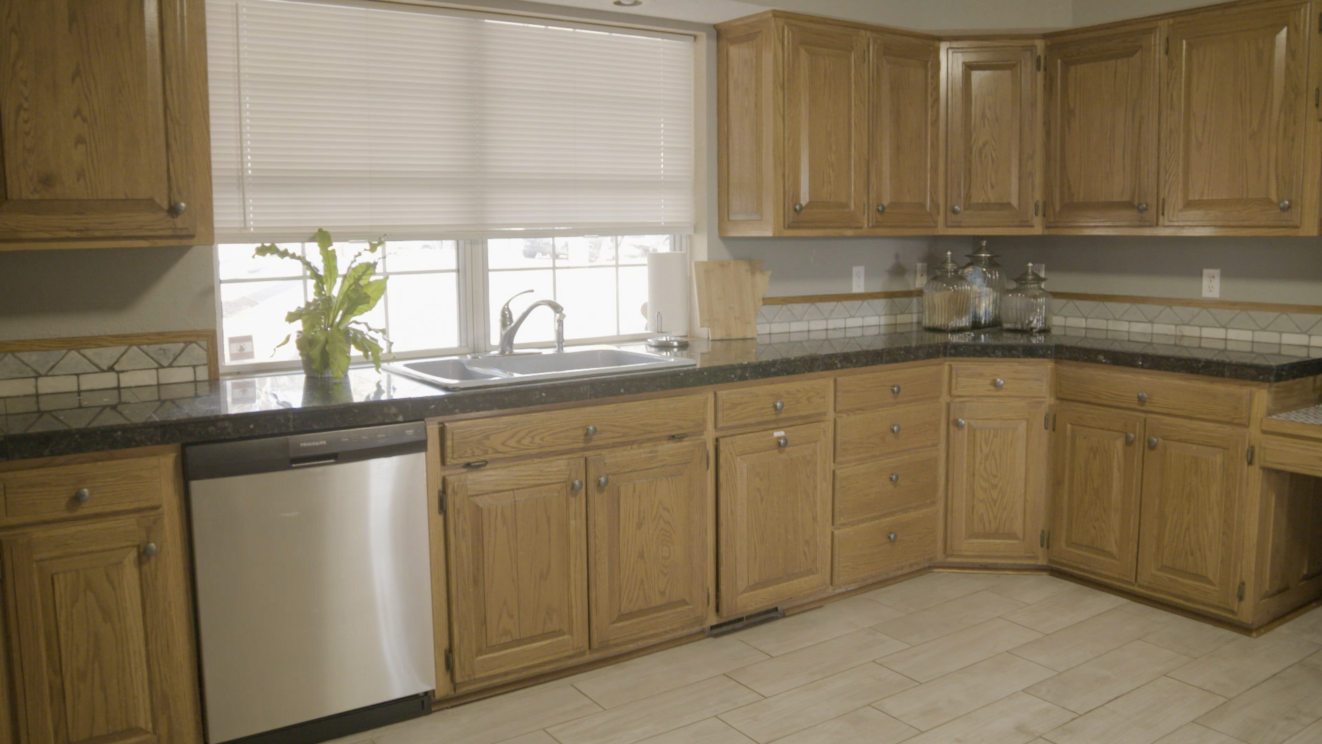 The Ellemans also mentioned they like to cook together as a family. They actually had a pretty good-sized kitchen to start with. Along with updating the kitchen, we wanted to give it some personality. First, we opened up the wall that separated the kitchen from the living room. Then, we gave them new cabinets that extend all the way up to the ceiling for additional storage space. We chose a beautiful dark green color to mimic the trees in the woods and the outdoors in.