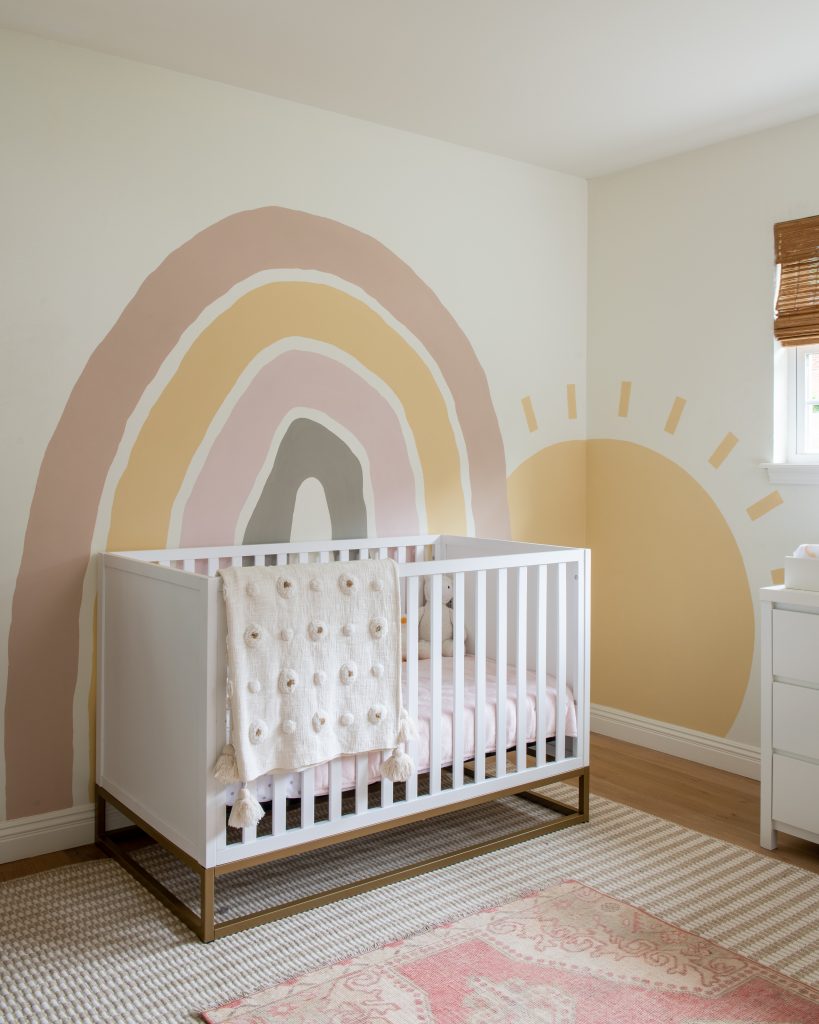 I always love designing a kid’s bedroom or a nursery because they give me a chance to get creative and have some fun. For the Smith nursery, we were able to surprise the couple with the gender of their baby. This meant we had to include some fun shades of pink for their baby girl! To bring soft, pretty colors to this room, I chose muted pastels. The rainbow on the wall represents a promise, like the one given by God to Noah. This baby girl embodies what Aaron and Brook have waited and longed for, in spite of Brook’s health challenges and working toward a long-term home. My hope for this nursery was for it to be a visual symbol of the promise that joy always returns, even after suffering. The soft colors helped to create the perfect environment to welcome their new baby girl.