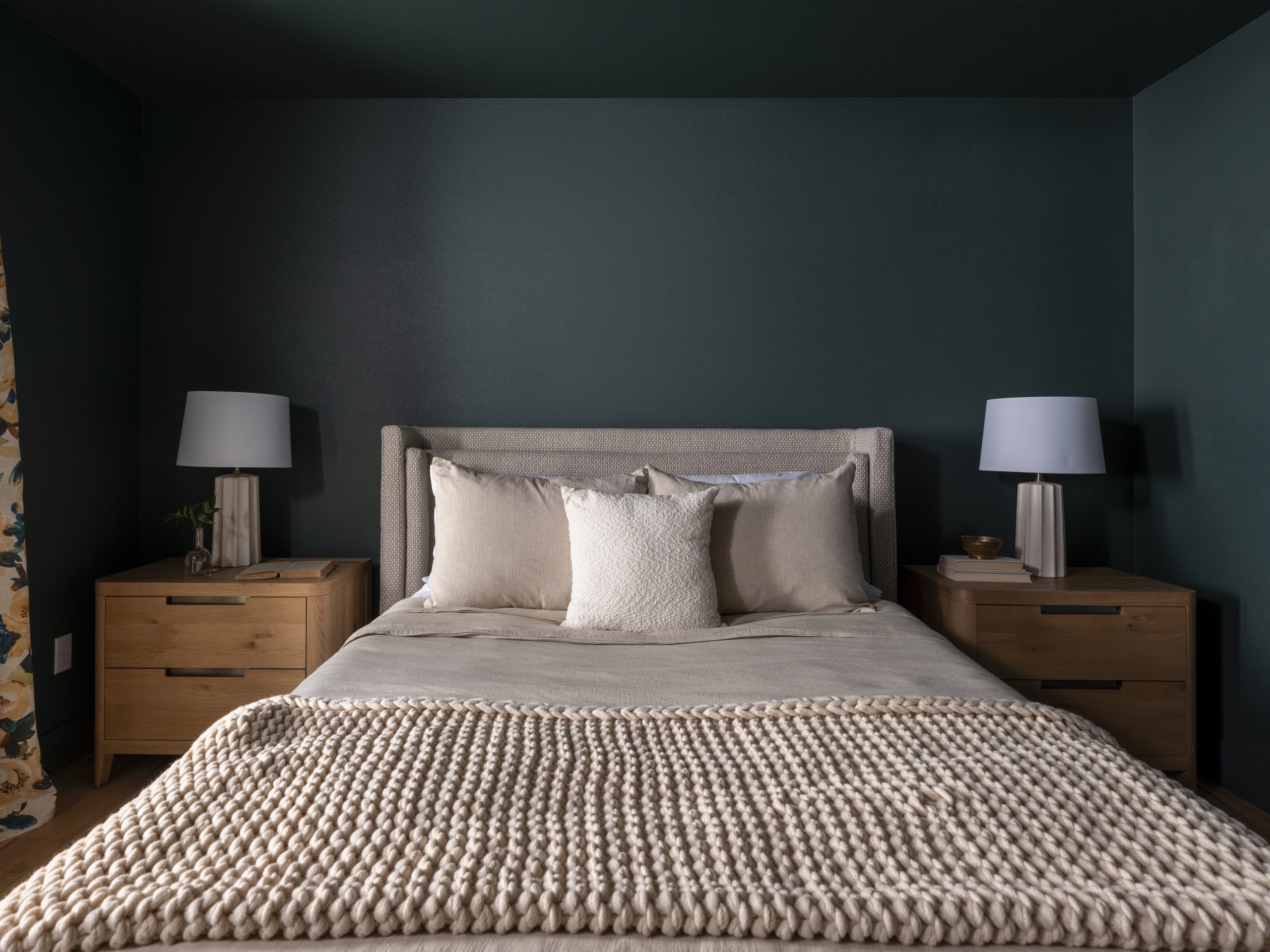 This used to be a front entryway that walked straight towards a hall closet, not a great welcome. Since we relocated the front door, this space no longer needed to function as an entryway—so we transformed it into the perfect bedroom. To create a cohesive flow, we carried the same warm wood flooring from the rest of the house into this room. Then, we went bold with the walls and ceiling, painting them a deep, rich green that makes the space feel cozy and inviting.