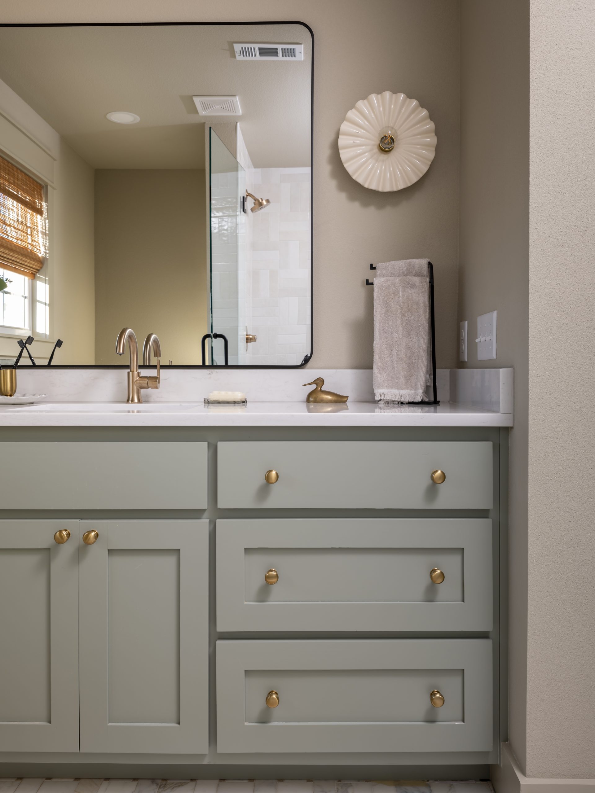 To soften the look, we added a gold faucet, which brings just the right amount of warmth. The vanity, with its soft, feminine color, adds a lovely touch of charm. And the lighting? A little bit of whimsy that makes the whole space feel inviting.