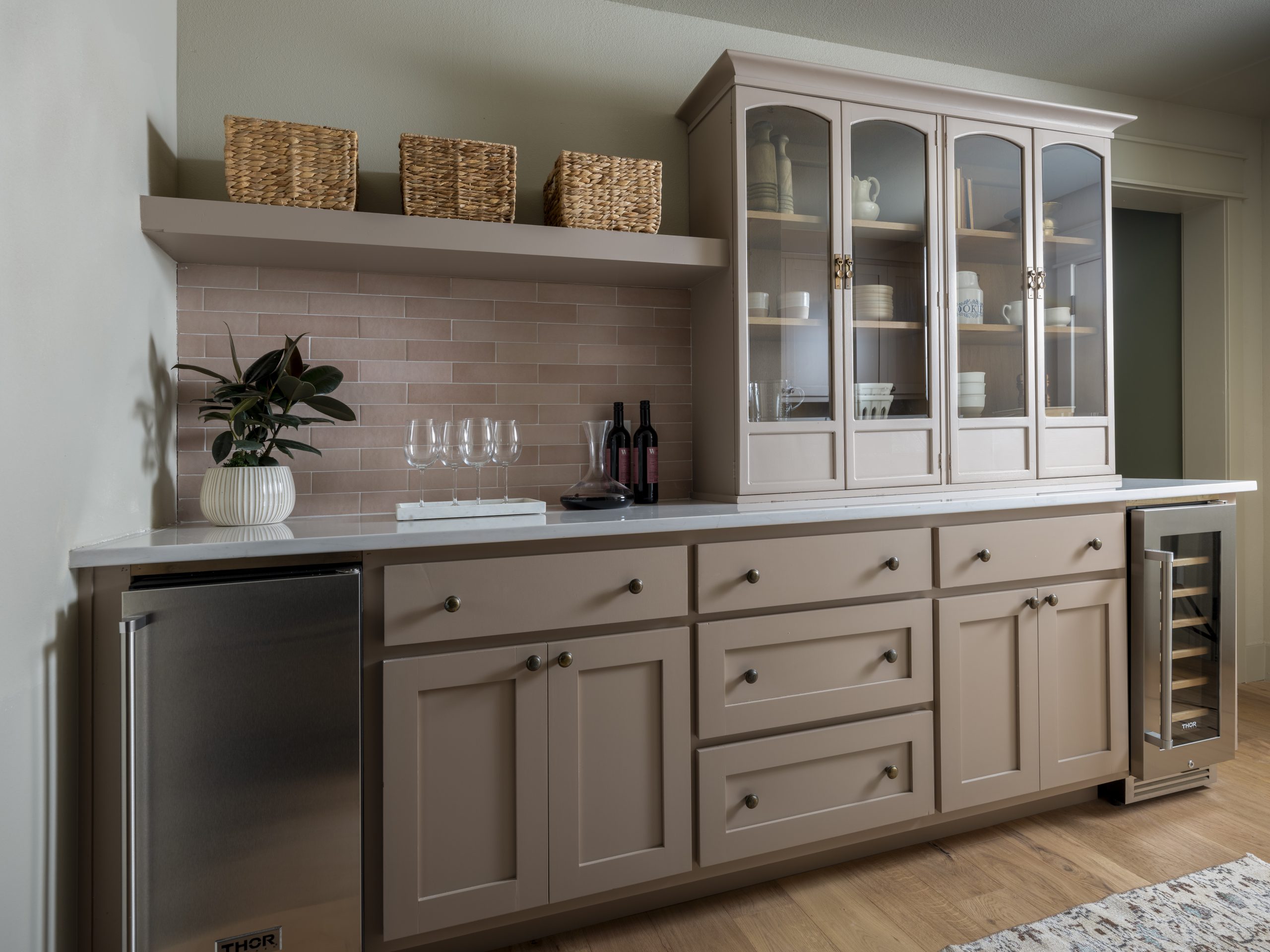 One of the biggest changes was removing that extra door in the kitchen, which instantly opened up the space and gave us more room for cabinetry. We also pushed the wall further out by three feet—just enough to add something really special: a butler’s pantry with a hidden entrance. Inside, we created a little drop zone, perfect for tucking away everyday essentials. One of my favorite details here is the antique cabinet we found at one of my go-to vintage shops. We painted the exterior to blend in with the rest of the cabinetry and added floating shelves beside it for extra storage and display.