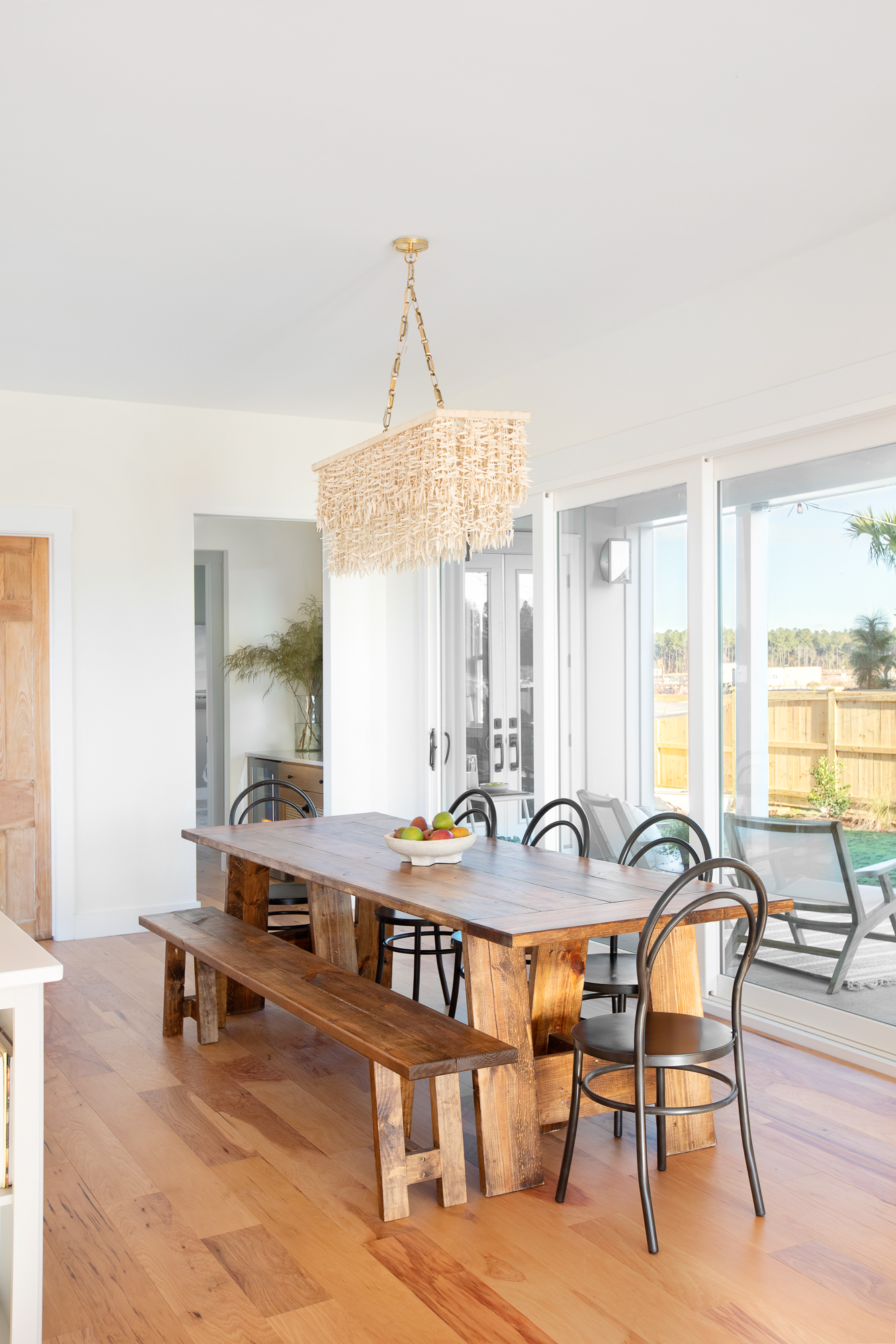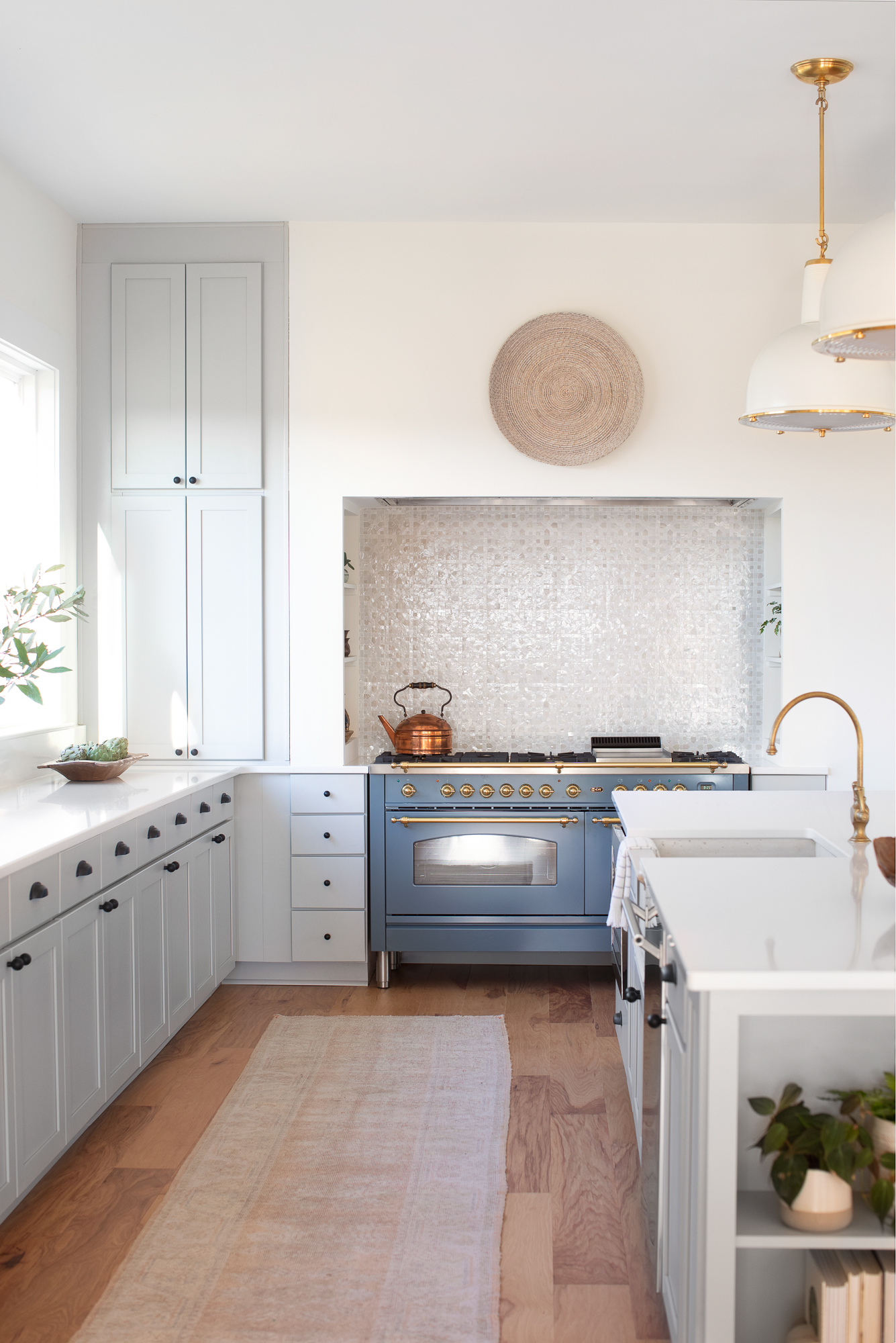 I chose all of my favorite artisan-made items to give this kitchen character. The brass faucet and stone sink feel like antique pieces and are crafted by hand in a 135 year old church building in Vermont, the mosaic tile backsplash is handcrafted in Morocco, the chandelier of tiered coco shells was meticulously made by hand, and the dining table was built by Dave with the help of our sons in the yard of our AirBnB in the evenings after we worked at the house all day. All of these elements create a warm, collected, and timeless kitchen.